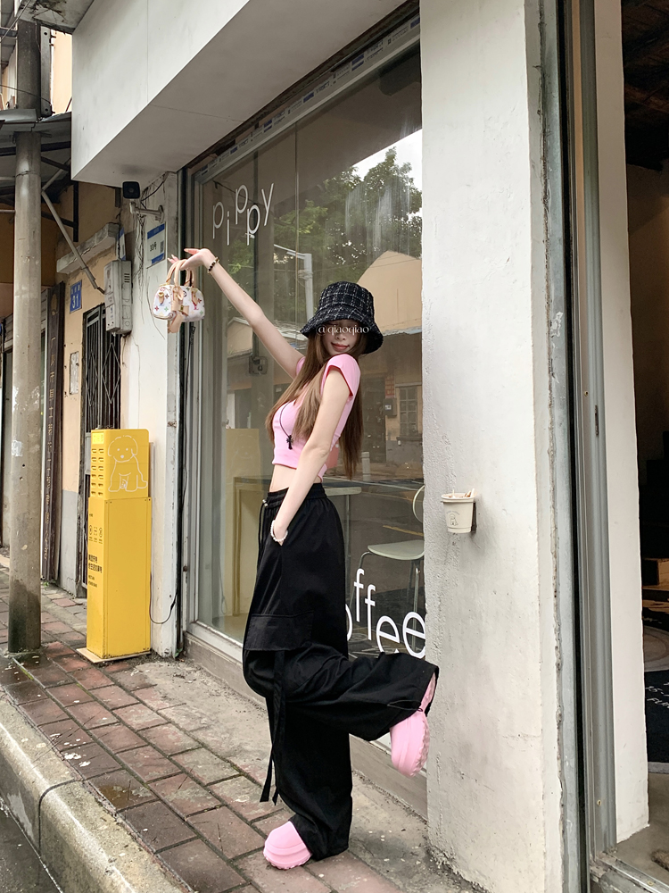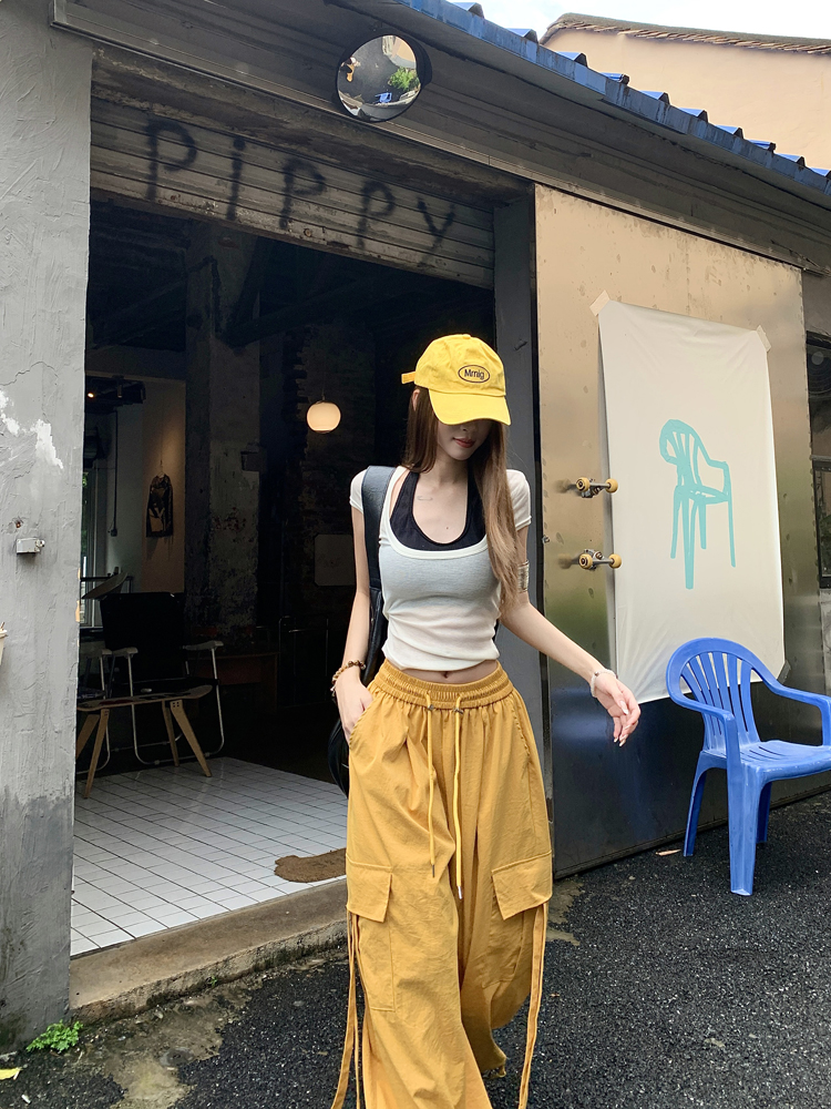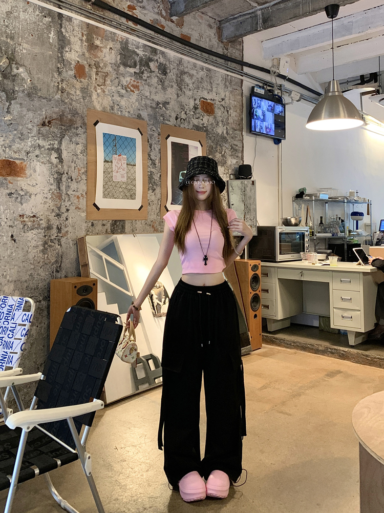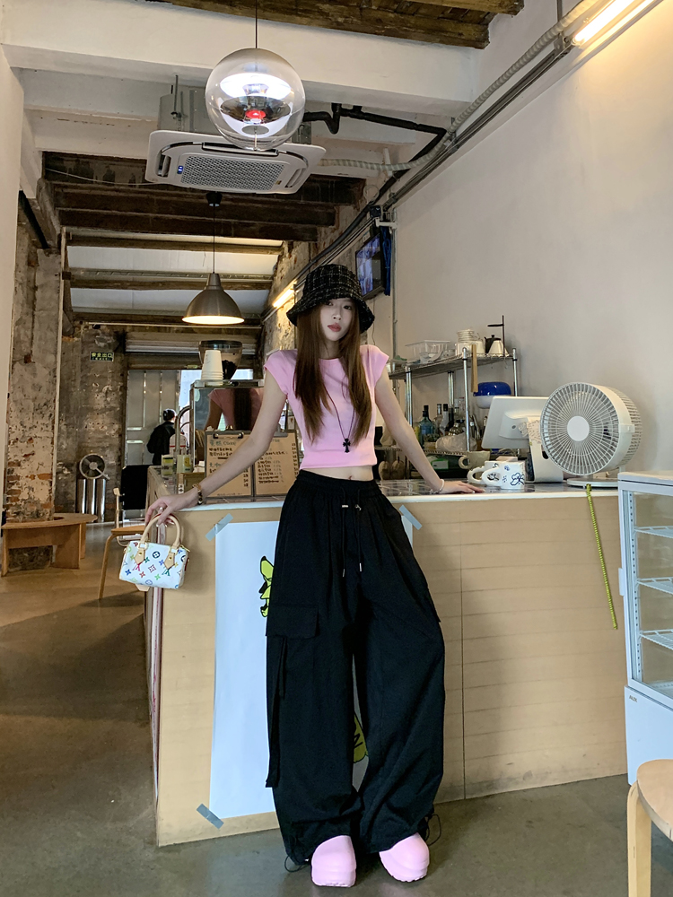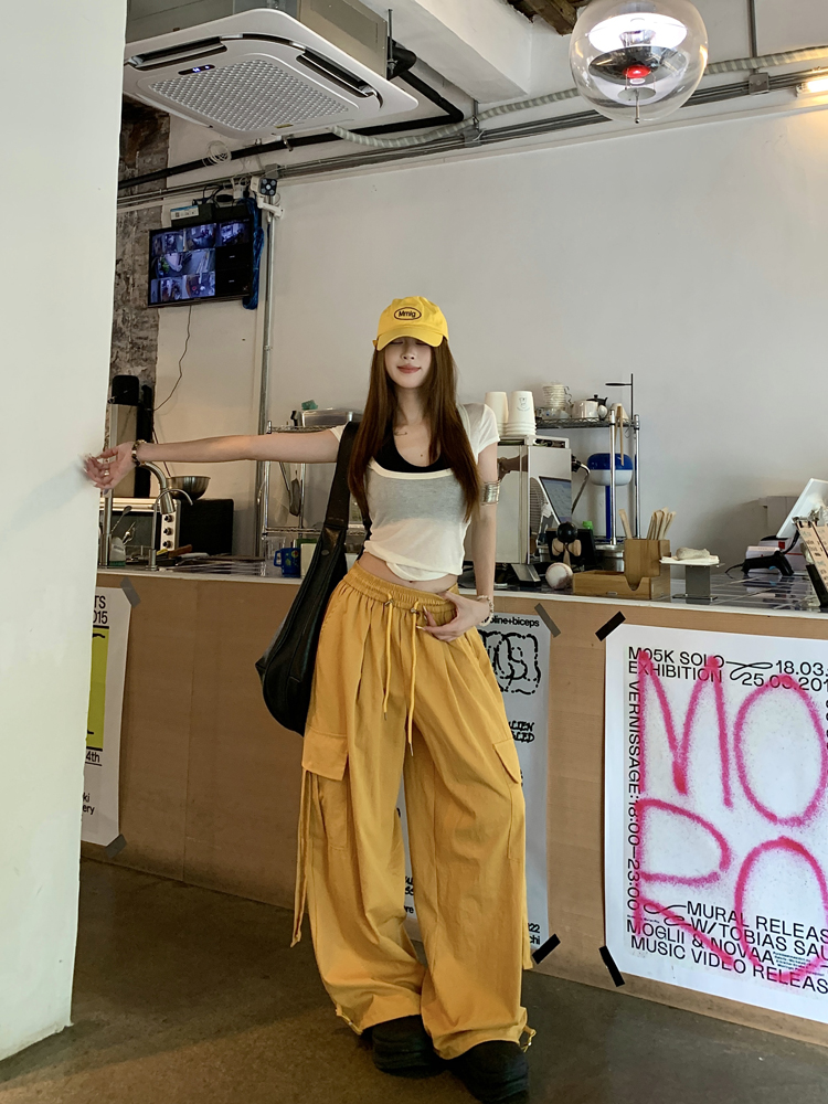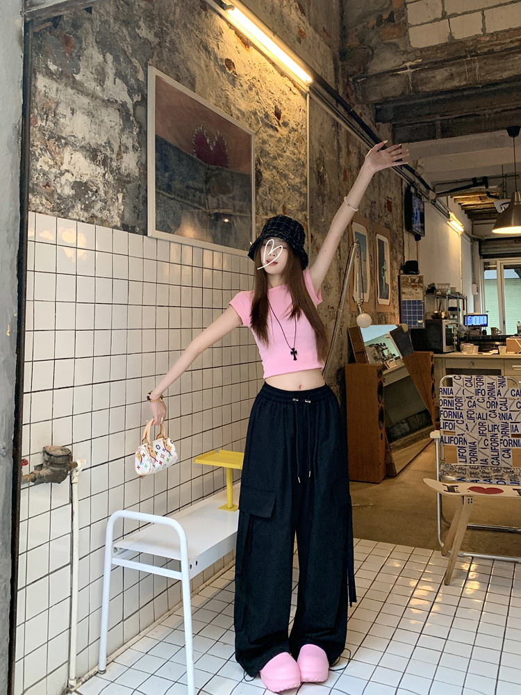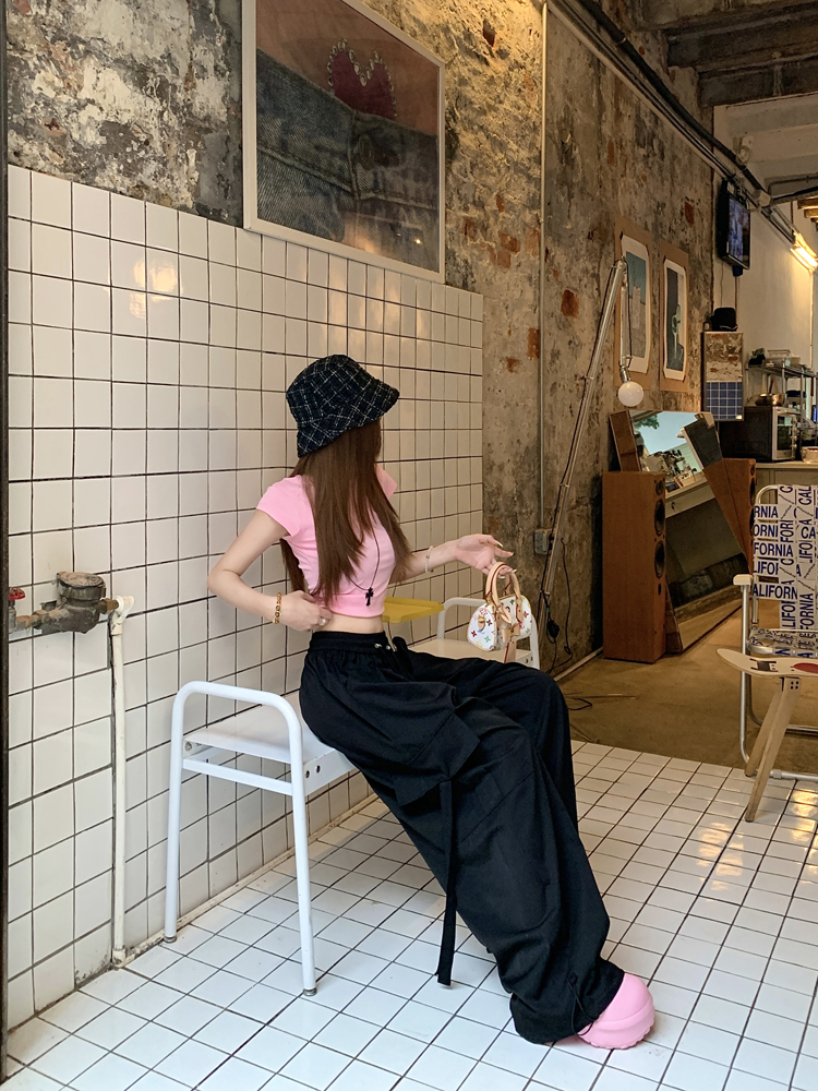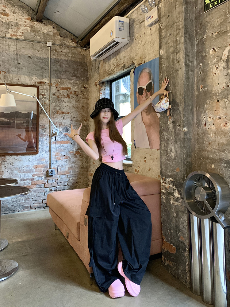 실사 느긋한 센스 캐주얼 바지 여성 여름 단색 허리밴드 바지 슬림해 보이는 와이드 레그 팬츠 루즈핏 도루 센스 바닥 청소 바지