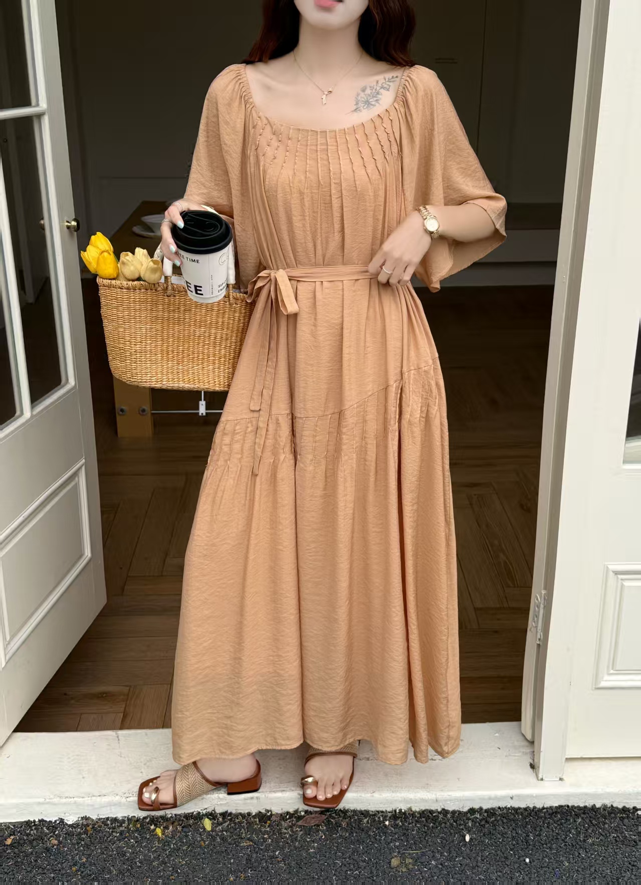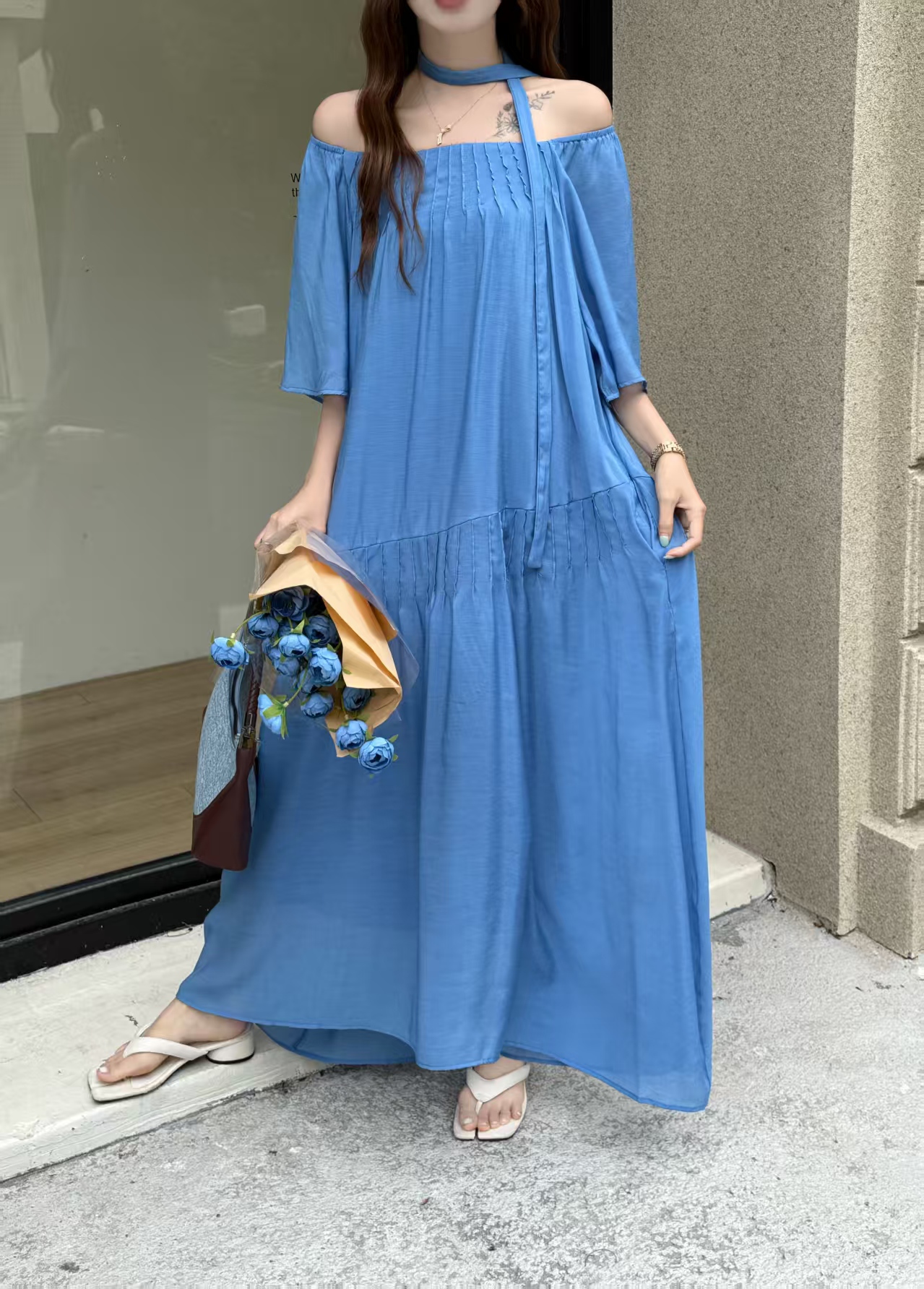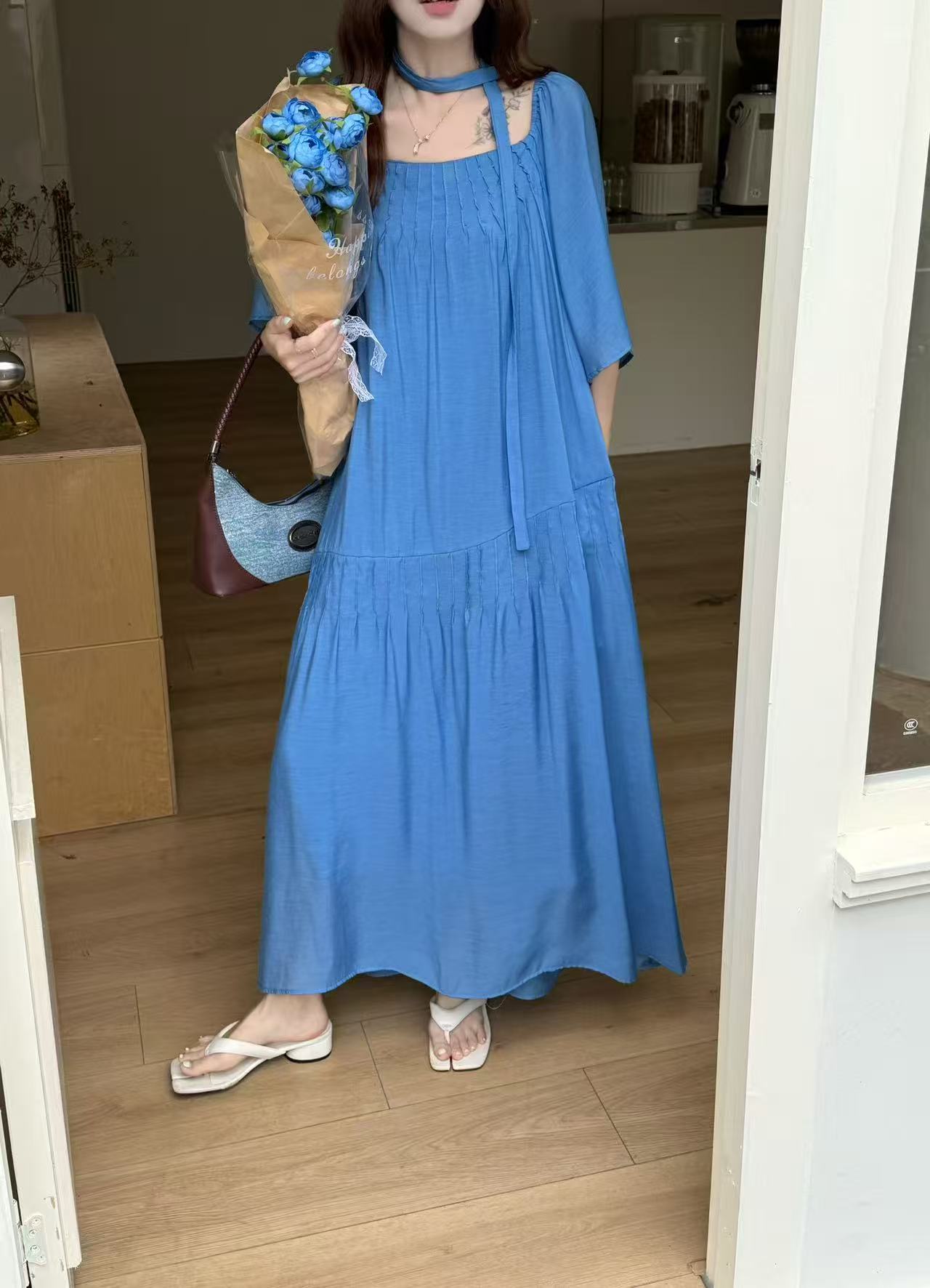 2026 여름 섹션 아메리칸 워크웨어 데님 멜빵 여성 드레스 루즈핏 캐주얼 주름 슬립 드레스 롱 스커트