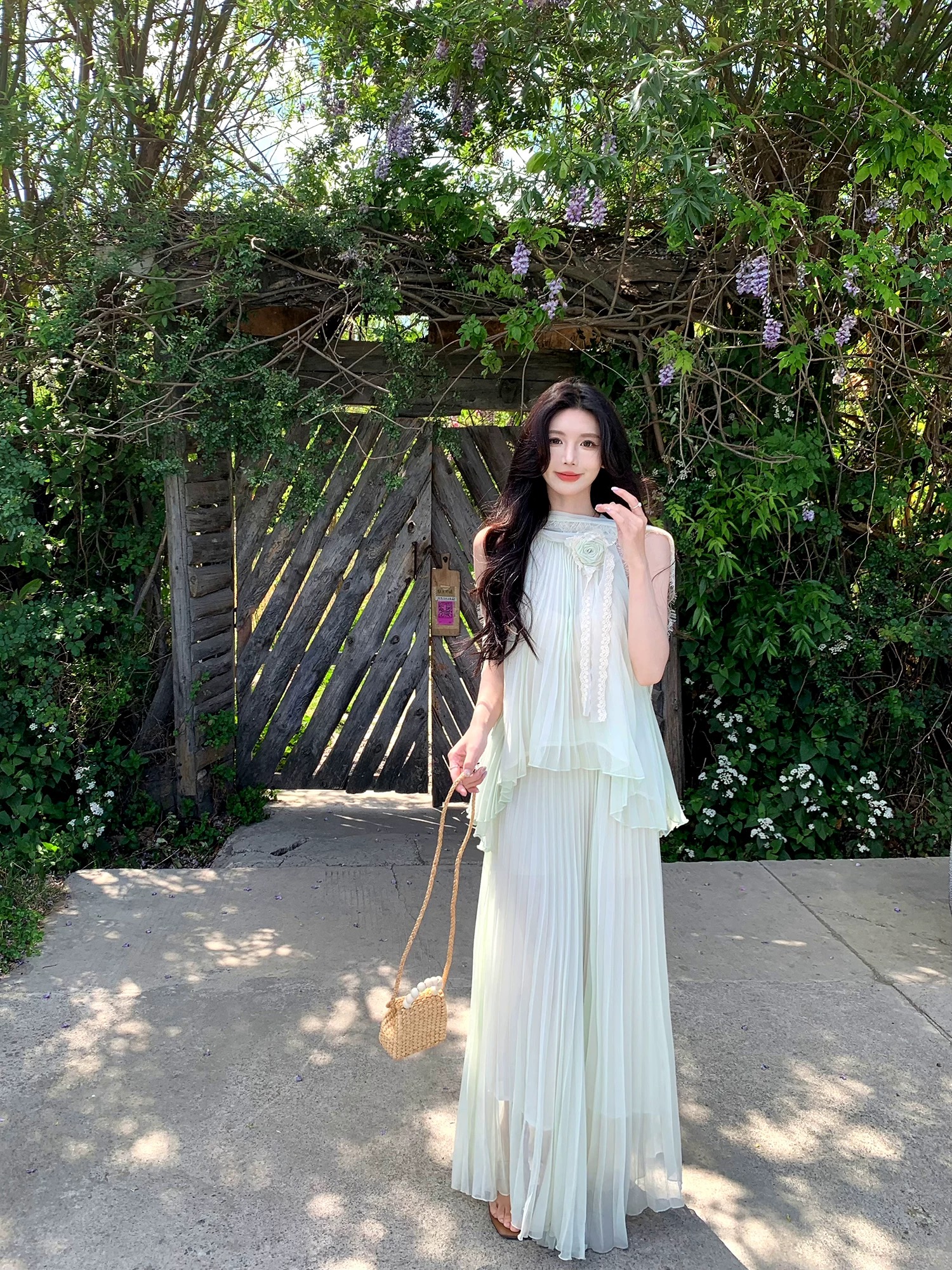 남자 여름 회색 조정 품격 흔들다 칼라 민소매 허리 수축 맨위 슬림해 보이는 도루 센스 넓은 다리 길이 바지 세트