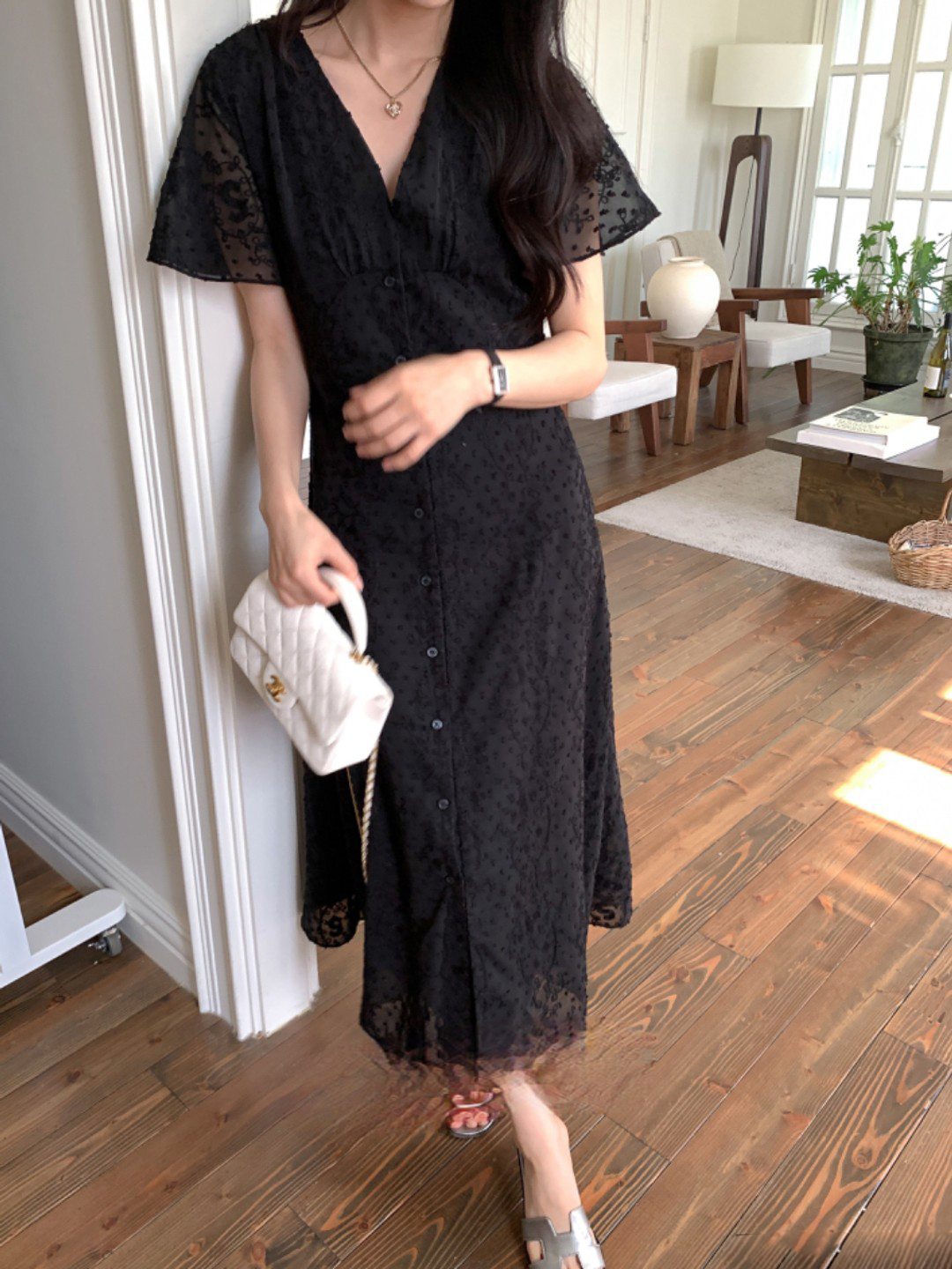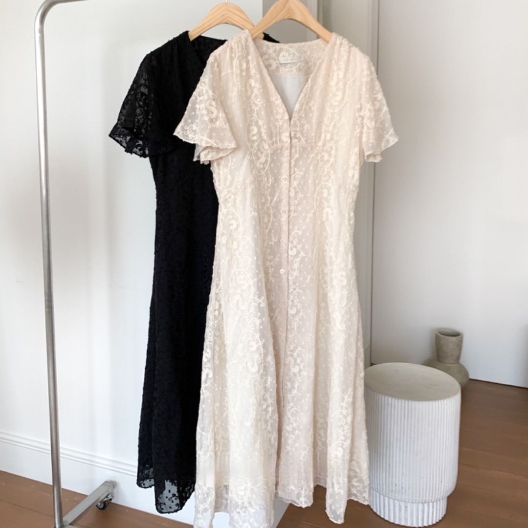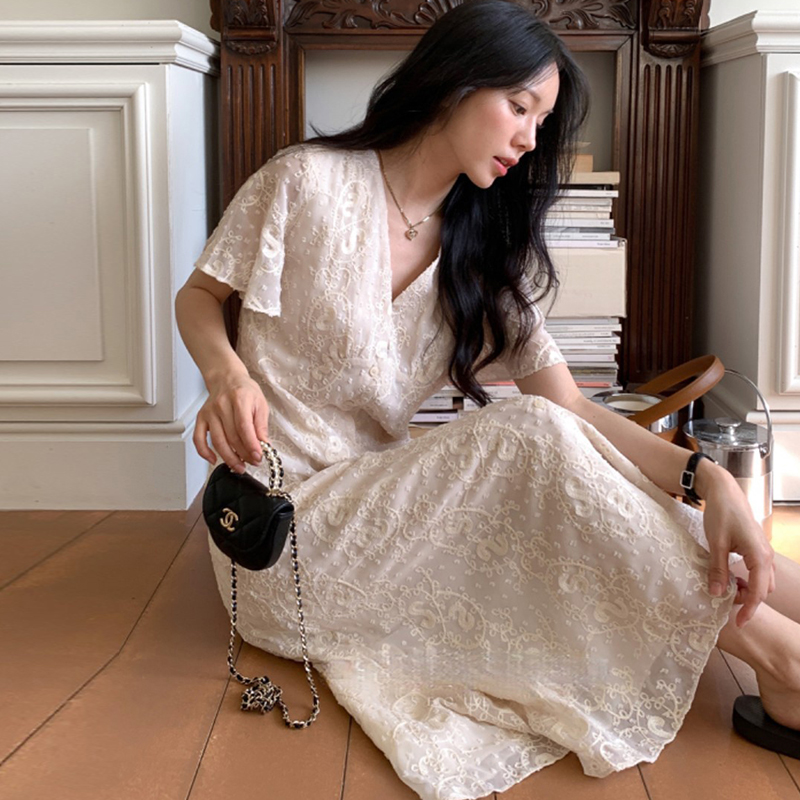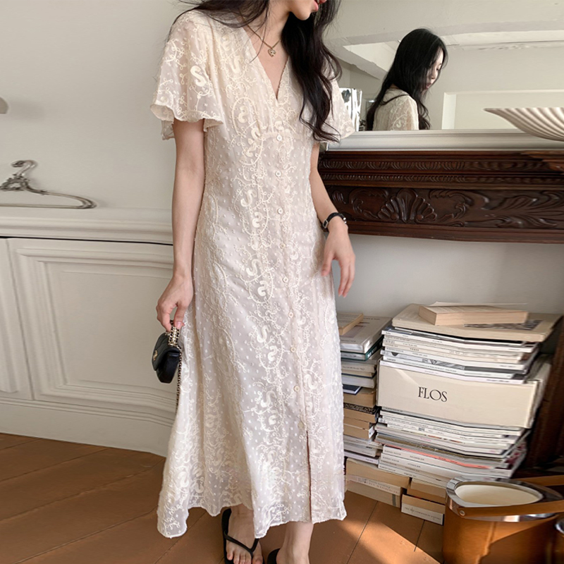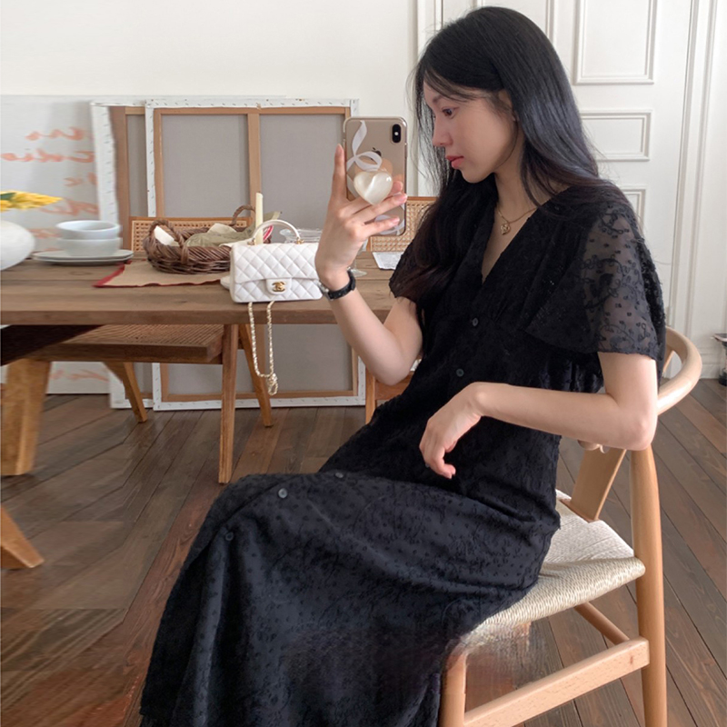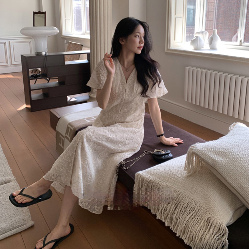 크기 있음 업데이트 한국 chic 프랑스식 레이스 디자인 센스 V넥 슬림해 보이는 싱글 줄 버튼 드레스