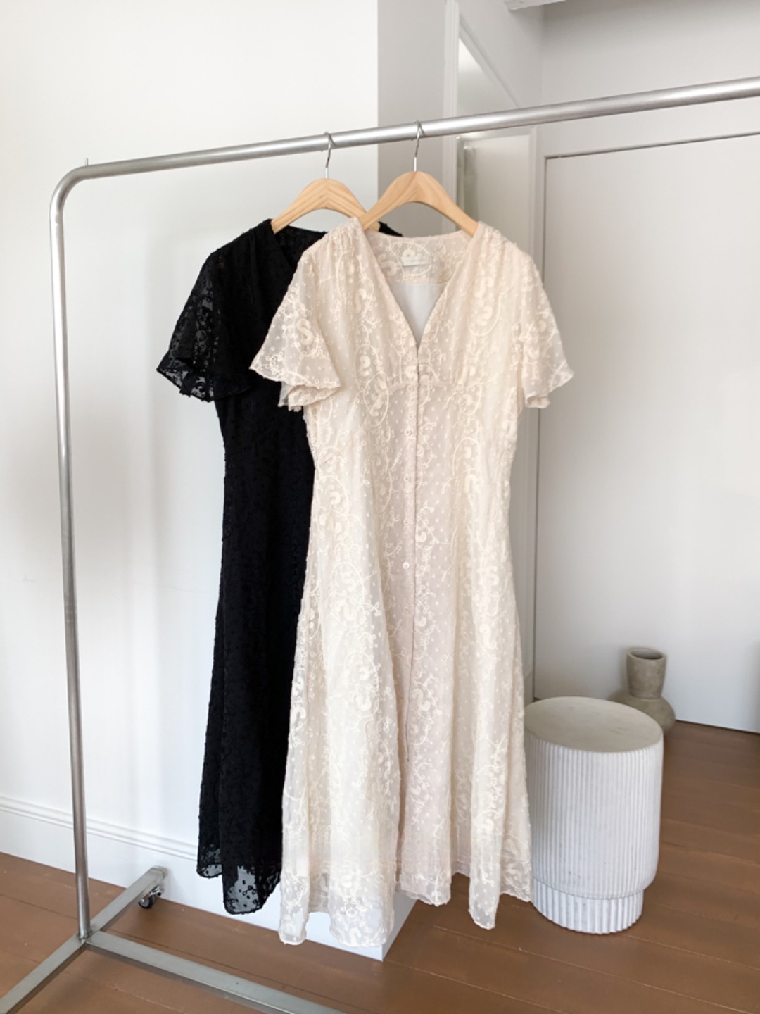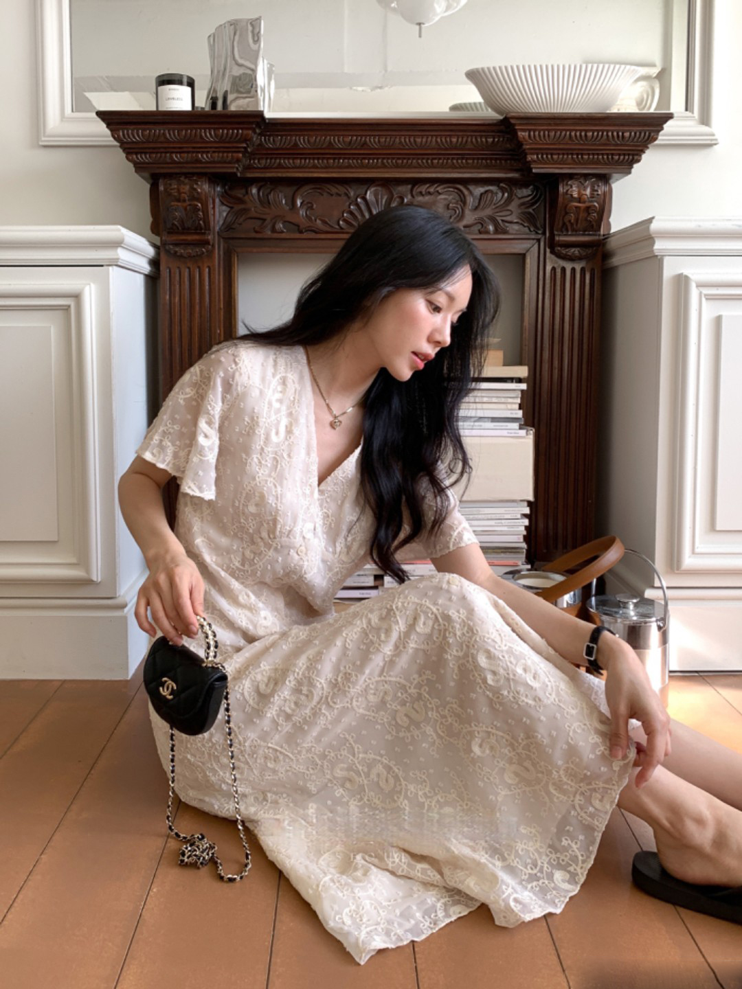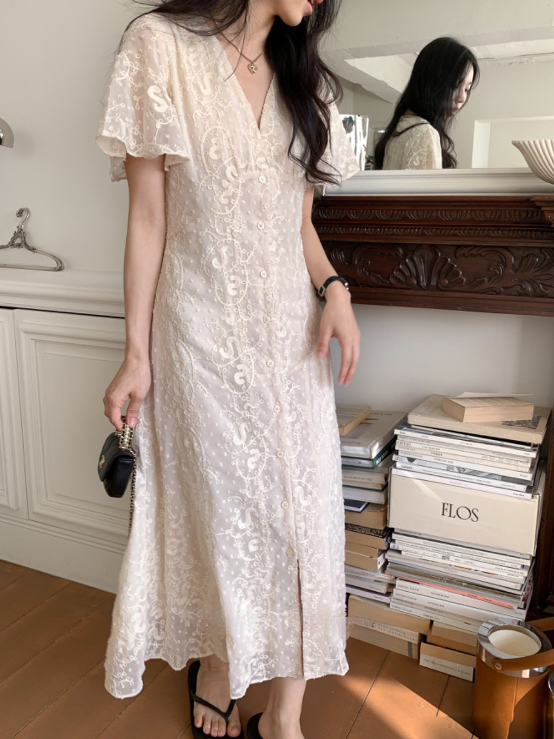 크기 있음 업데이트 한국 chic 프랑스식 레이스 디자인 센스 V넥 슬림해 보이는 싱글 줄 버튼 드레스