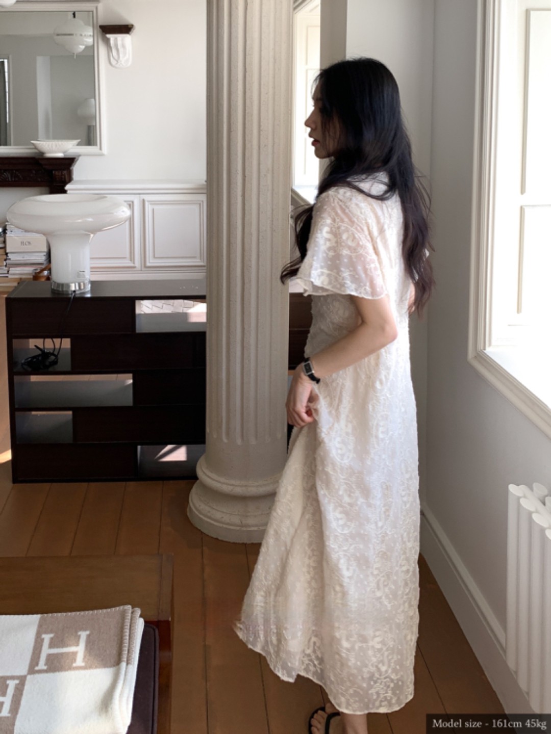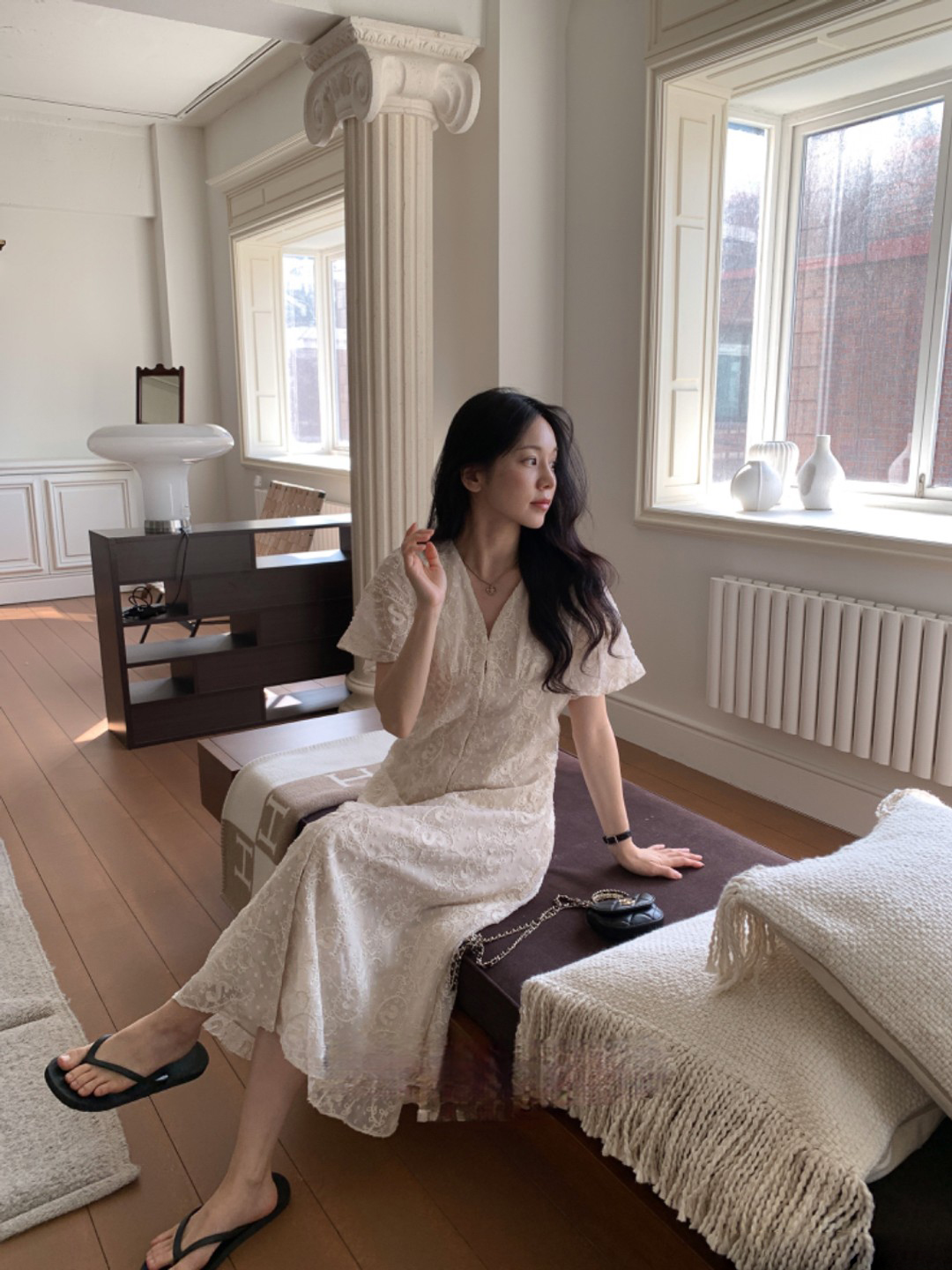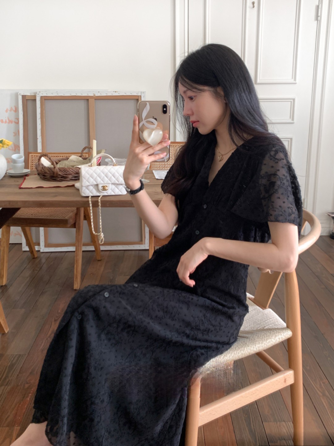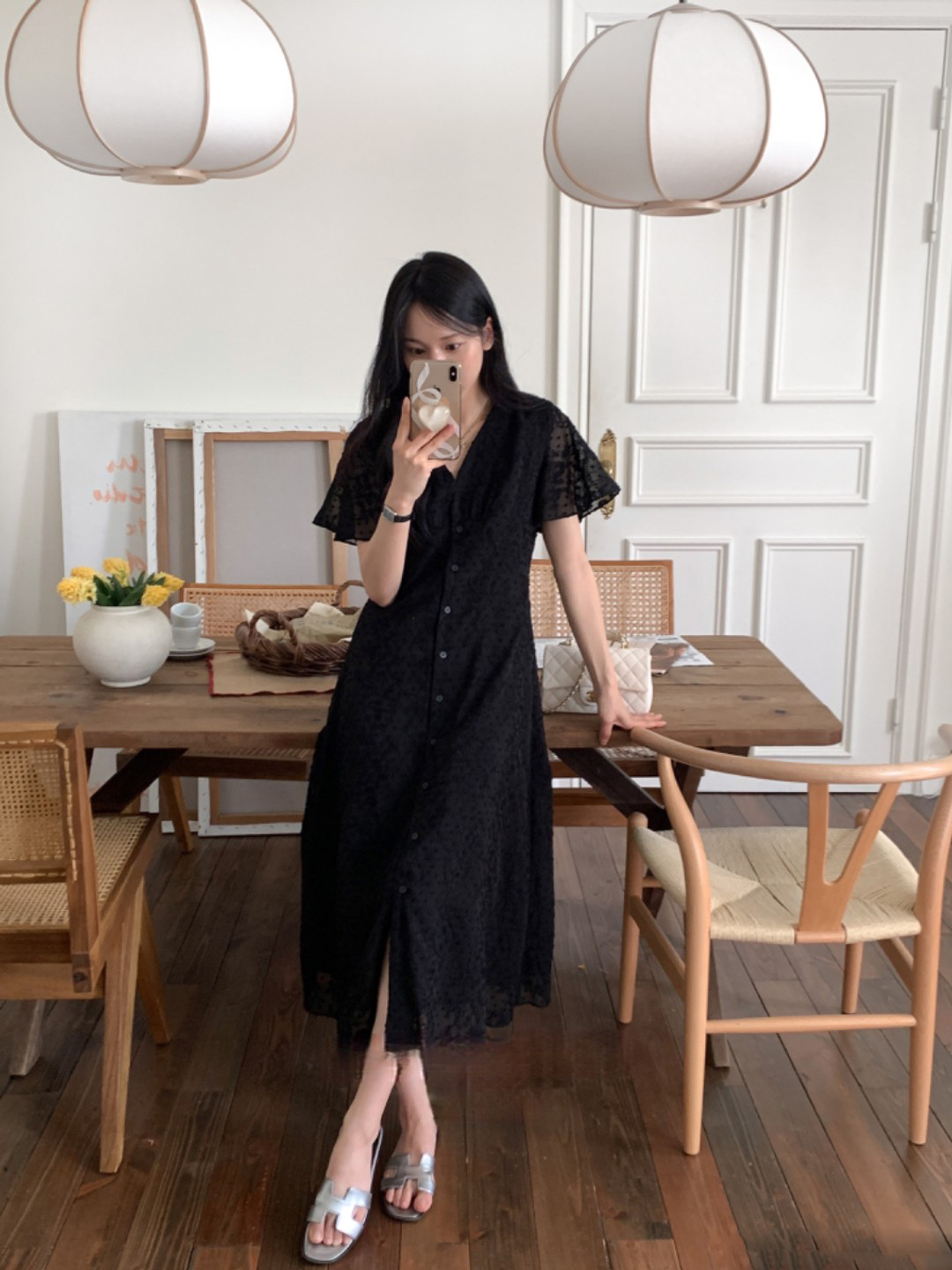 크기 있음 업데이트 한국 chic 프랑스식 레이스 디자인 센스 V넥 슬림해 보이는 싱글 줄 버튼 드레스