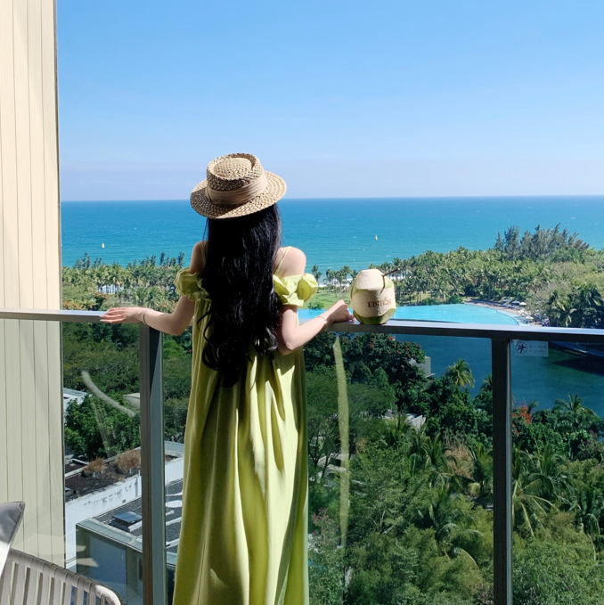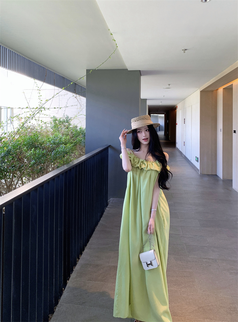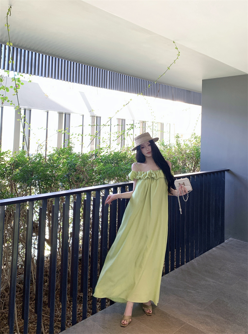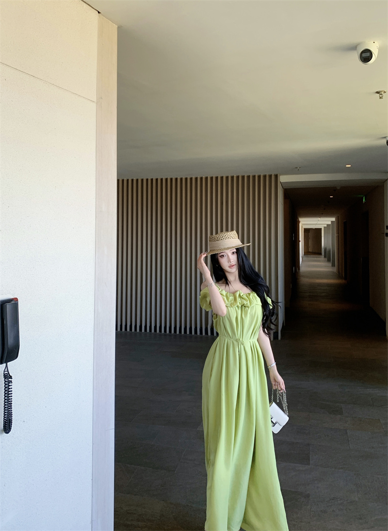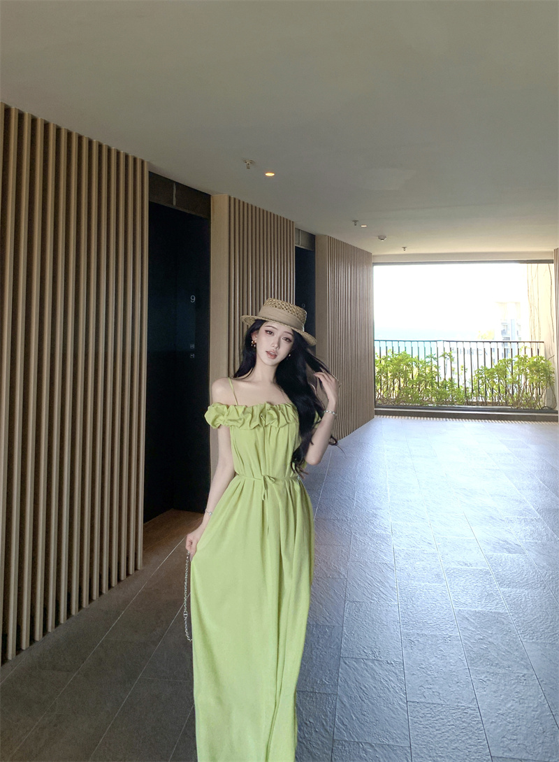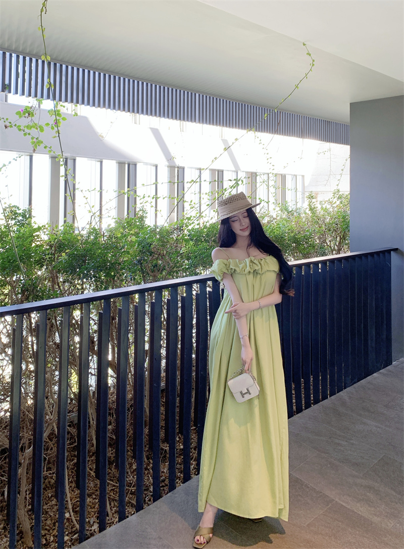 실사 프랑스식 민소매 레트로 V넥 행침 목 빨간색 점프 슈트 치마 계절 아름다운 해변가 휴가 허리 수축 한 마디 롱 스커트