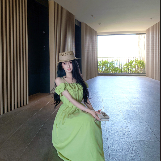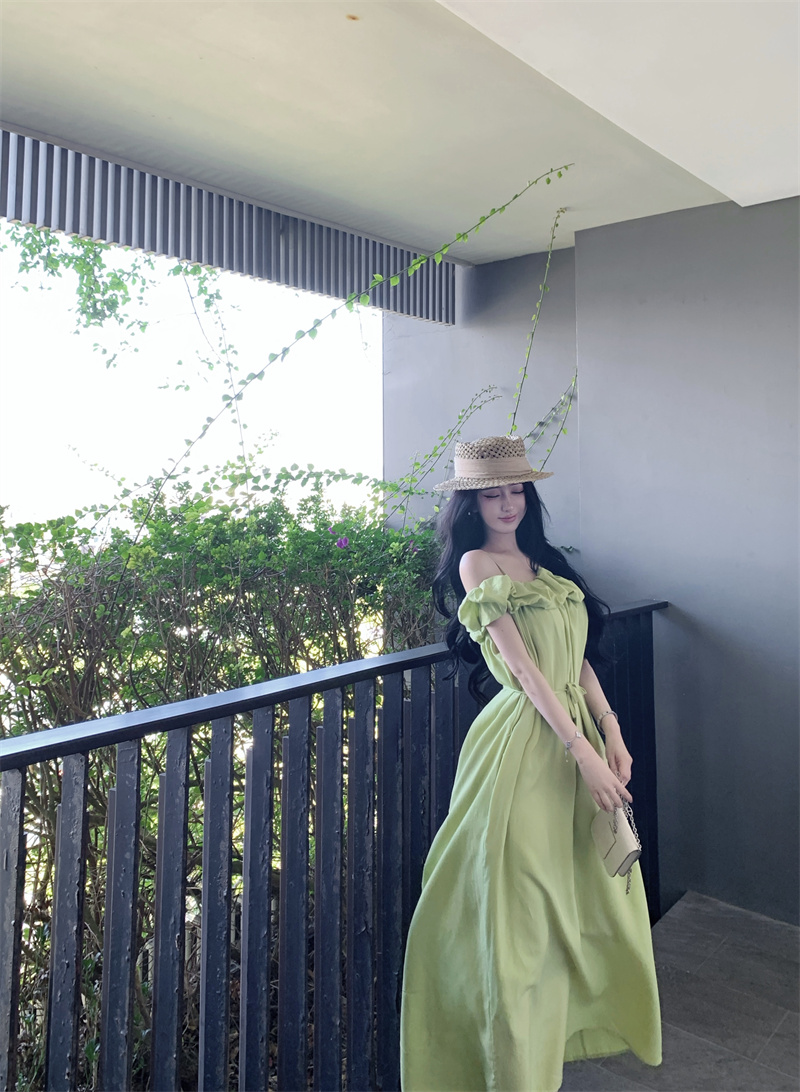 실사 높음 세트 프랑스식 디자인 깊은 V 넥 백리스 허리 수축 스트랩 슬림해 보이는 퍼프 스커트 작은 키 휴가 바람 미니 스커트