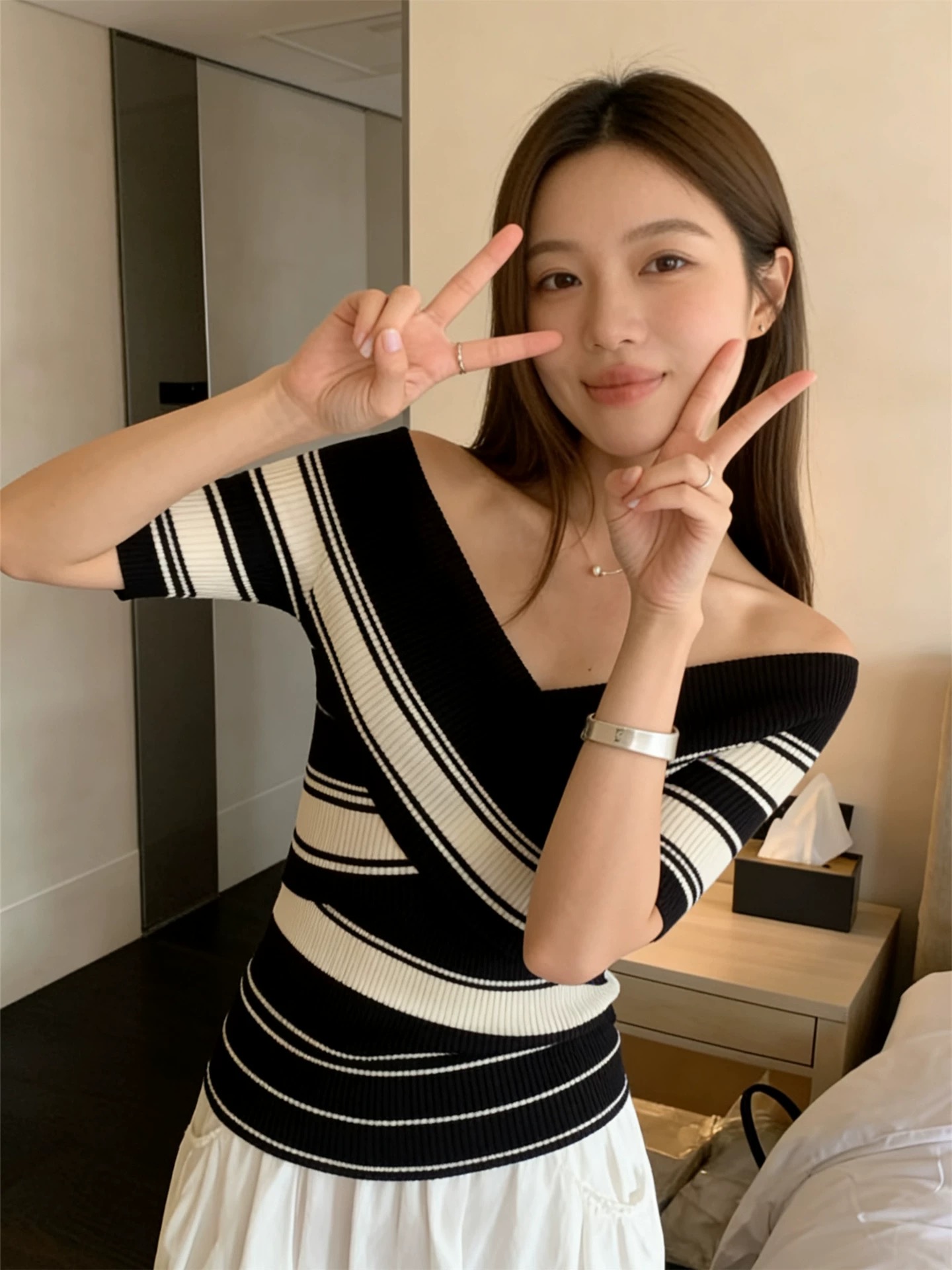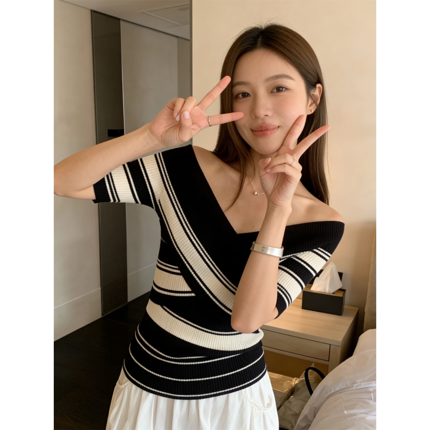 있음 도착 한국 스타일 비스듬한 어깨 니트 스웨터 여성 2026 여름 몸매 가꾸기 슬림해 보이는 반팔 맨위 Chic
