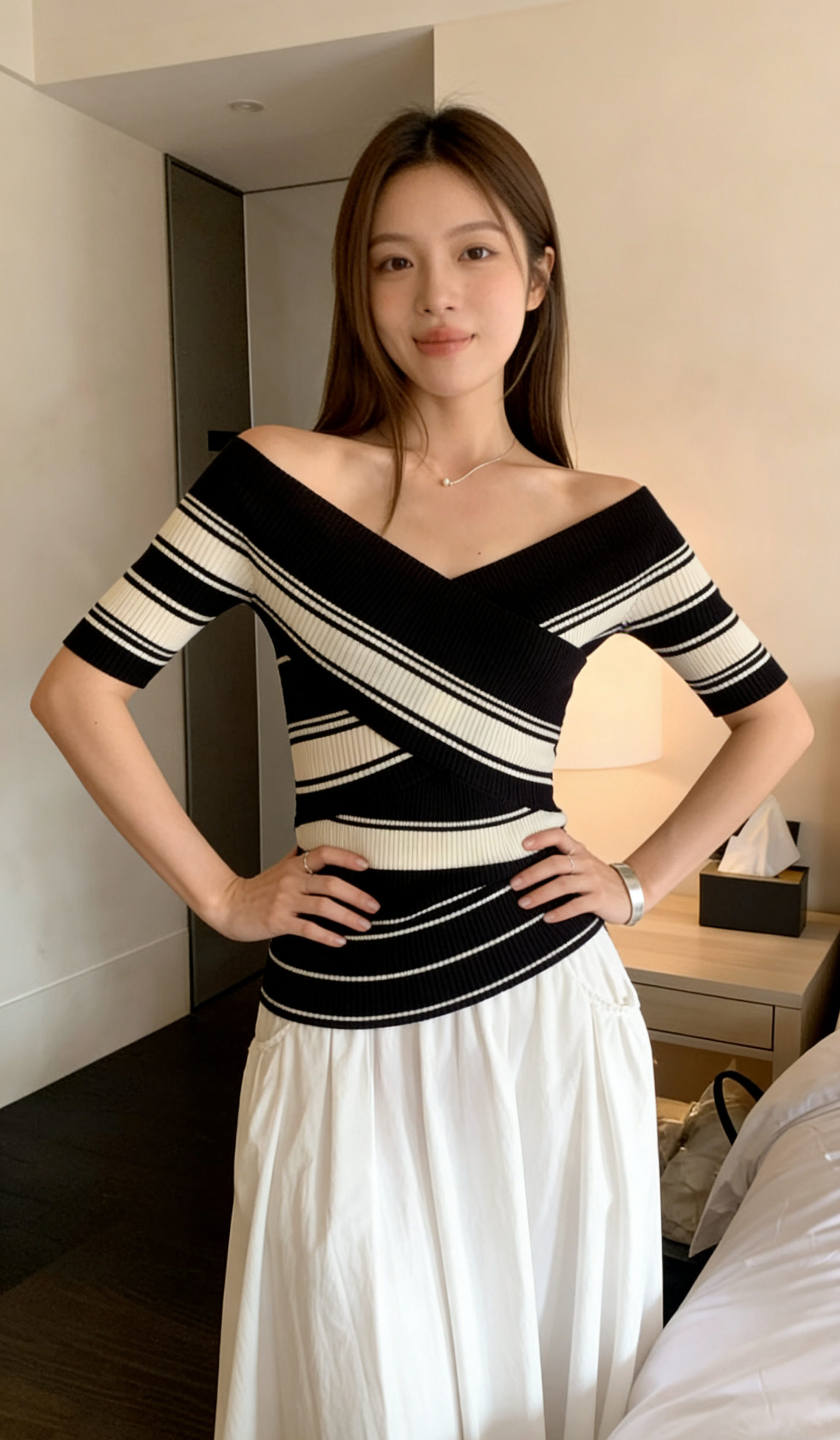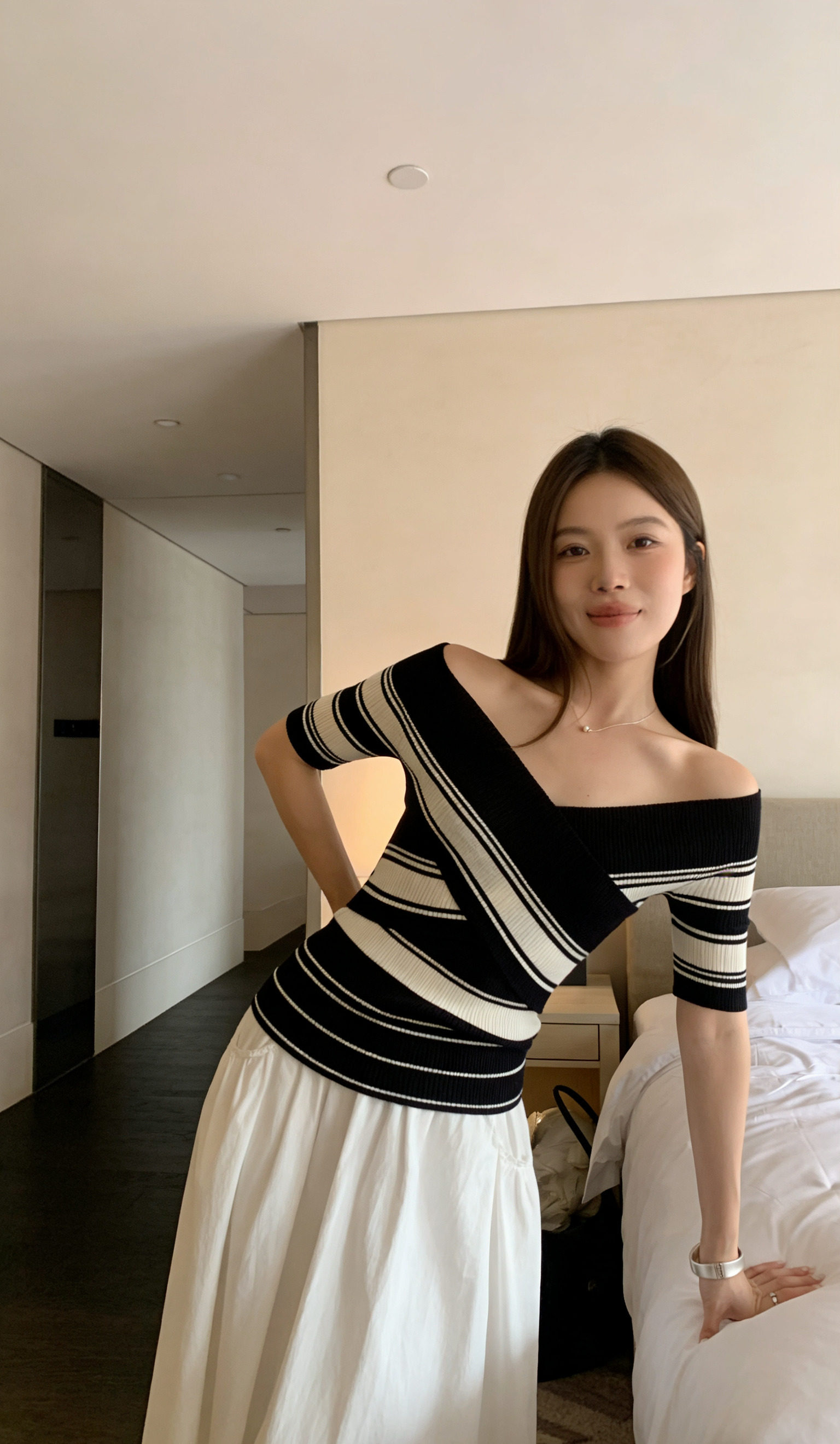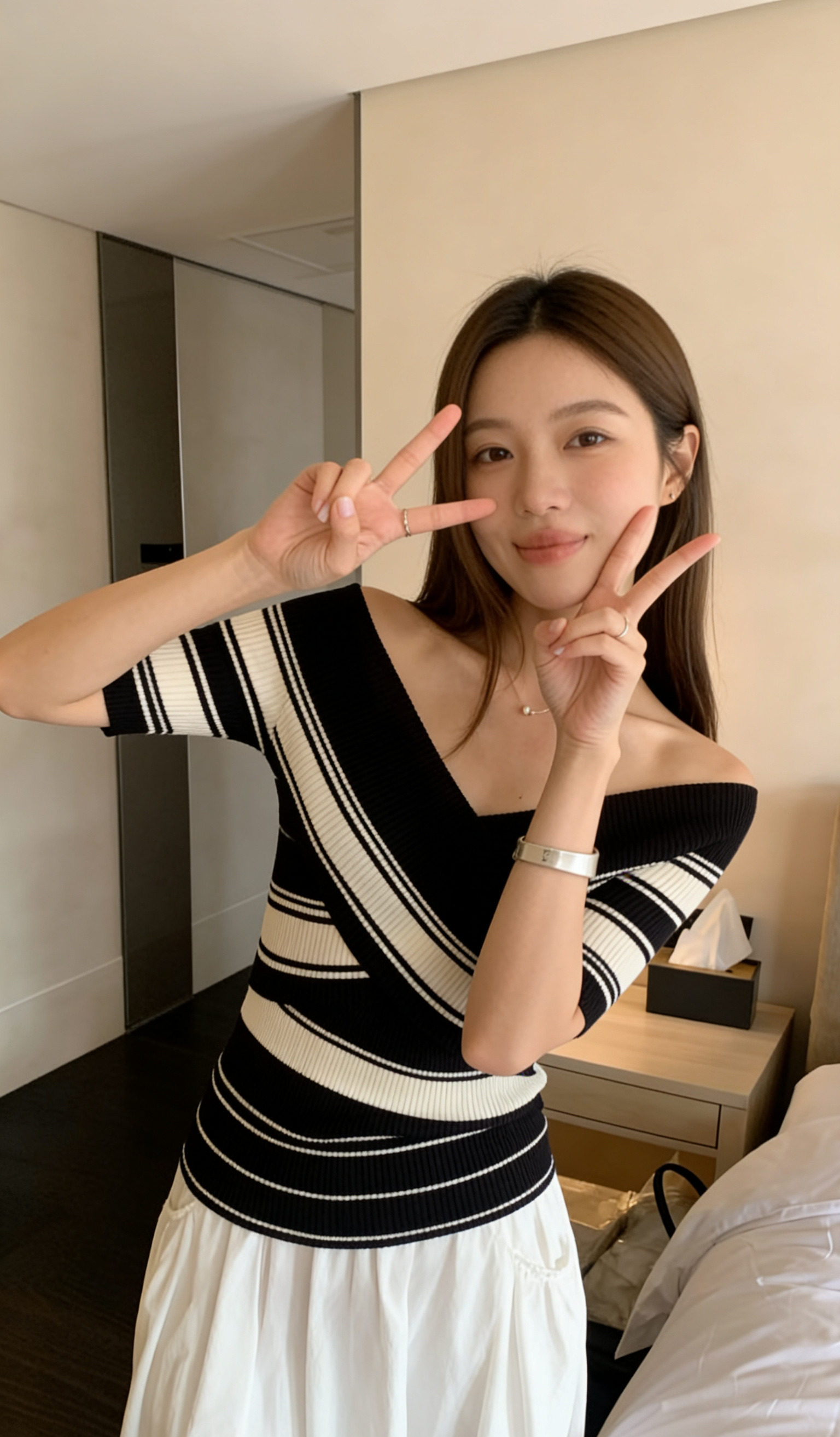 있음 도착 오프숄더 니트 맨위 반팔 디자인 센스 쇼트 스타일 티셔츠 부드러운 패션