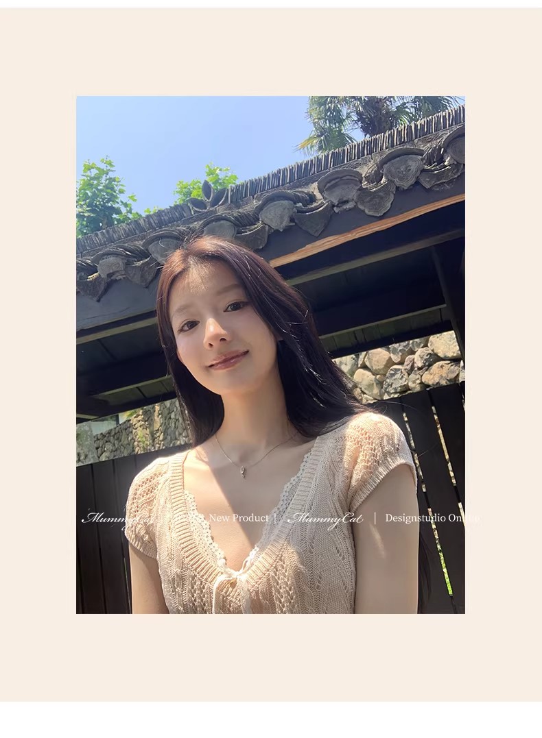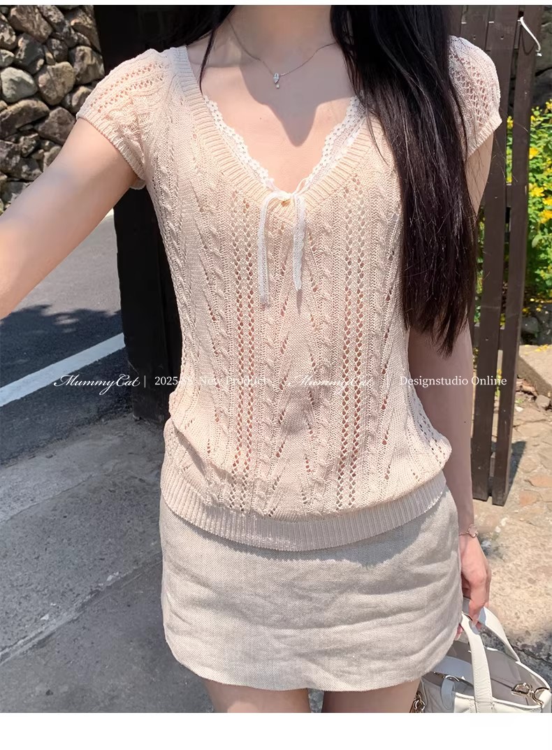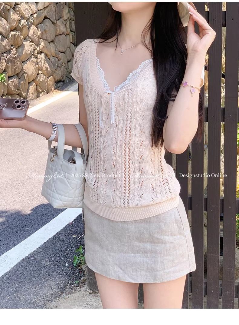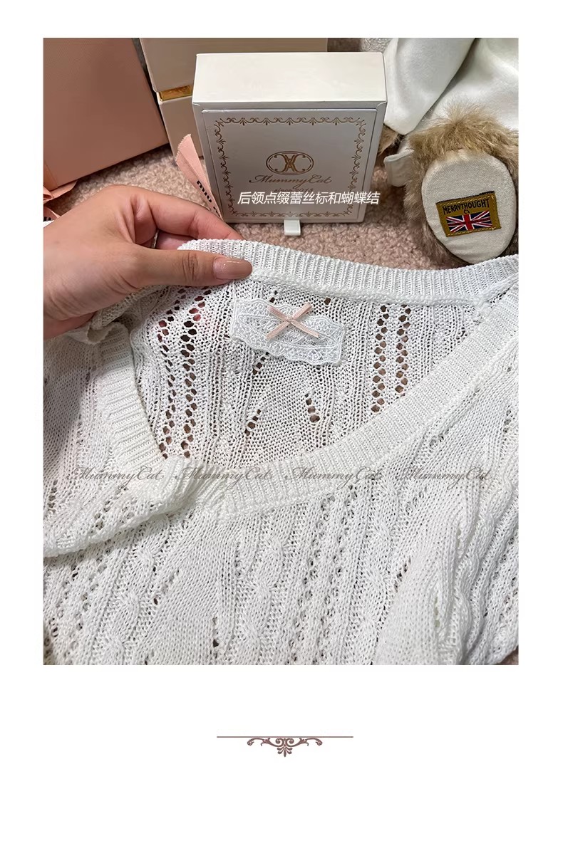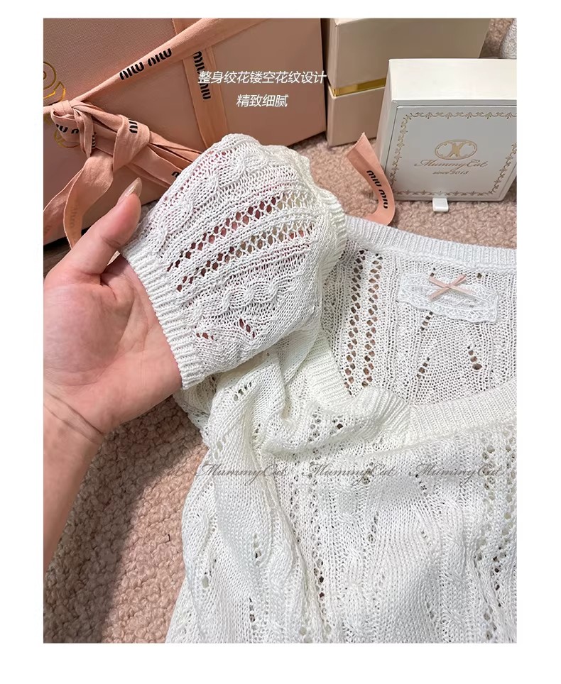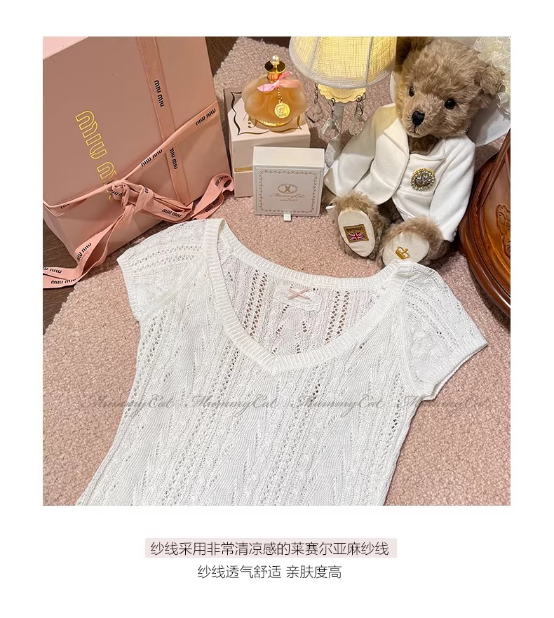 우유 화이트 나비 넥타이 홀로우 아웃 니트 반팔 티셔츠 여성 2026 여름 프랑스식 사소한 부드러운 바람 맨위