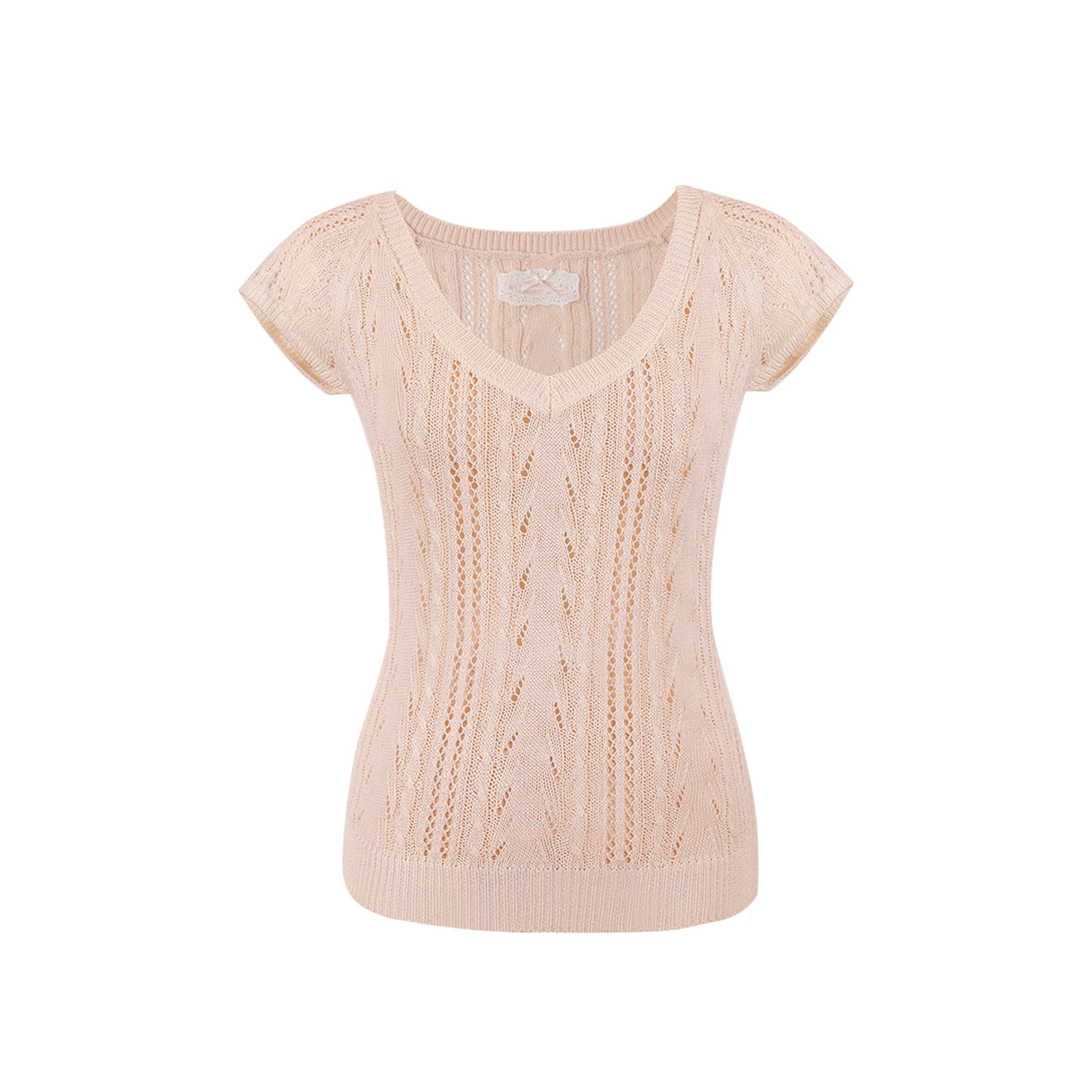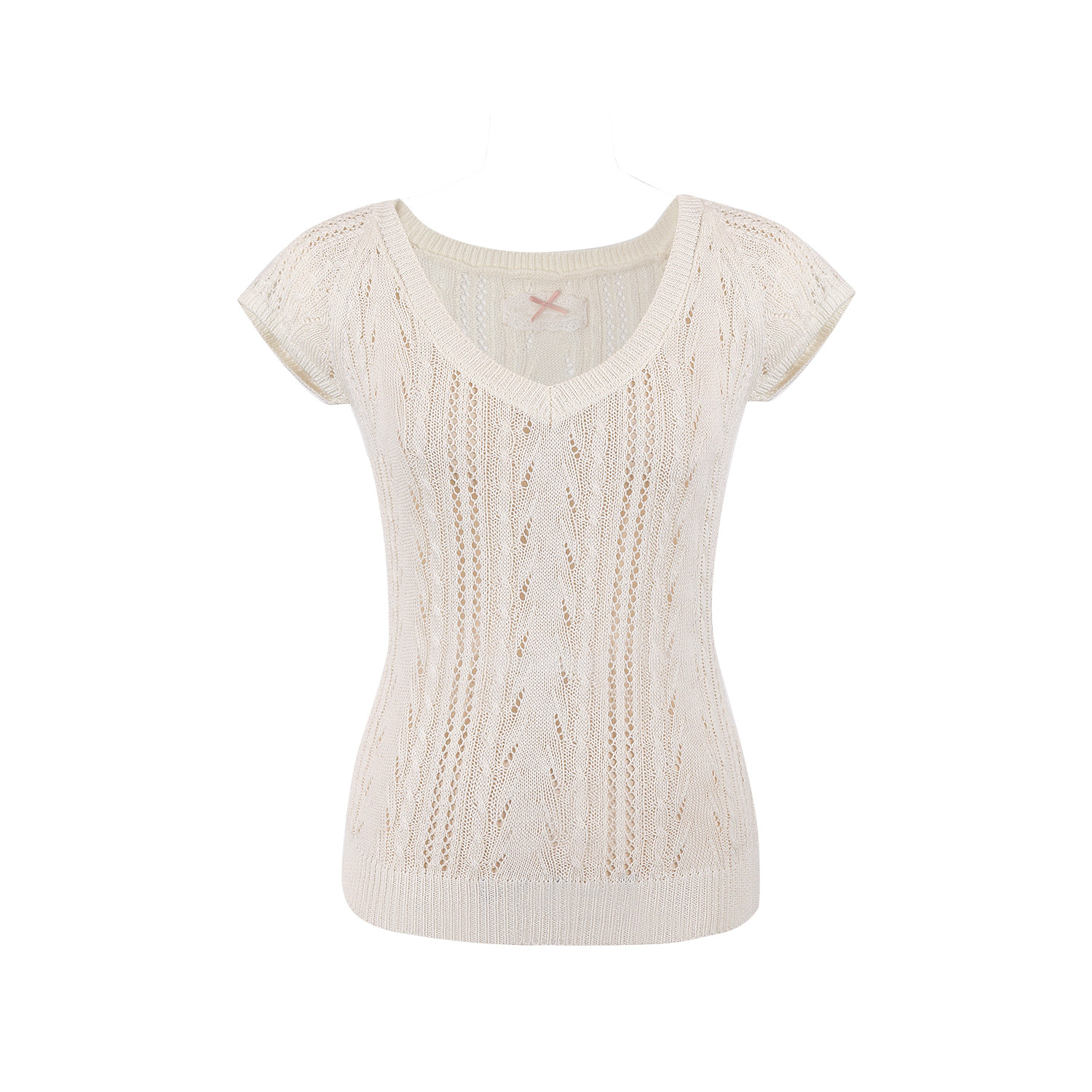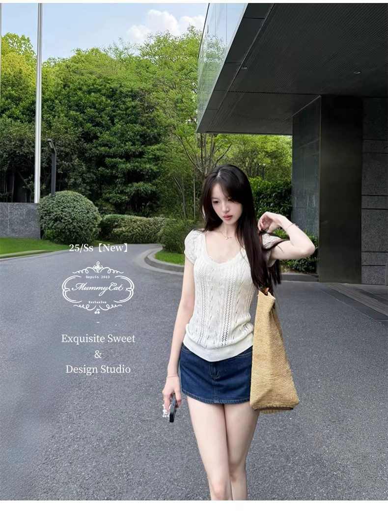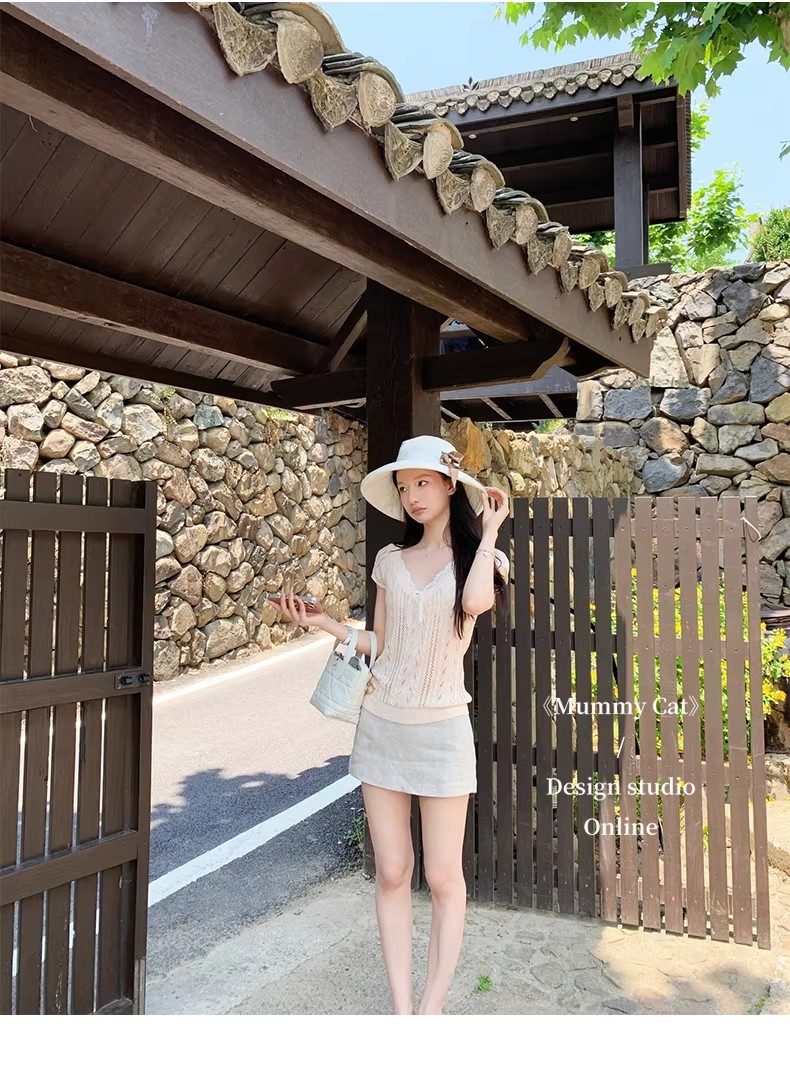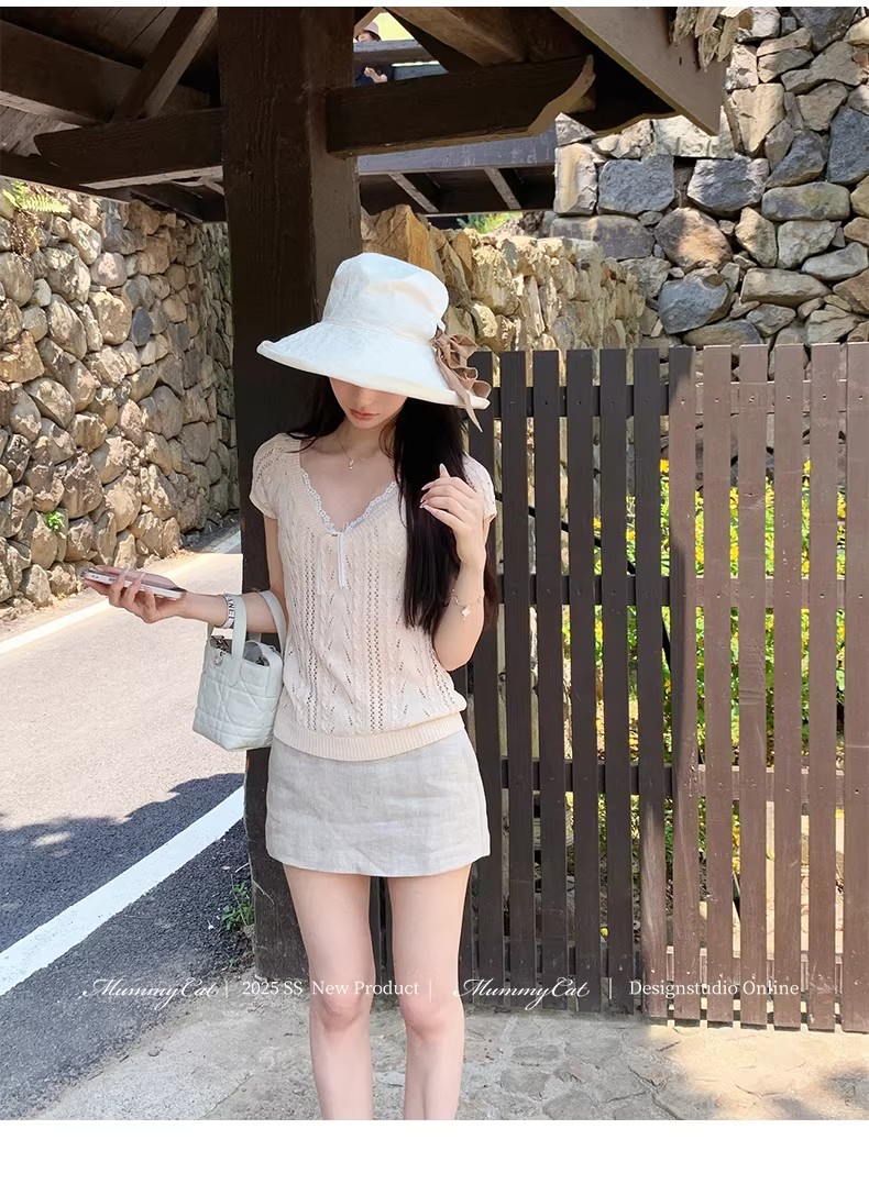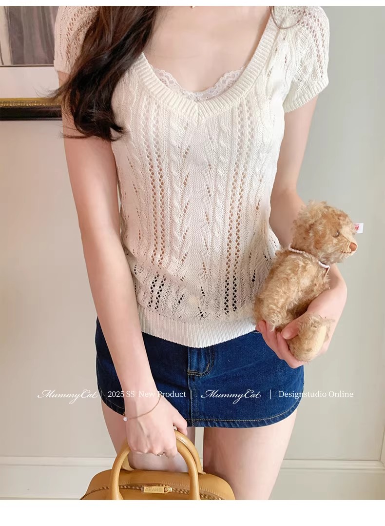 우유 화이트 나비 넥타이 홀로우 아웃 니트 반팔 티셔츠 여성 2026 여름 프랑스식 사소한 부드러운 바람 맨위