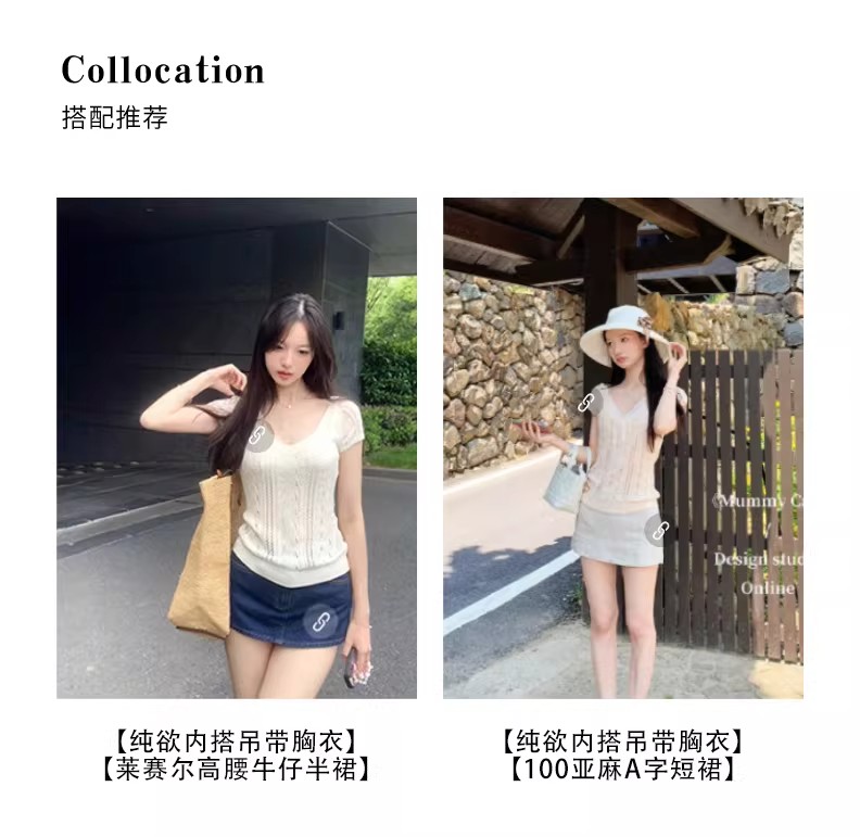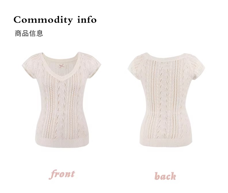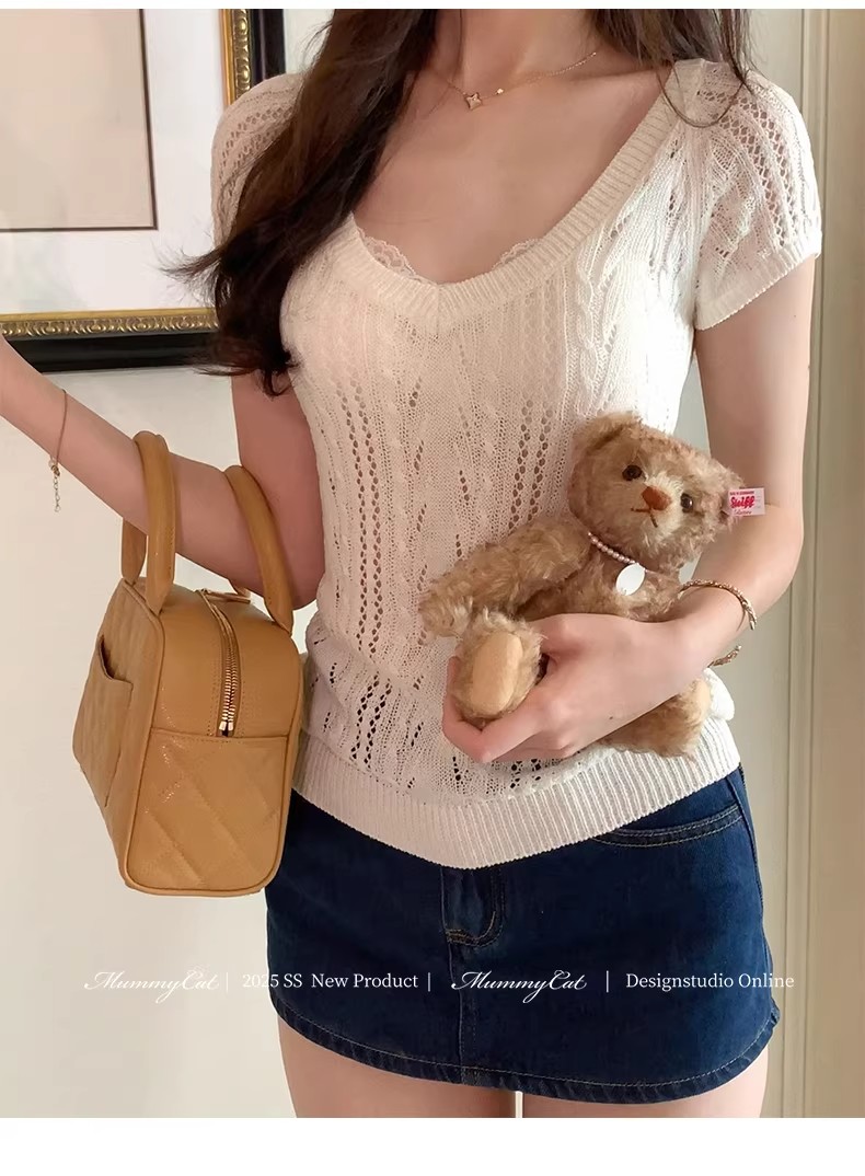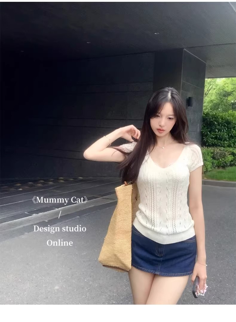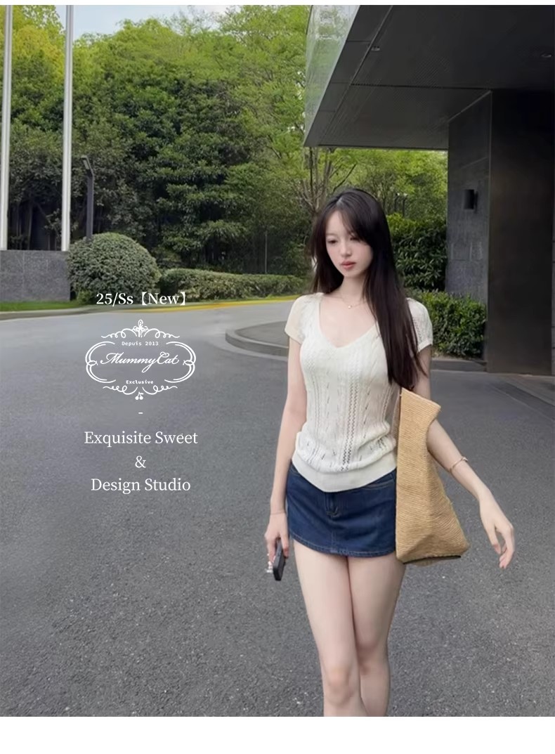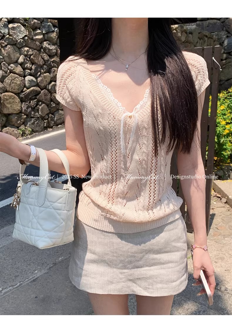 한 부서 아름다운 핑크색 V넥 얼음 실크 니트 반팔 티셔츠 여성 여름 고유 한 슈퍼 잘 생긴 몸매 가꾸기 쇼트 스타일 작은 맨위