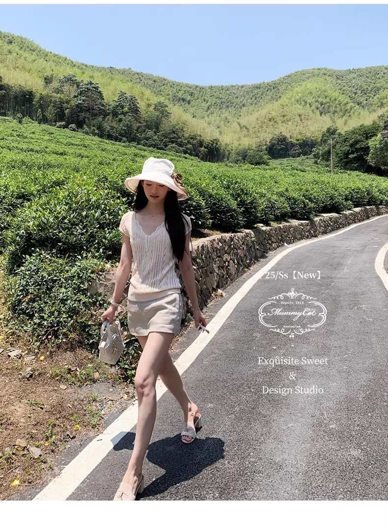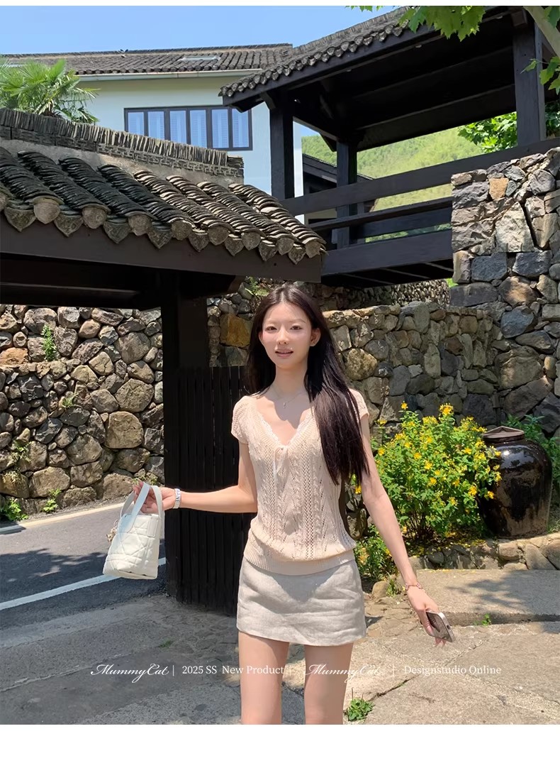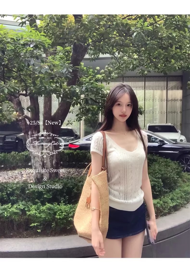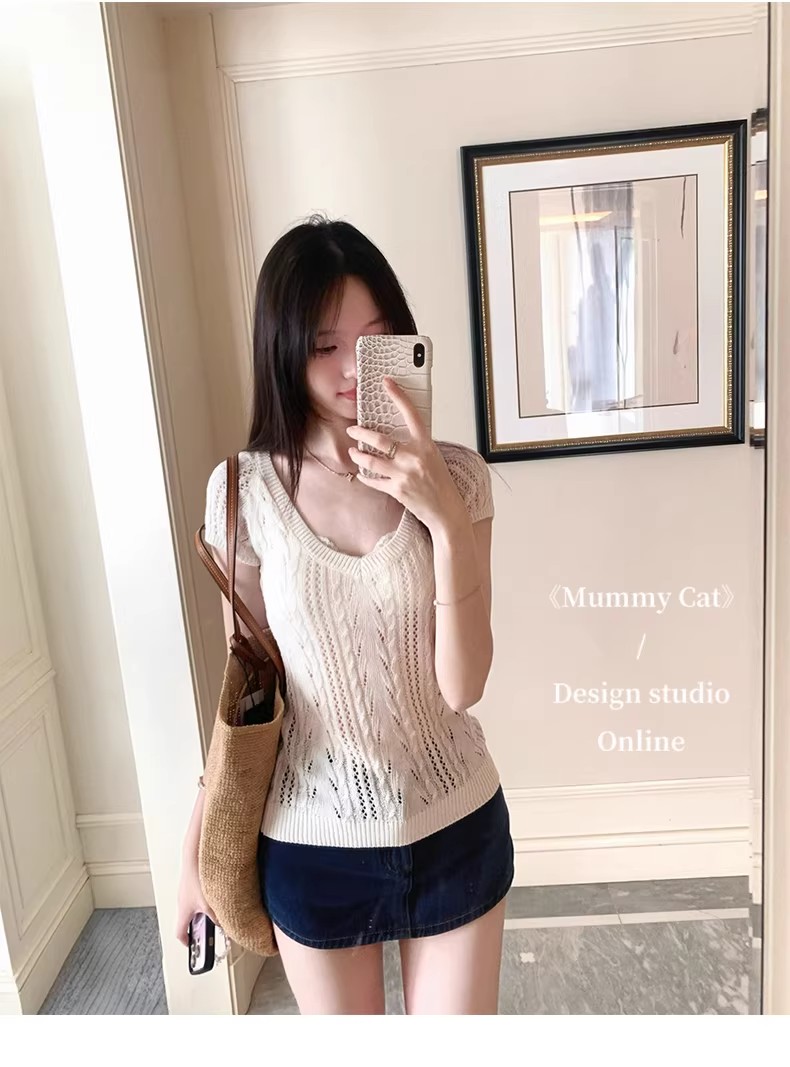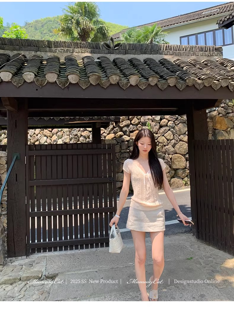2026 봄 여름 한 부서 POLO 칼라 양모 반팔 니트 스웨터 여성 u 칼라 얇은 스타일 슬림해 보이는 다용도 티셔츠 맨위