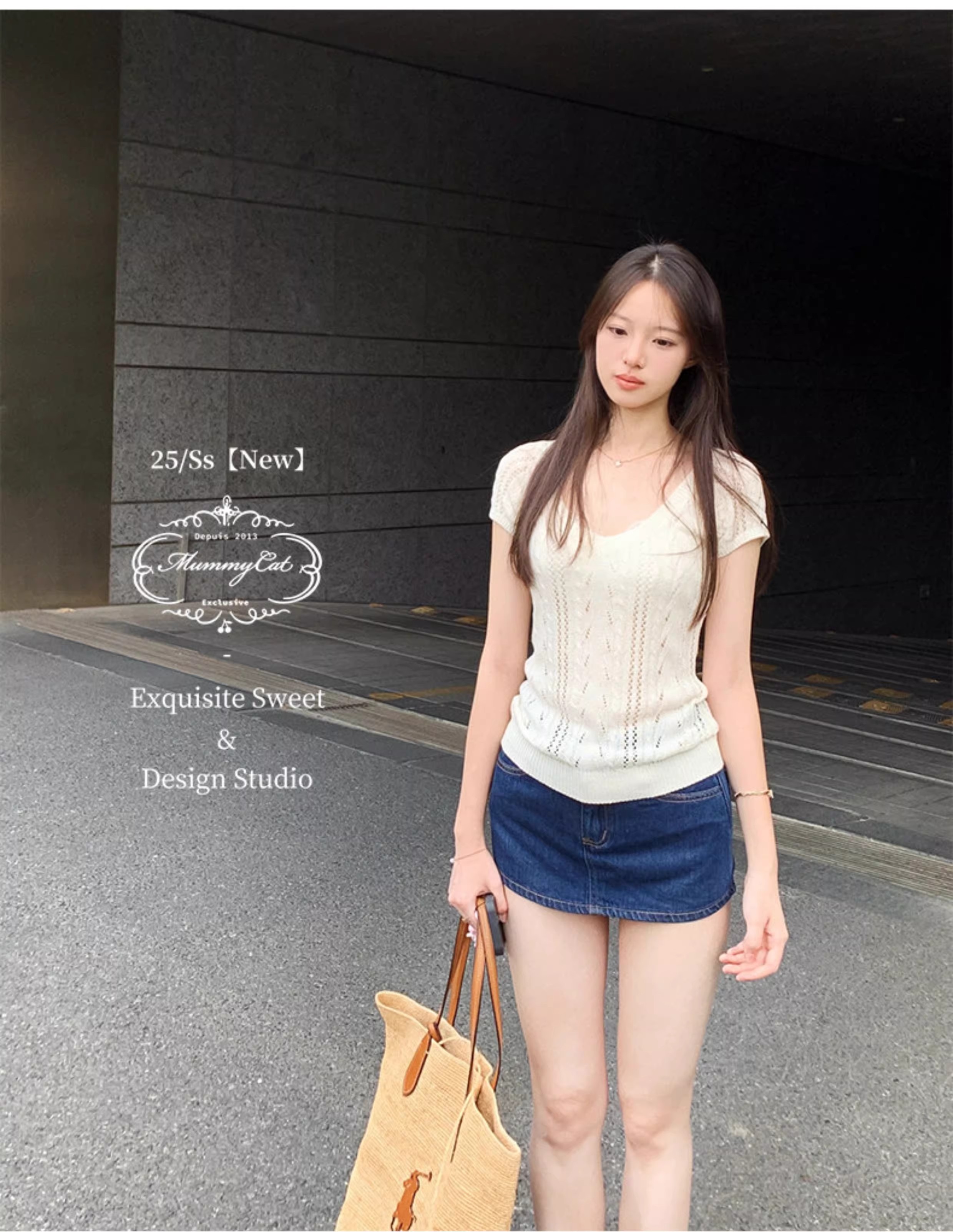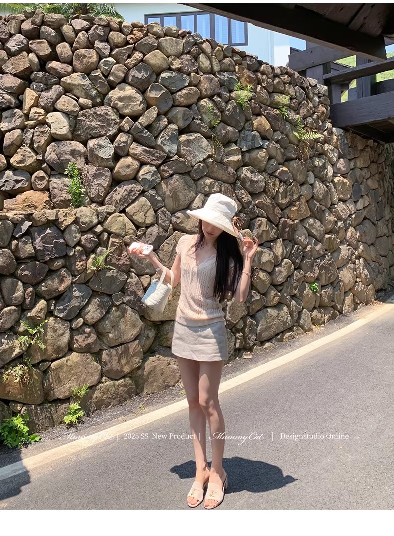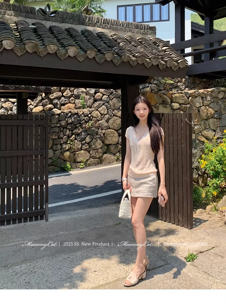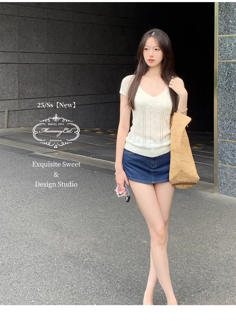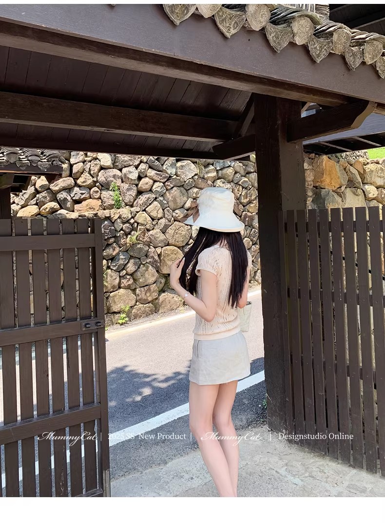2026 봄 여름 한 부서 POLO 칼라 양모 반팔 니트 스웨터 여성 u 칼라 얇은 스타일 슬림해 보이는 다용도 티셔츠 맨위