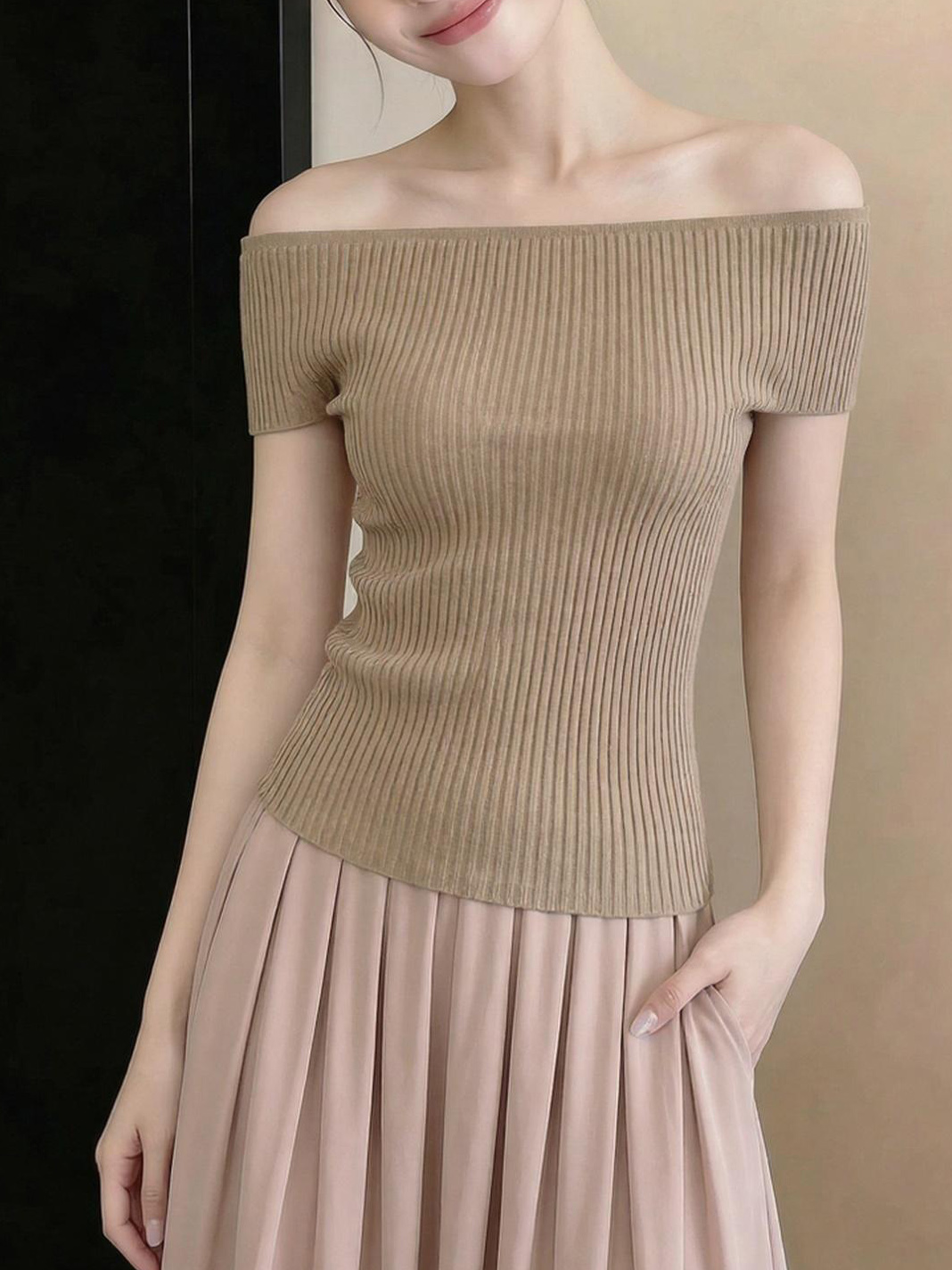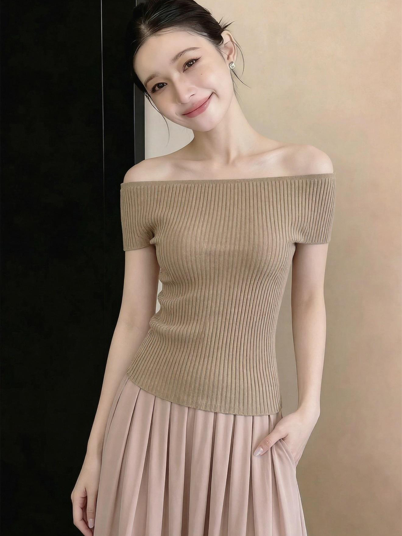있음 도착 한국 스타일 비스듬한 어깨 니트 스웨터 여성 2026 여름 몸매 가꾸기 슬림해 보이는 반팔 맨위 Chic