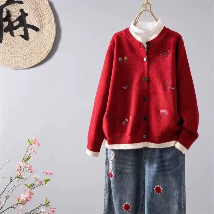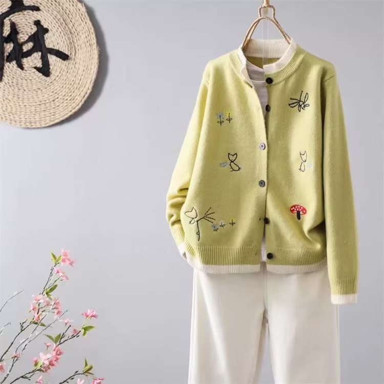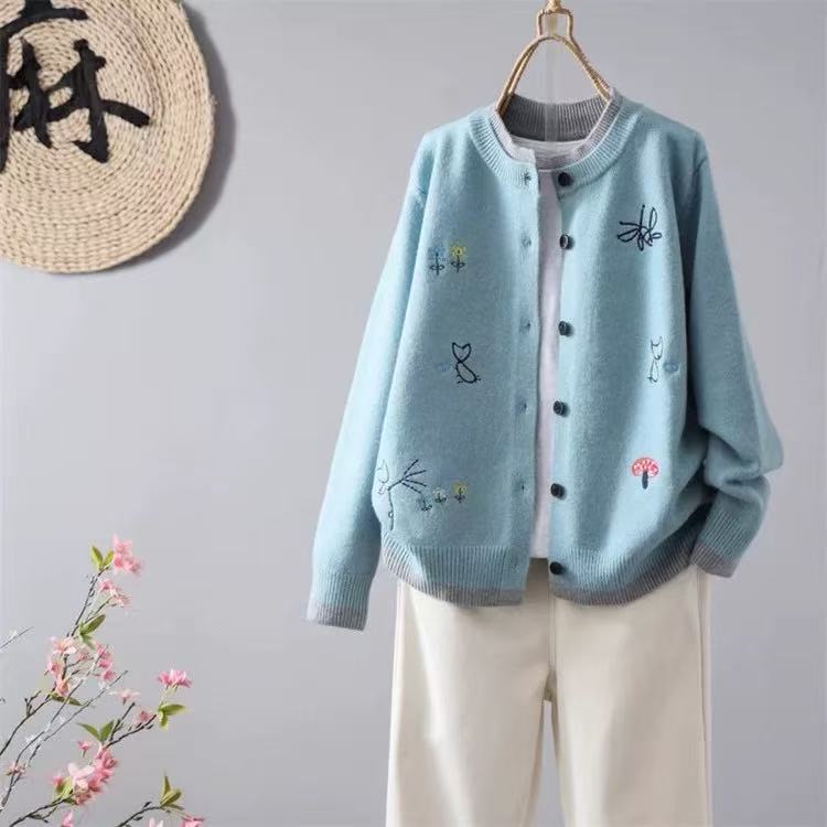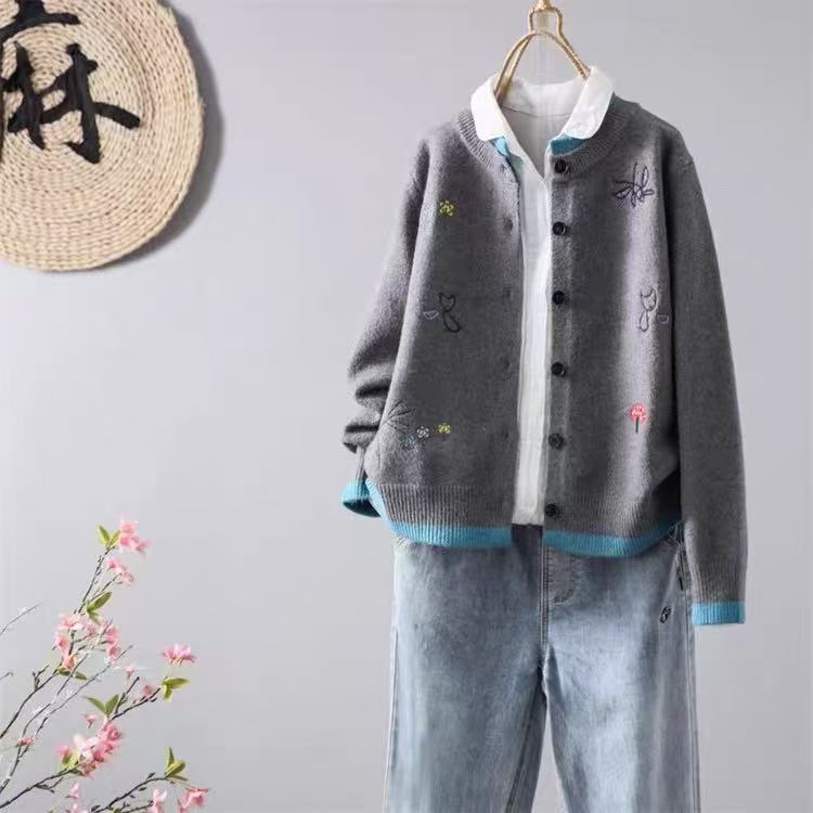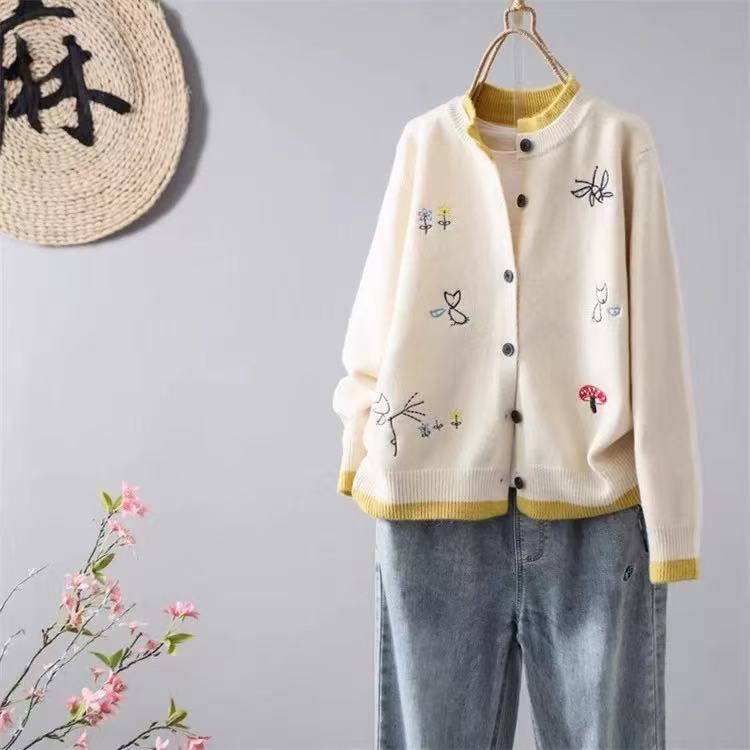 배색 자수 반팔 니트 오픈 가디건 여성 여름 새로운 얇은 스타일 루즈핏 통기성 반소매 맨위 티셔츠 작은 셔츠