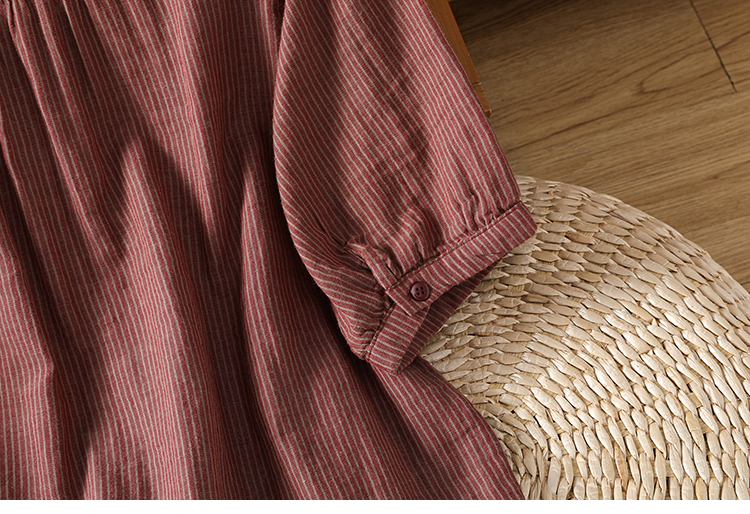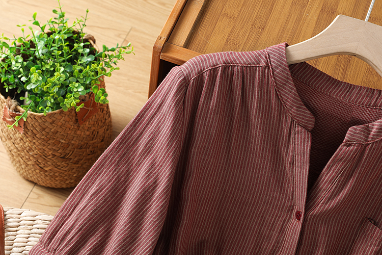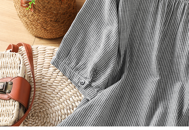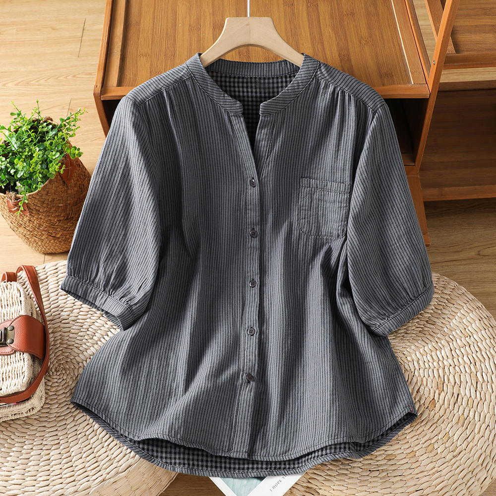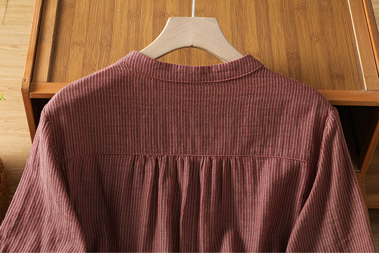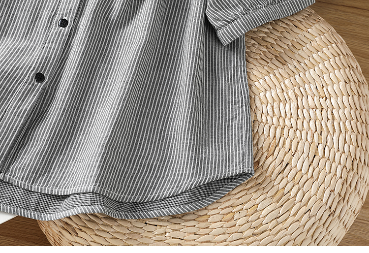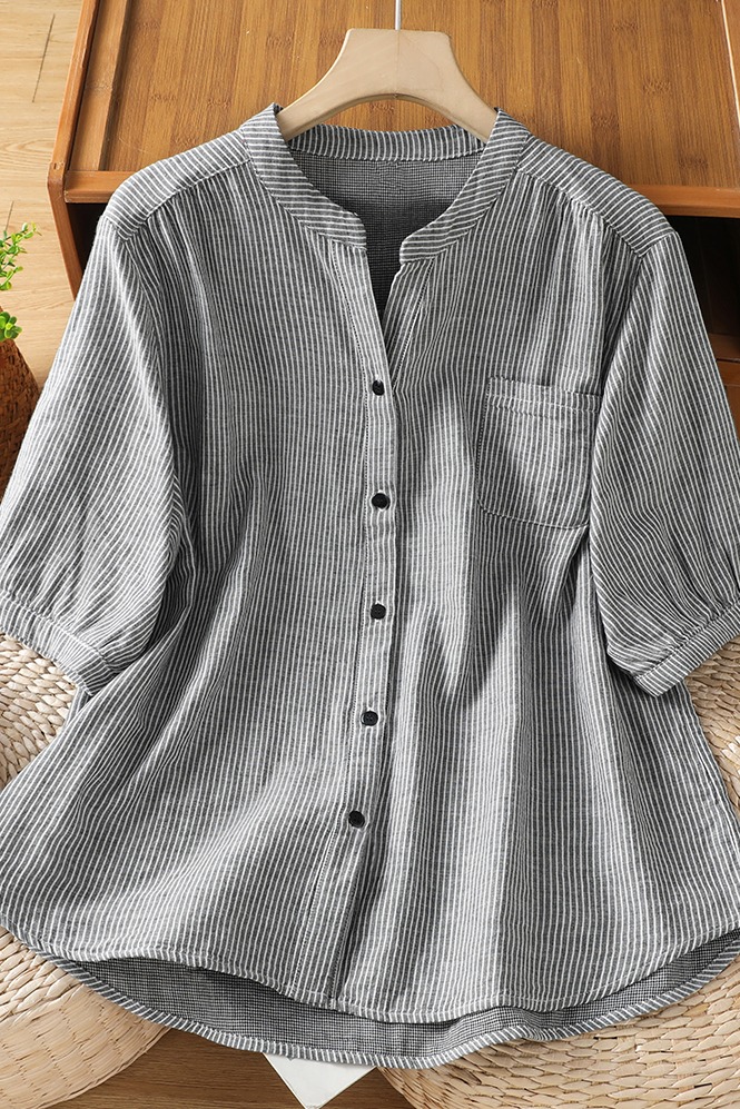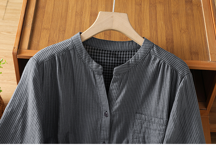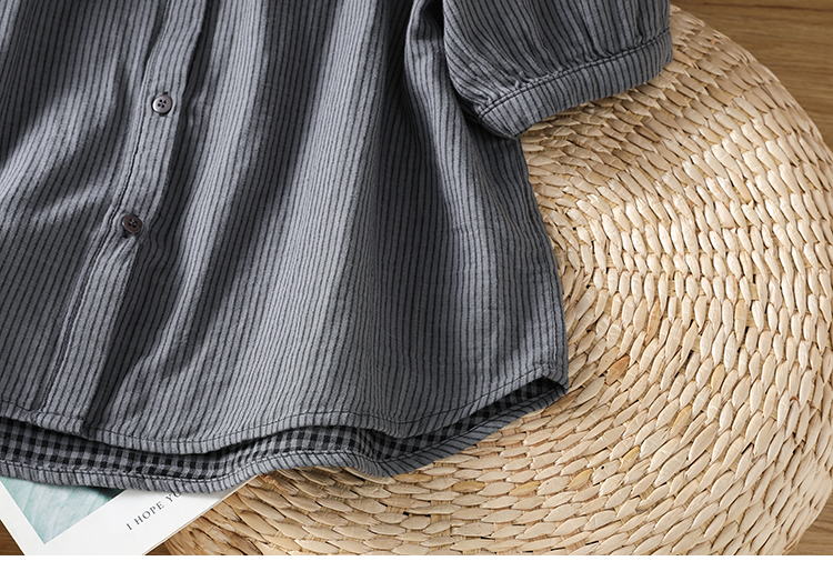 실사 2026 여름 섹션 면 100% 얇은 스타일 이중층 세로 줄무늬 반팔 셔츠 여성 레저 루즈핏 빅 사이즈 스탠드 칼라 맨위