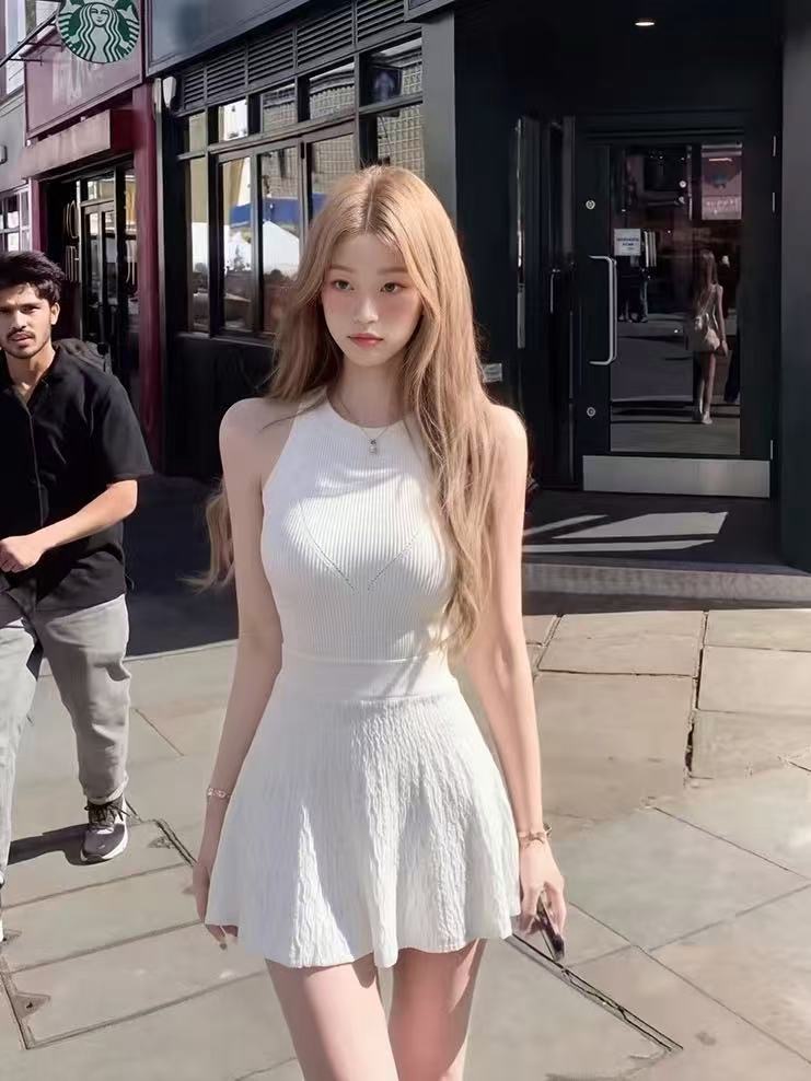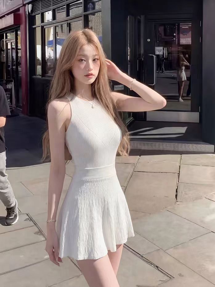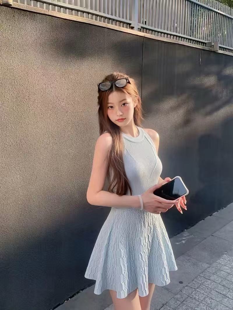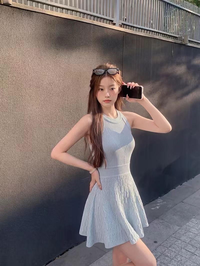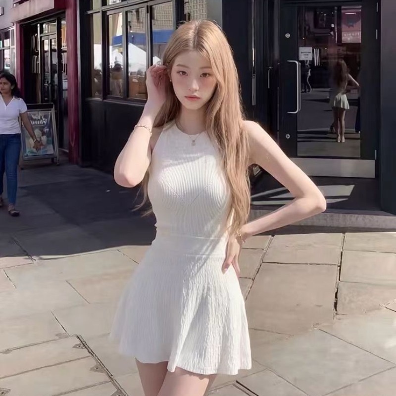 디자인 센스 행침 목 품격 슬립 드레스 쇼트 스타일 달콤함 프랑스식 휴가 바람 민소매 오프숄더 슬립 드레스
