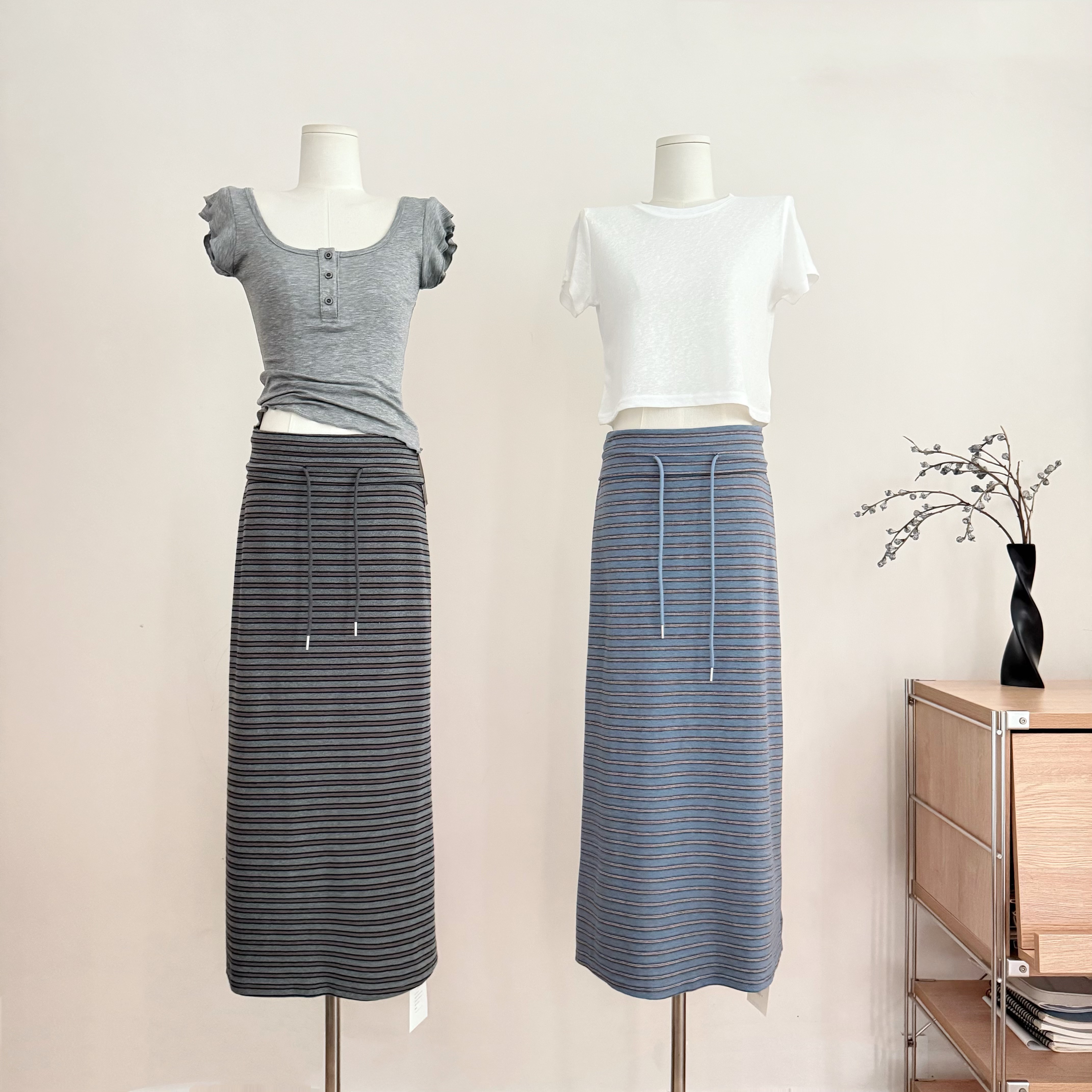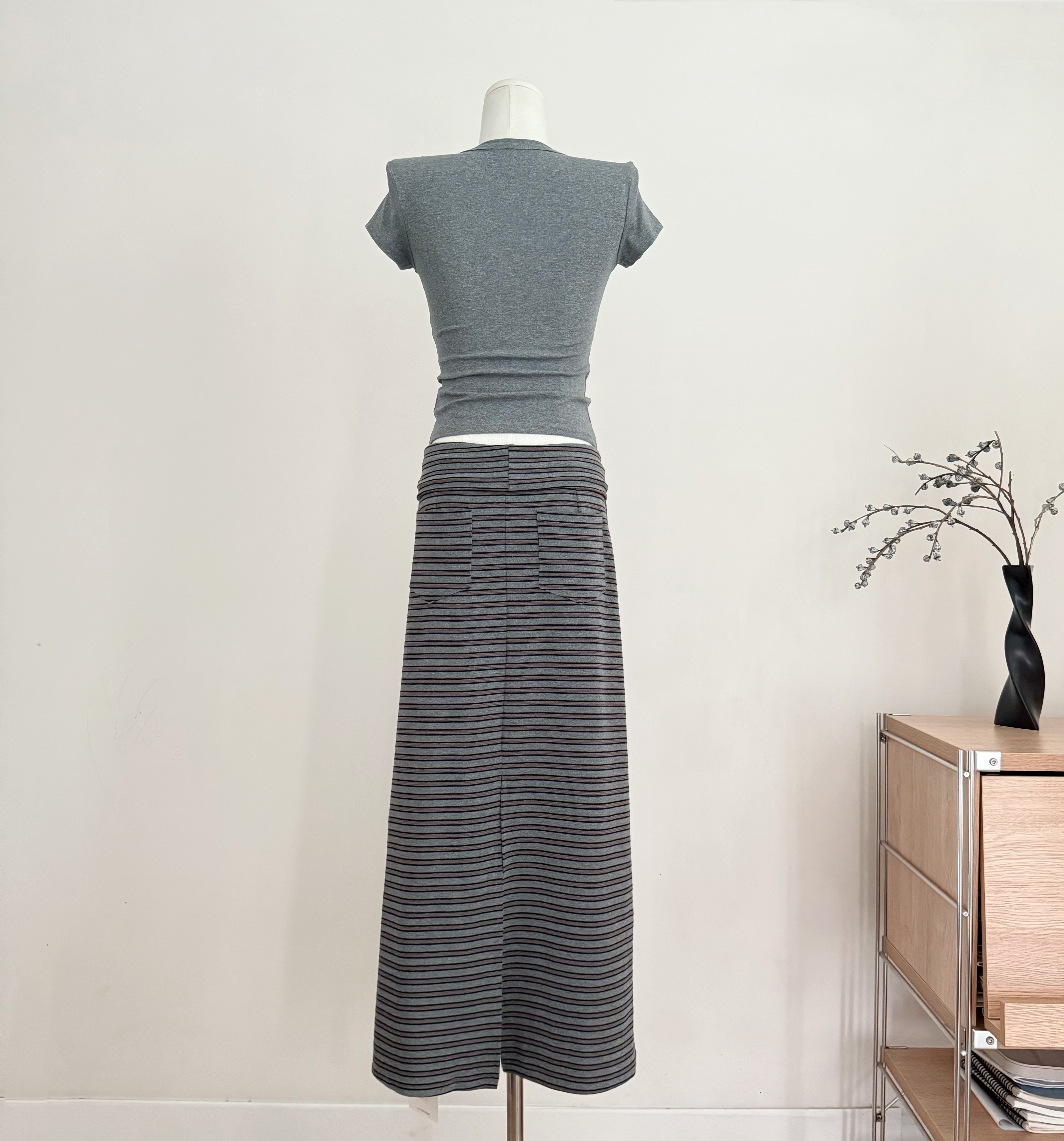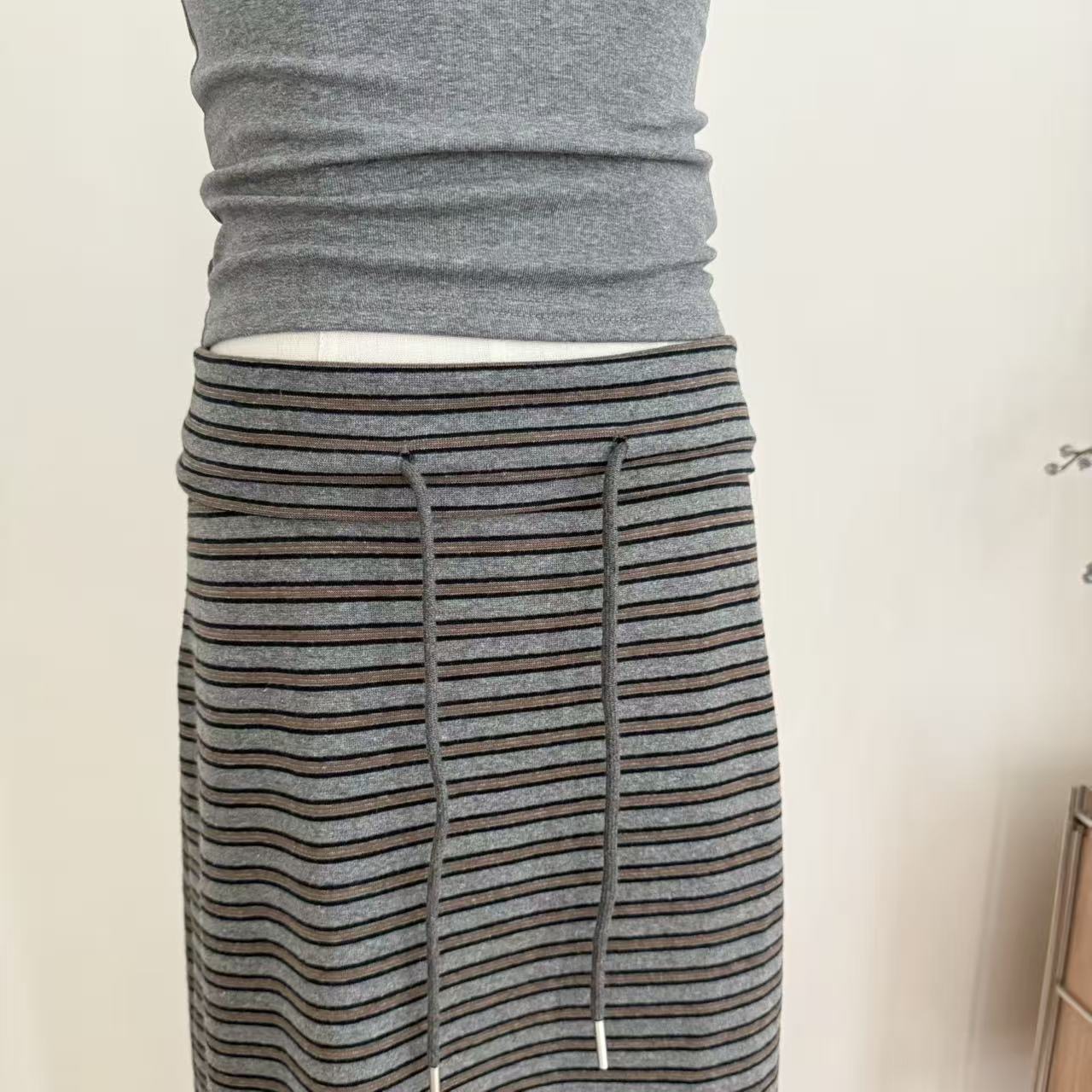 흔들어서 톤 3 3 게으른 치마 뒤집다 허리 스태킹 주름 스트라이프 반 스커트 펌프 로프 캐주얼 스트레이트 치마