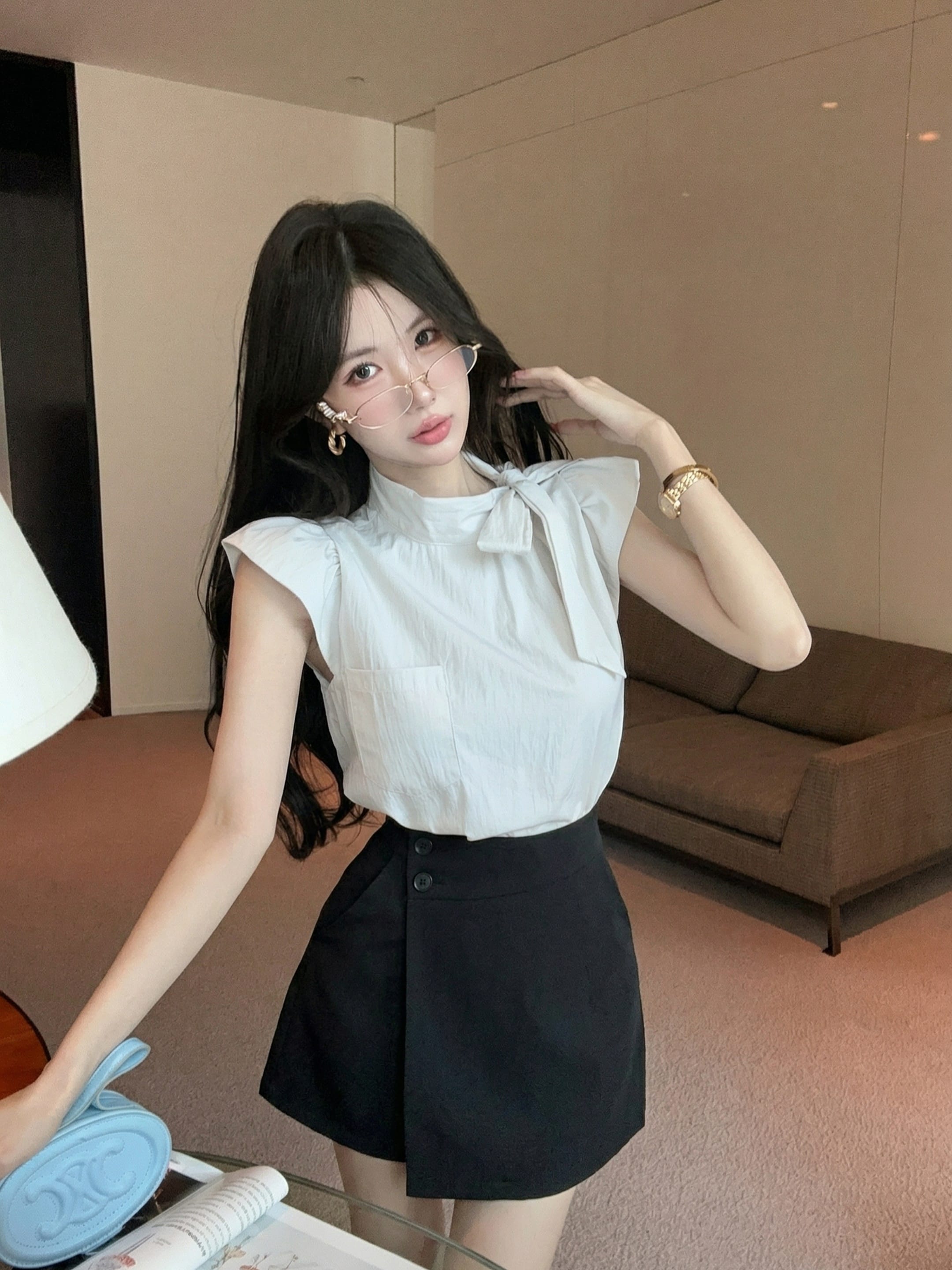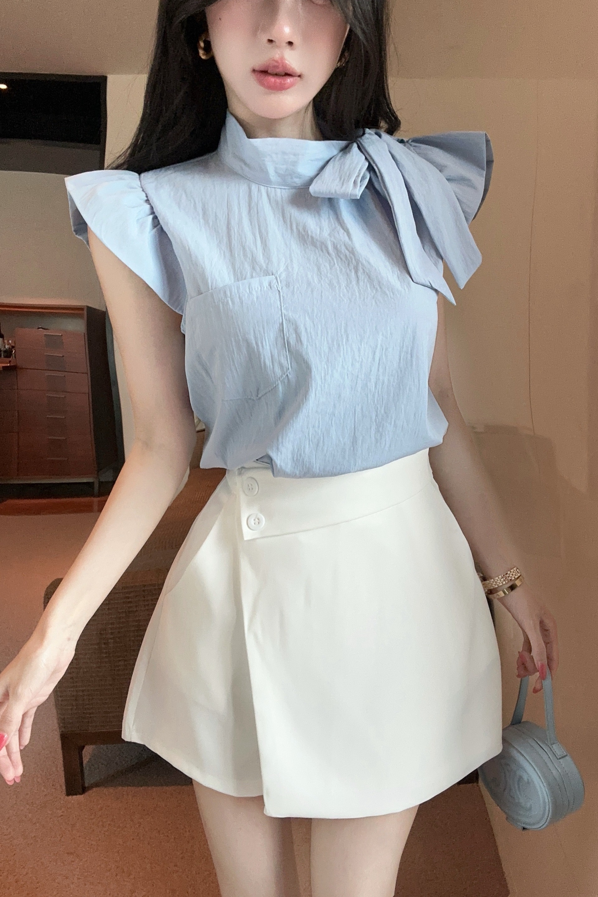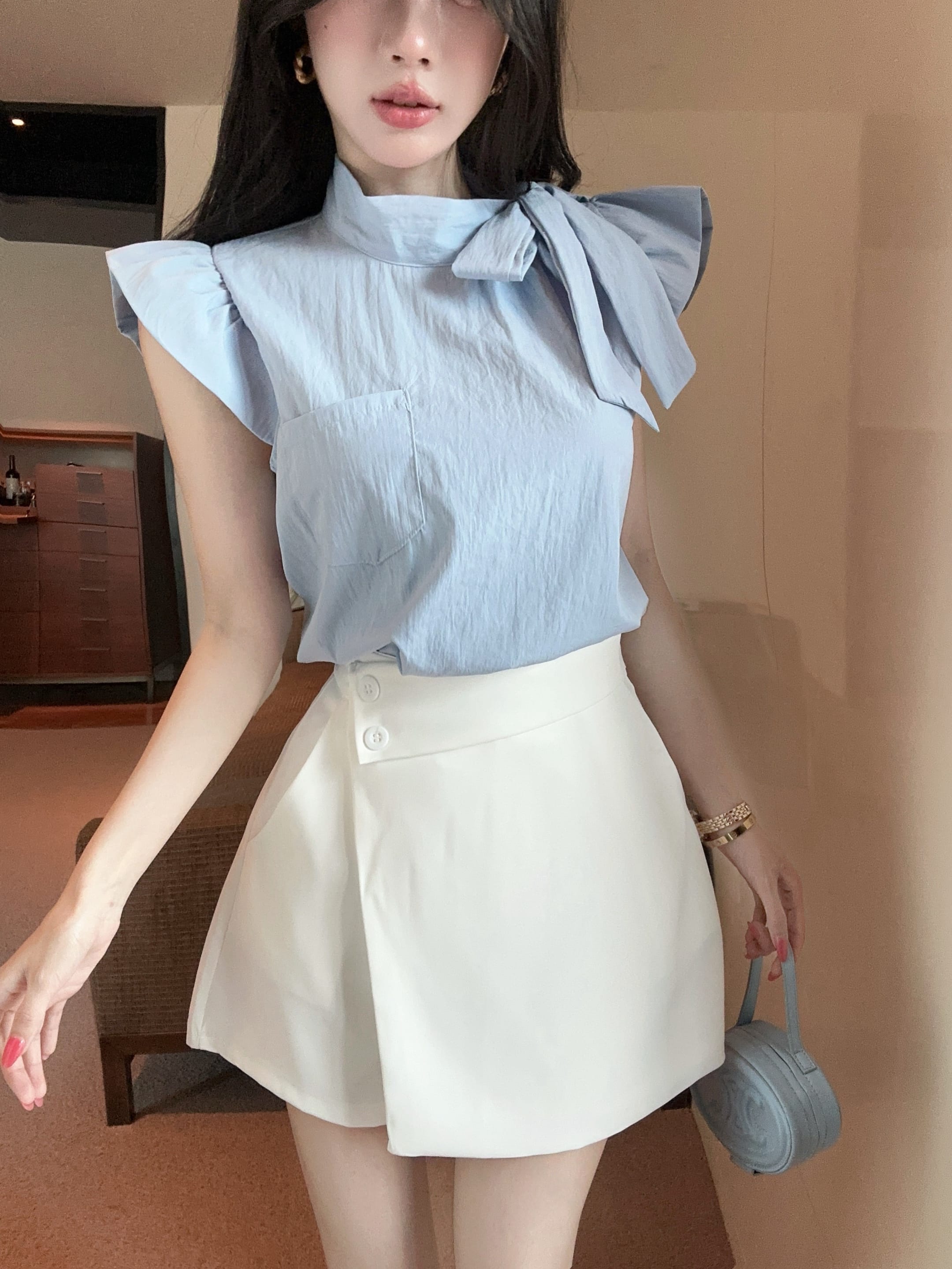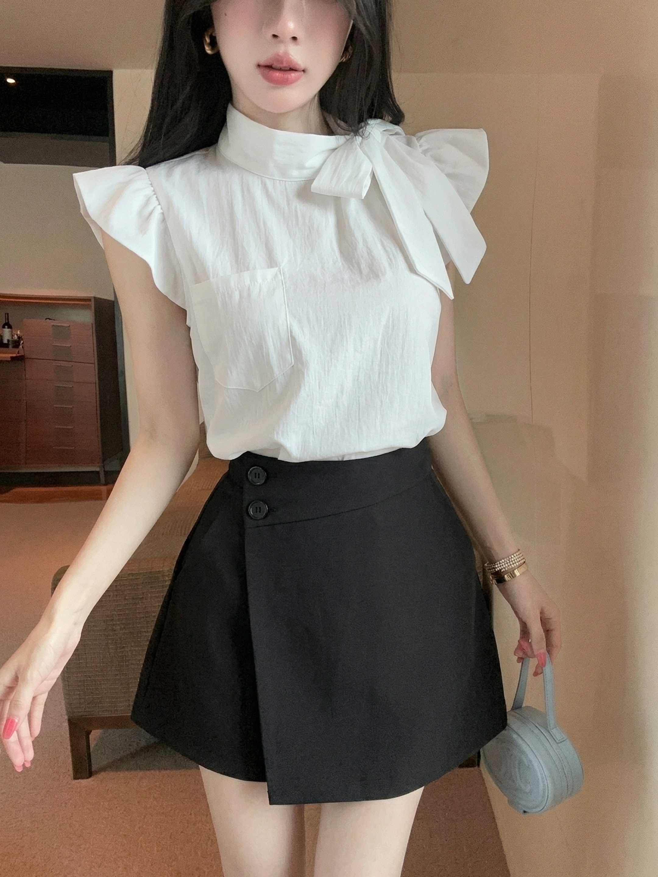 실사 정가 디자인 센스 찢어진 부분 어깨끈 페이크 레이어드 디자인 별 몸매 가꾸기 슬림해 보이는 쇼트 스타일 맨위