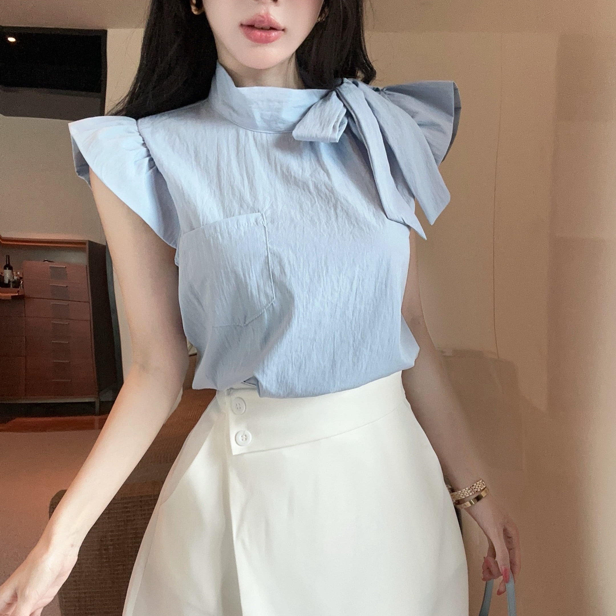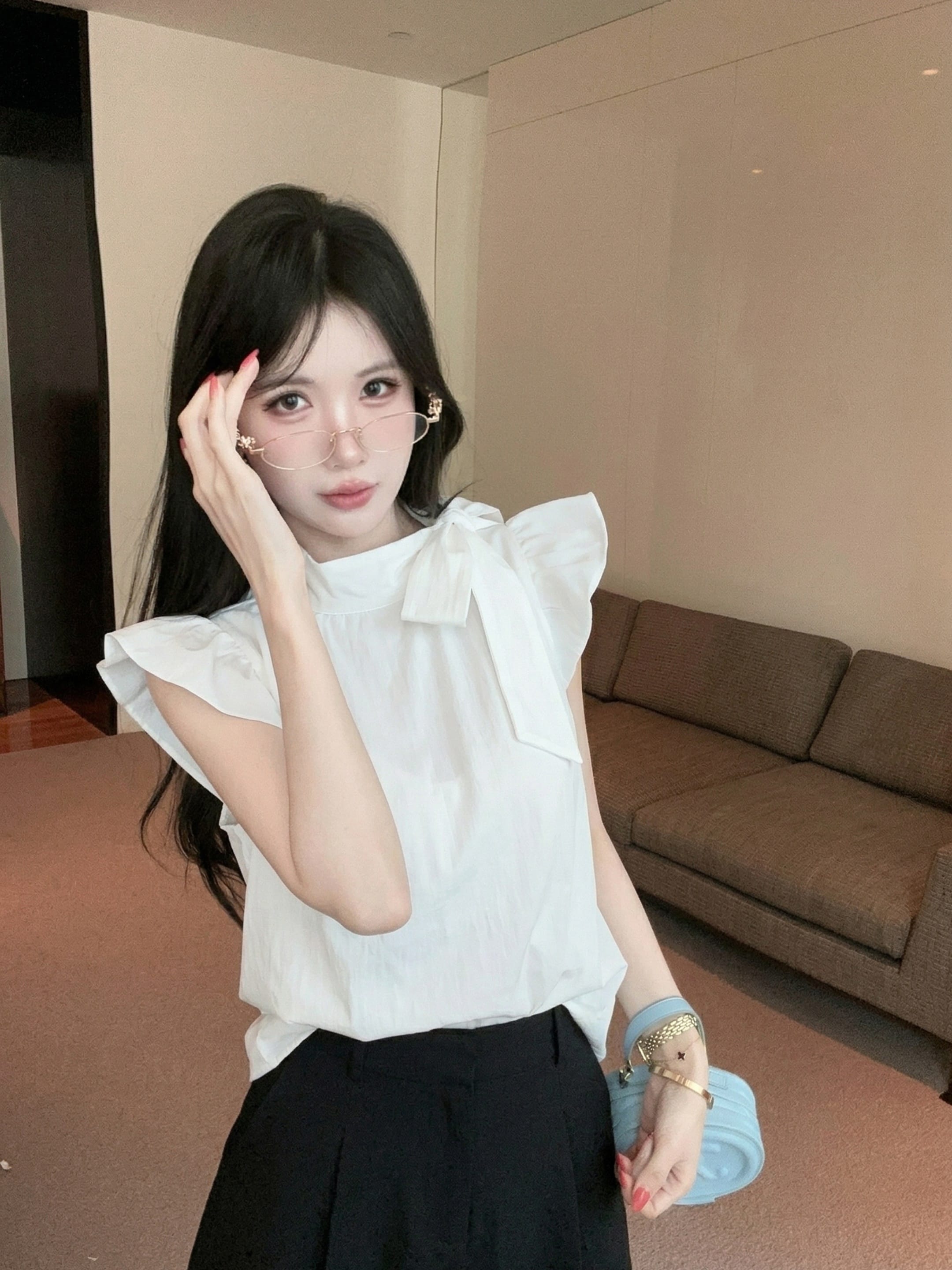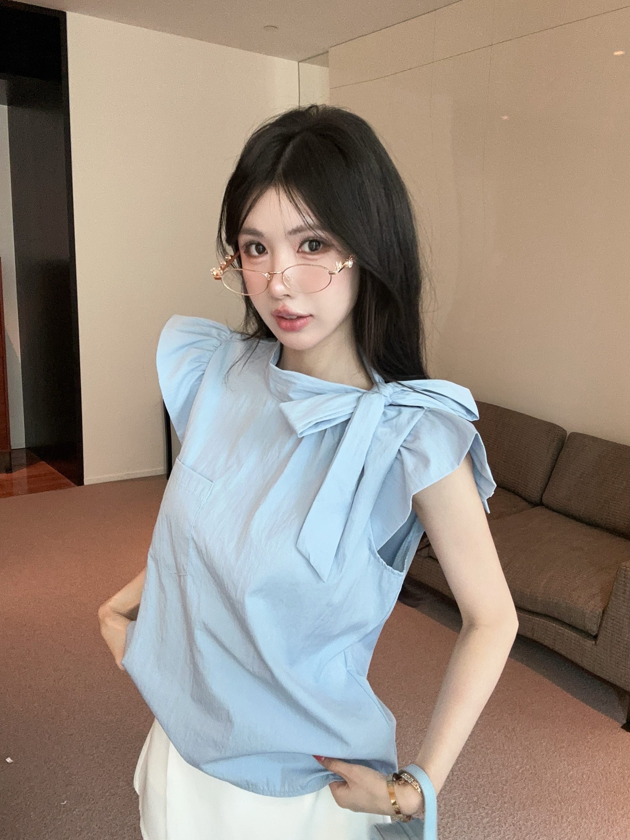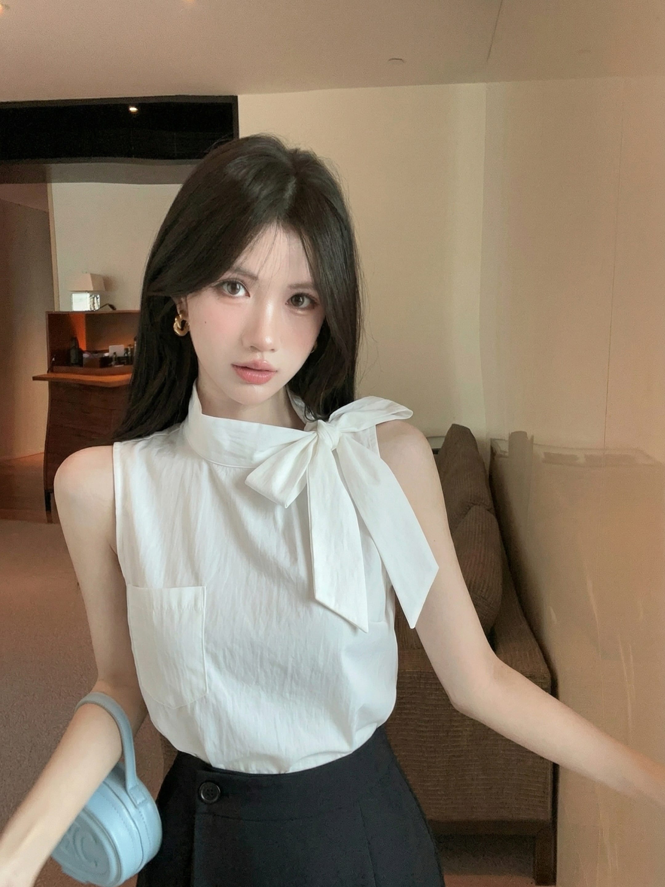실사 정가 디자인 센스 찢어진 부분 어깨끈 페이크 레이어드 디자인 별 몸매 가꾸기 슬림해 보이는 쇼트 스타일 맨위