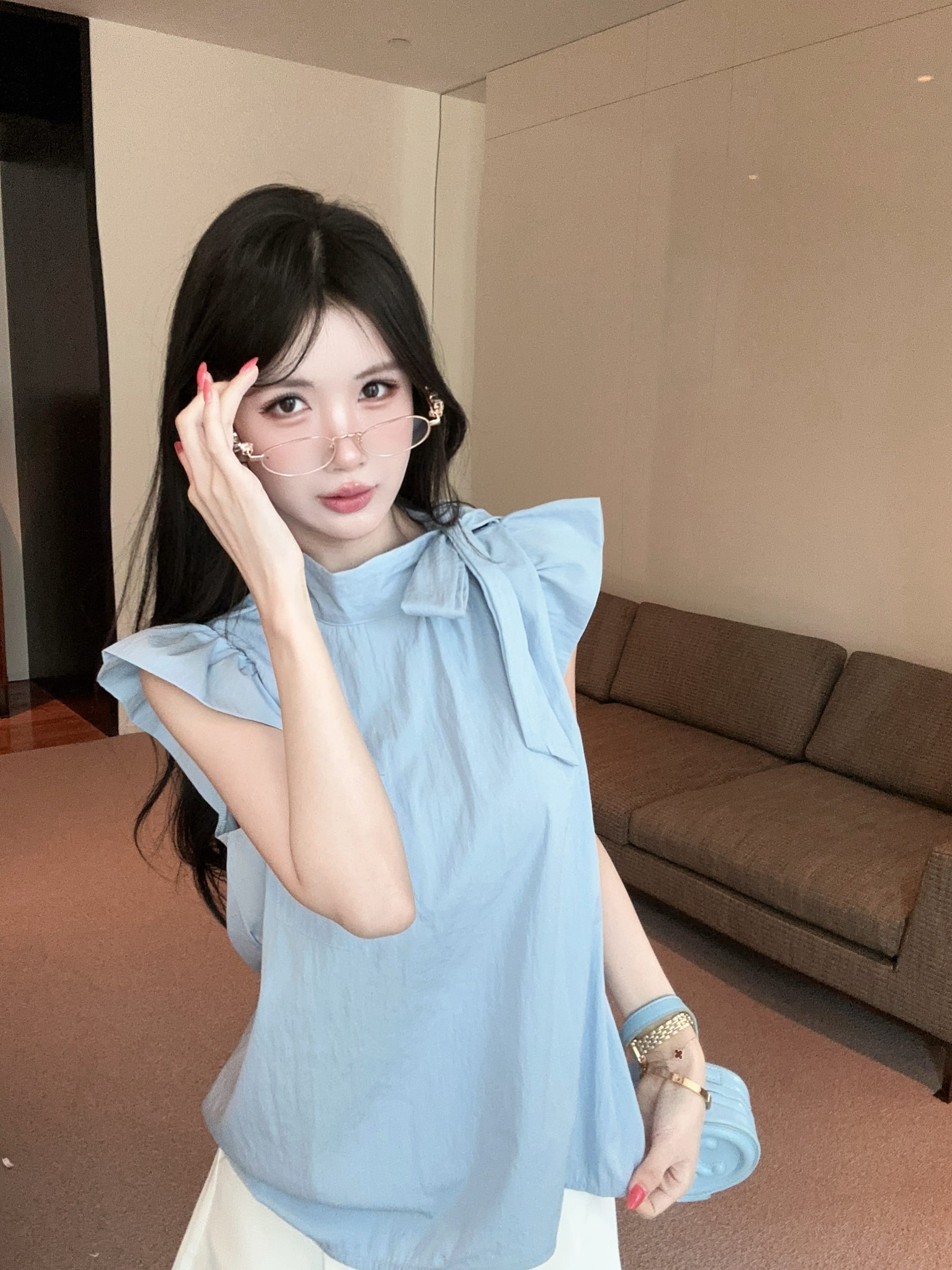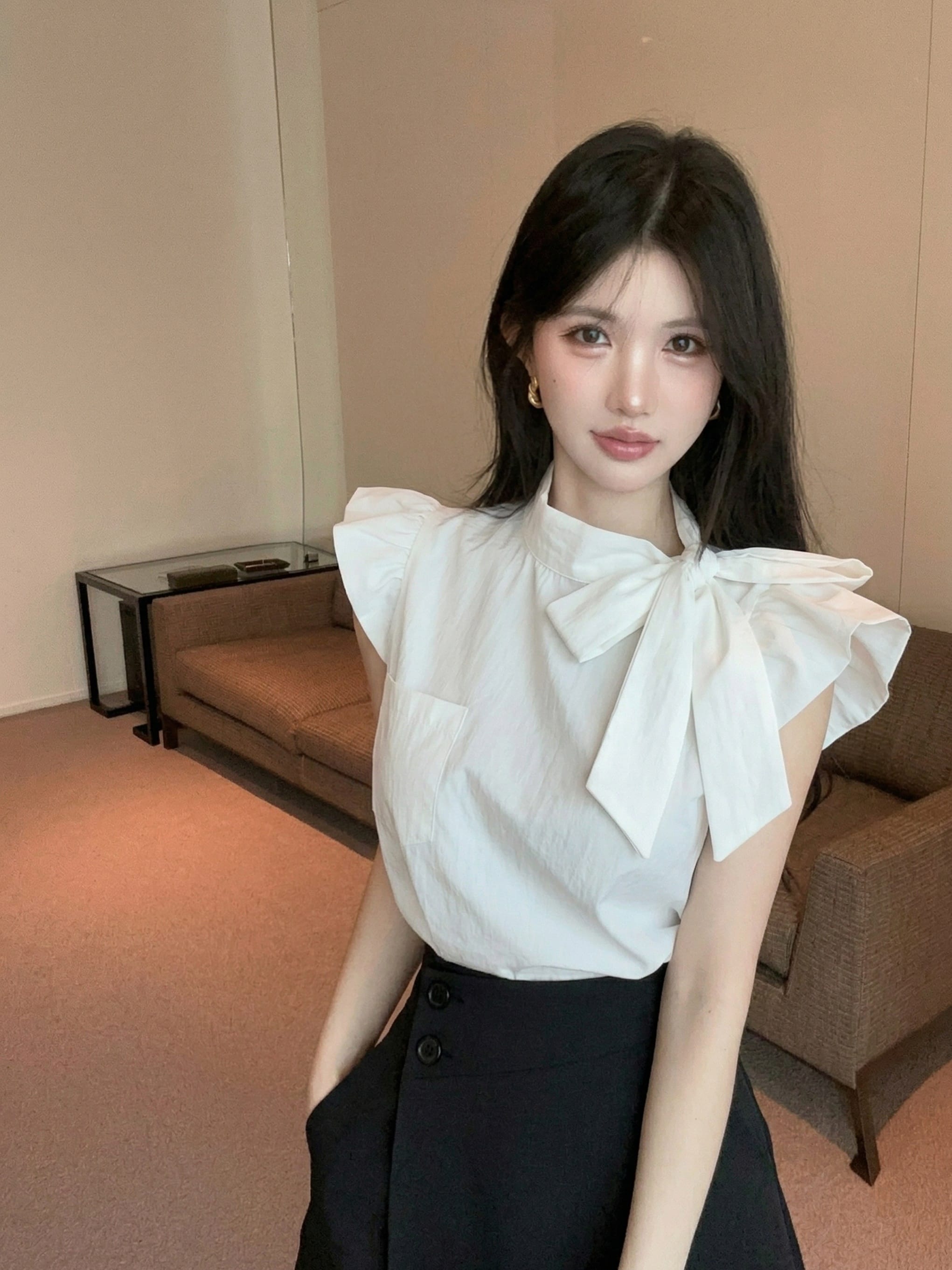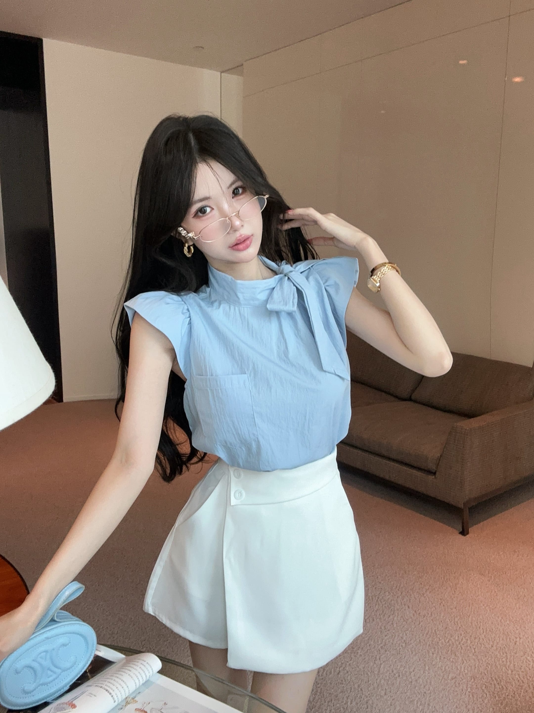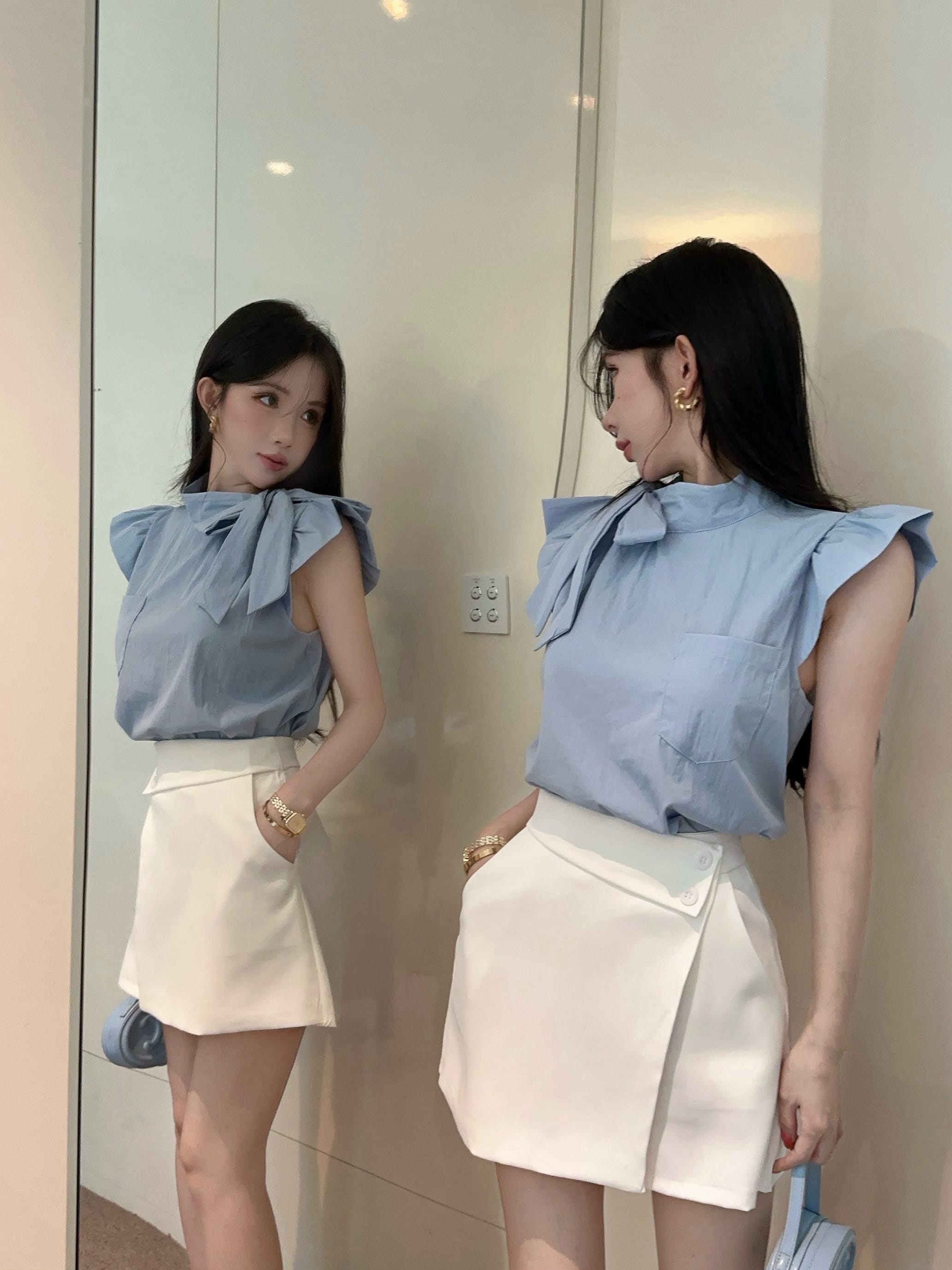실사 정가 디자인 센스 찢어진 부분 어깨끈 페이크 레이어드 디자인 별 몸매 가꾸기 슬림해 보이는 쇼트 스타일 맨위