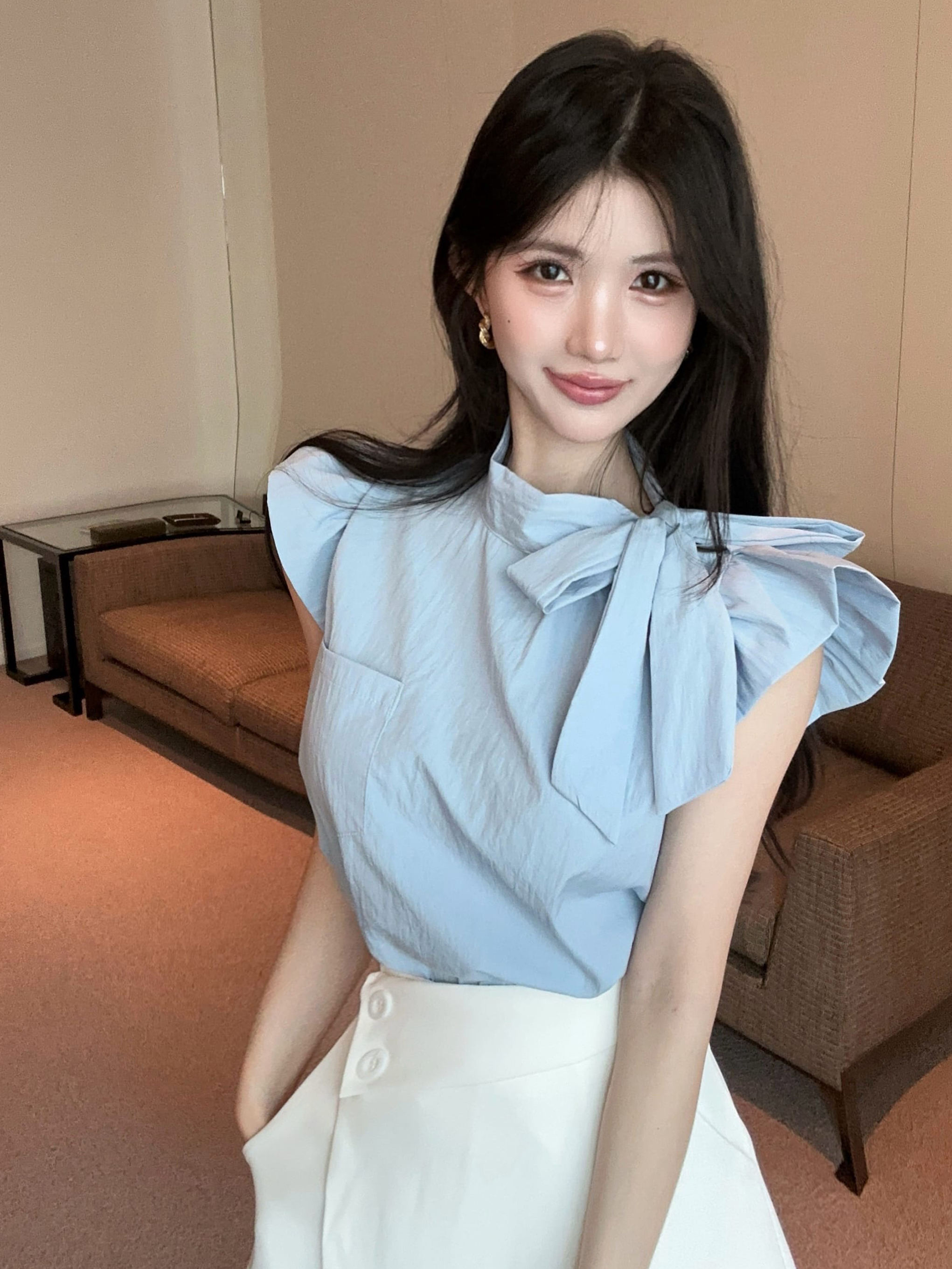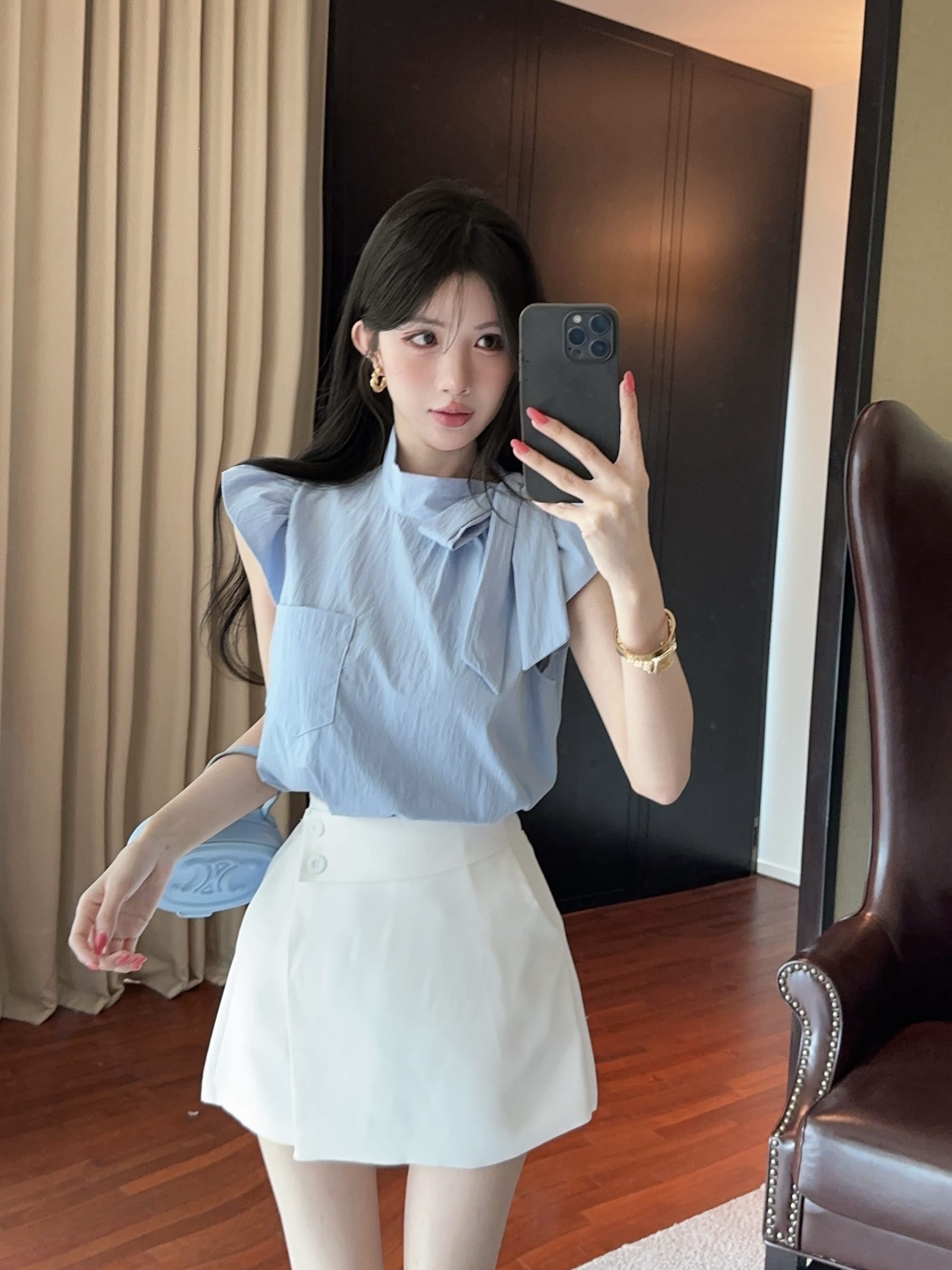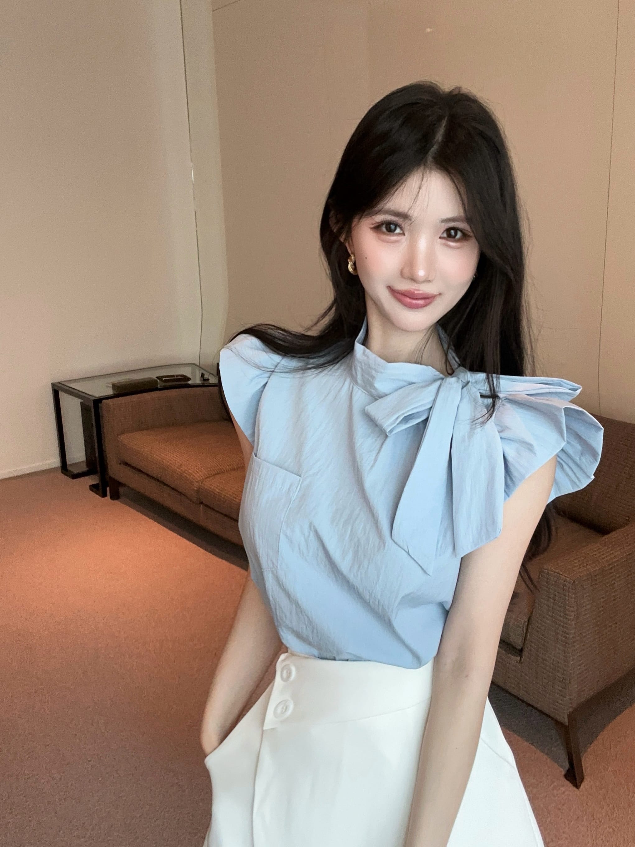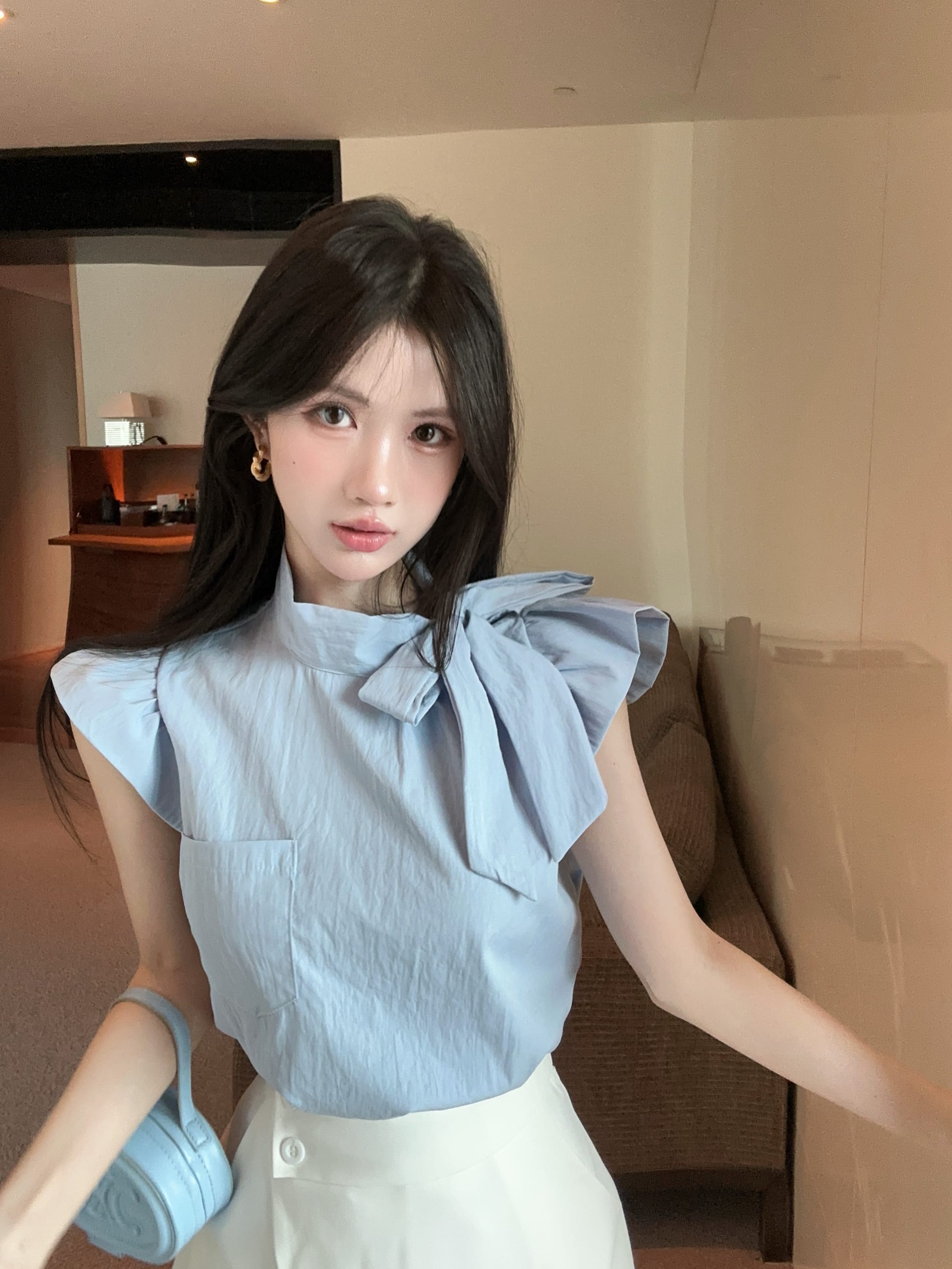 실사 정가 디자인 센스 찢어진 부분 어깨끈 페이크 레이어드 디자인 별 몸매 가꾸기 슬림해 보이는 쇼트 스타일 맨위