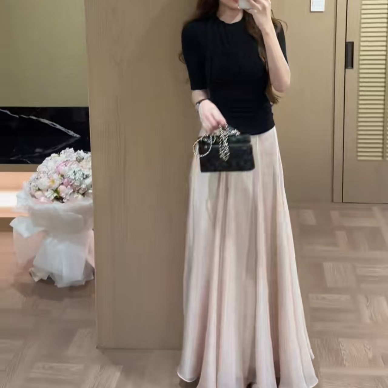 몸매 가꾸기 레이스업 민소매 맨위 중간 소매 맨위 디자인 센스 패션 다용도 슬림해 보이는 반신 스커트 거즈 스커트 세트