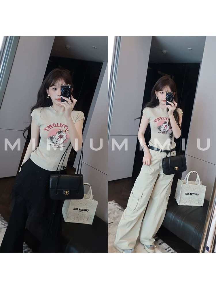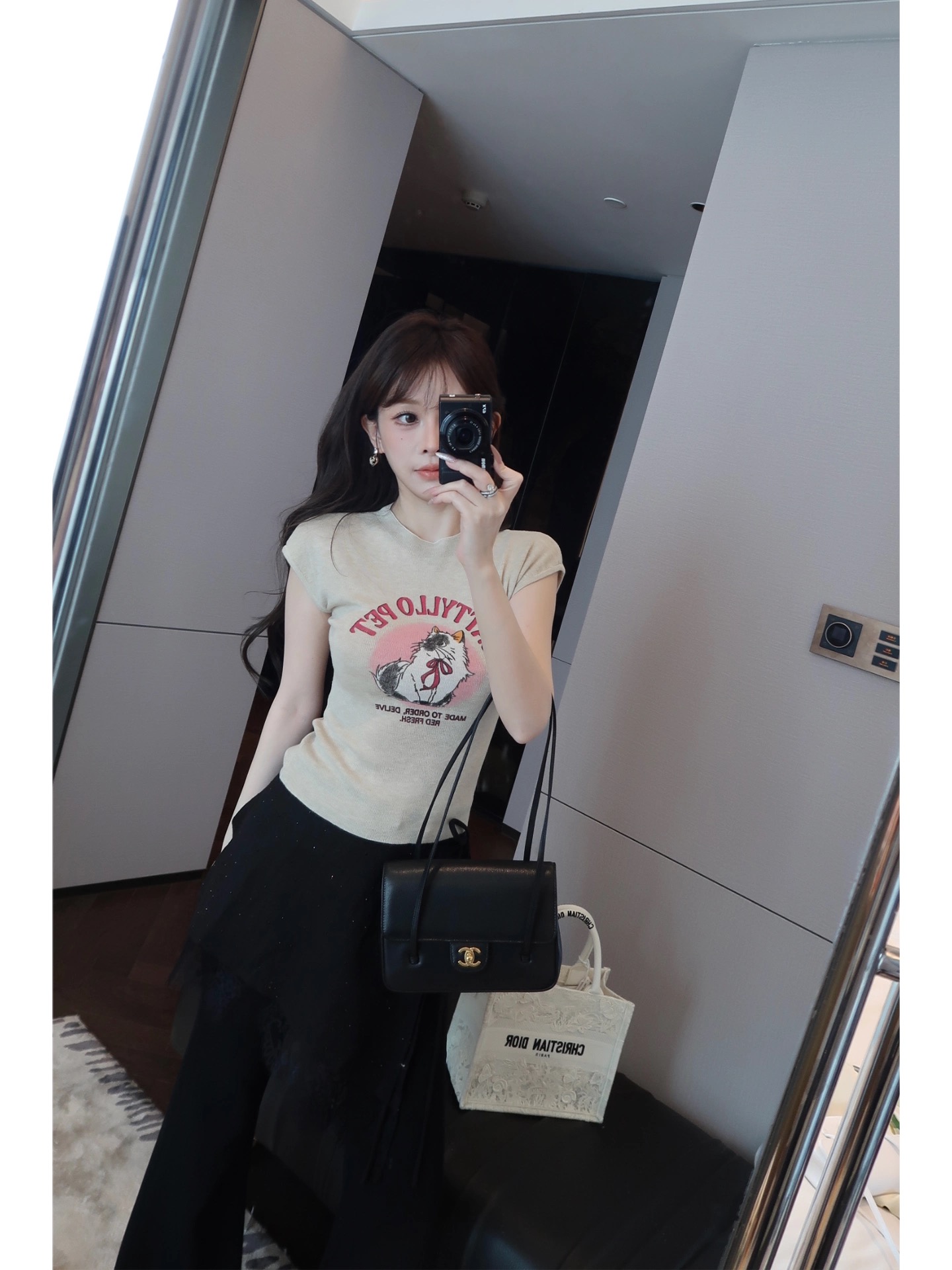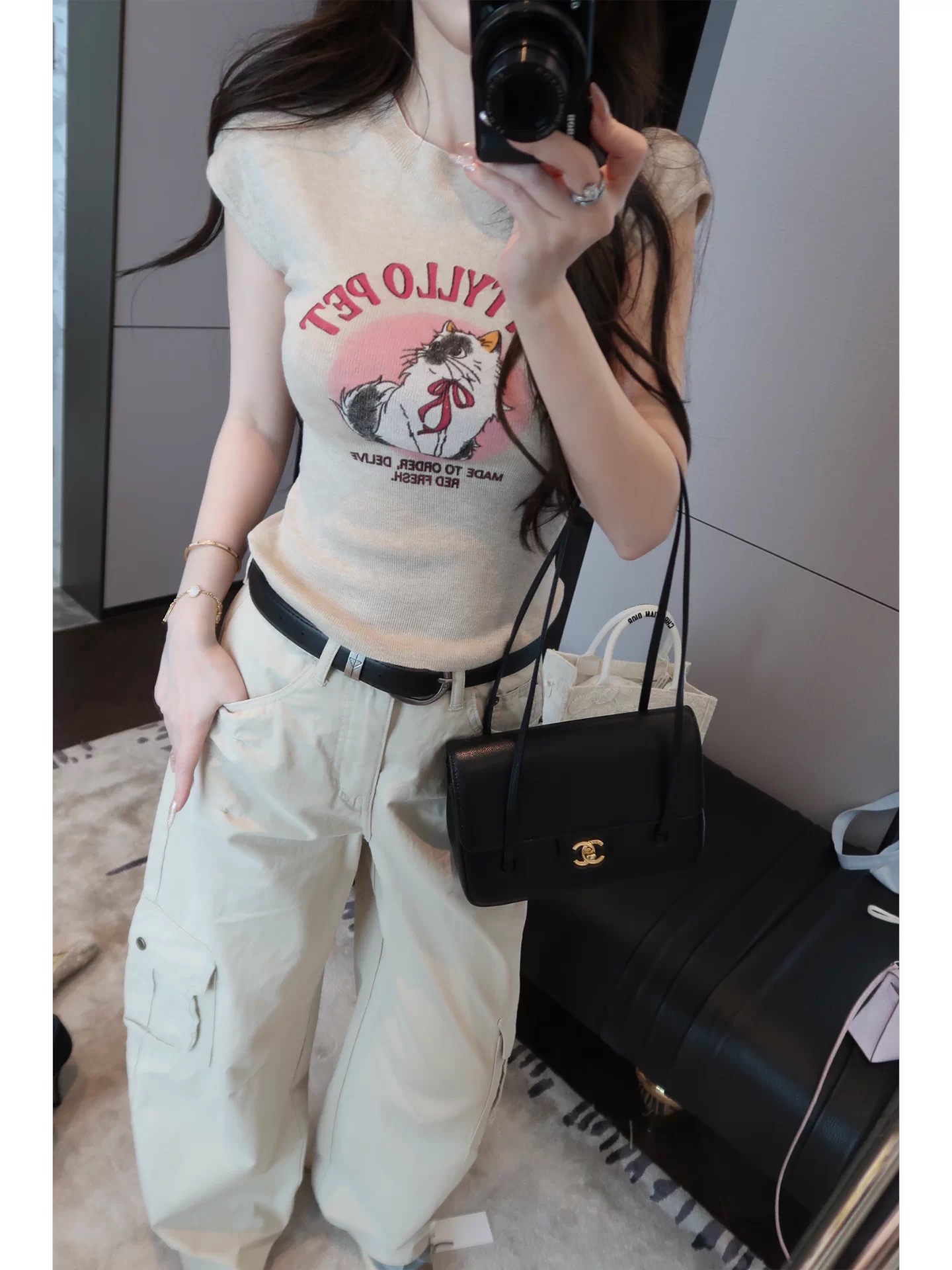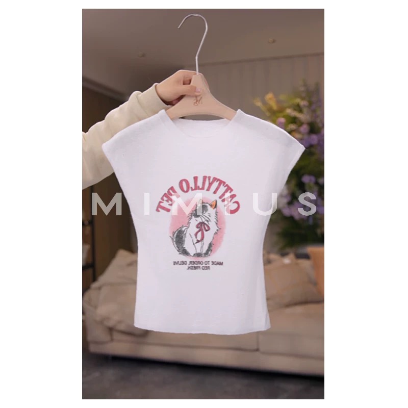 도파민 착용 가져 가라. 고양이 프린트 황색 긍정적 인 어깨 얼음 실크 니트 반팔 티셔츠 여성 여름 몸매 가꾸기 쇼트 스타일 맨위