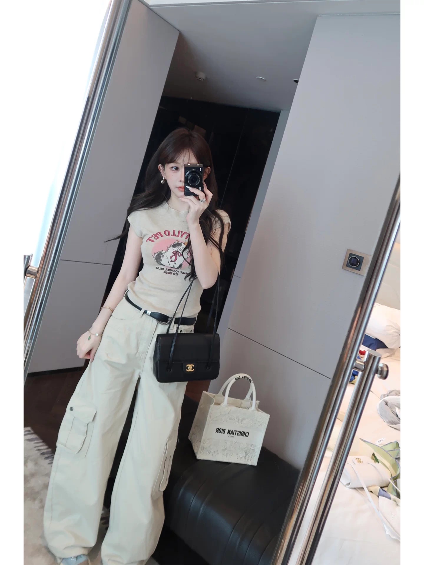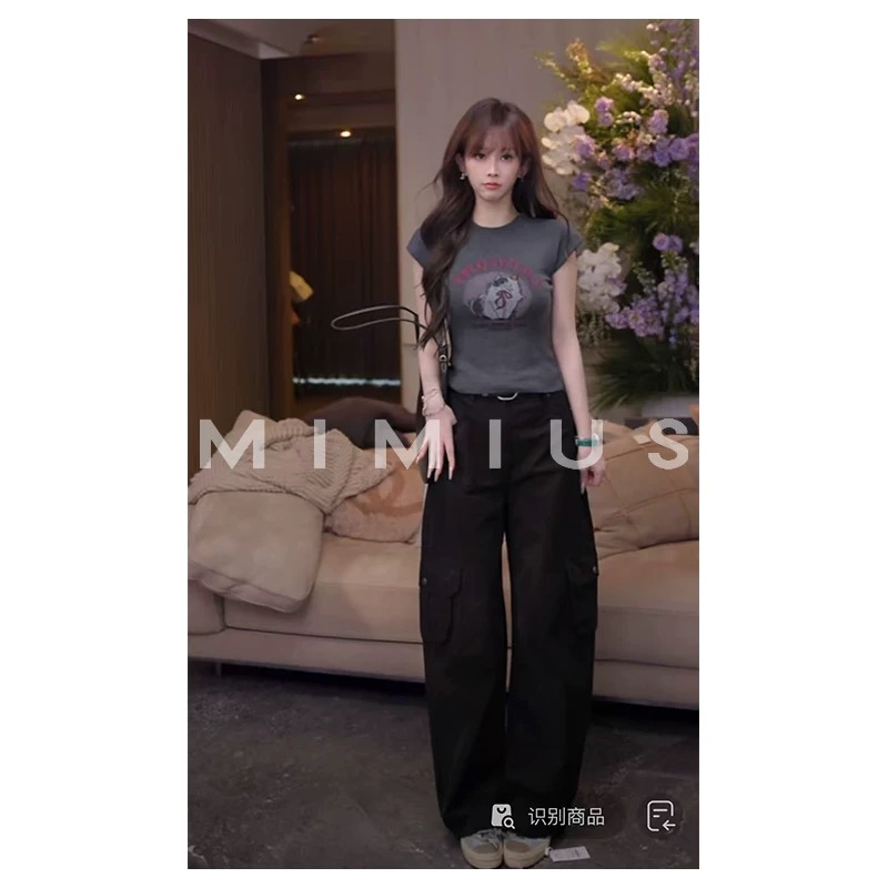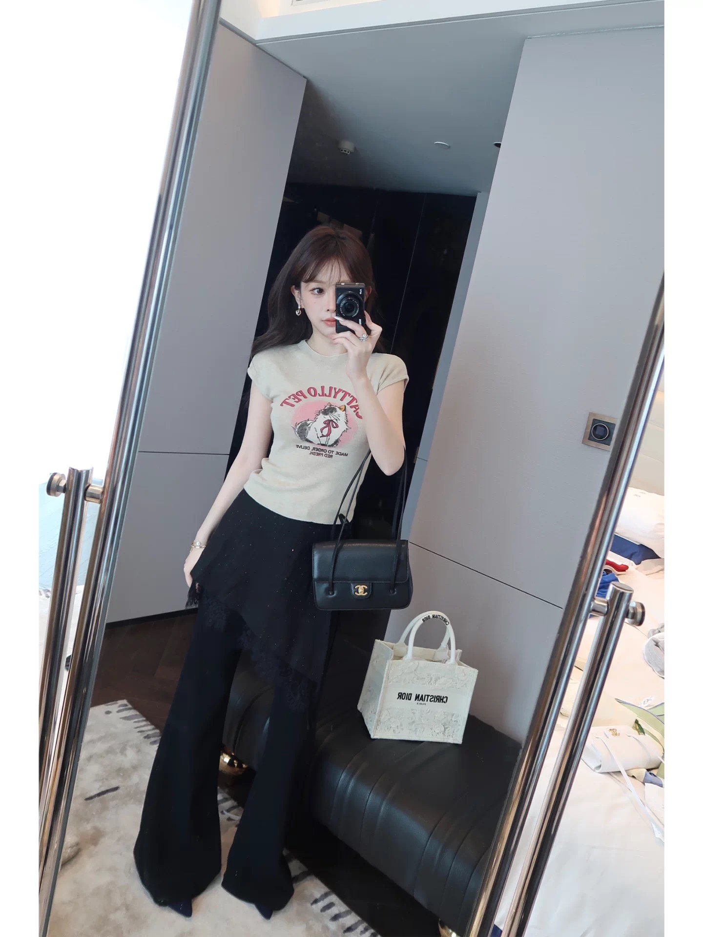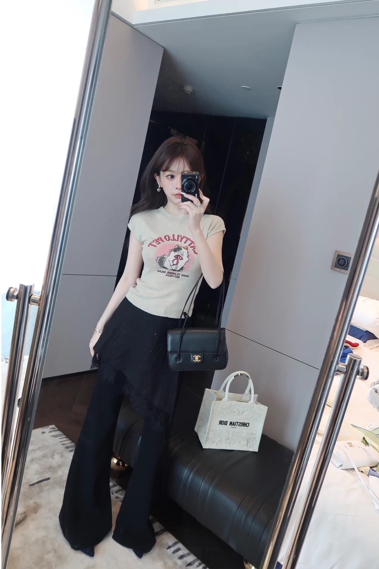 도파민 착용 가져 가라. 고양이 프린트 황색 긍정적 인 어깨 얼음 실크 니트 반팔 티셔츠 여성 여름 몸매 가꾸기 쇼트 스타일 맨위