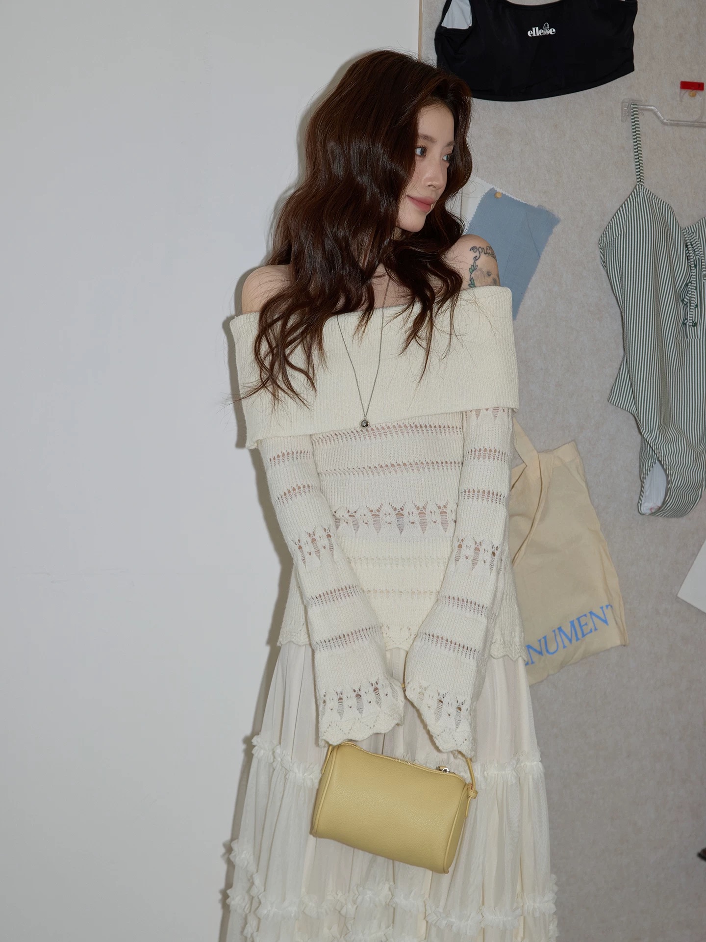 시끄러운 홈 한 부서 살구 색상 오프숄더 맨위 여성 봄 고급 센스 품격 캐주얼 몸매 가꾸기 오프숄더 니트 스웨터