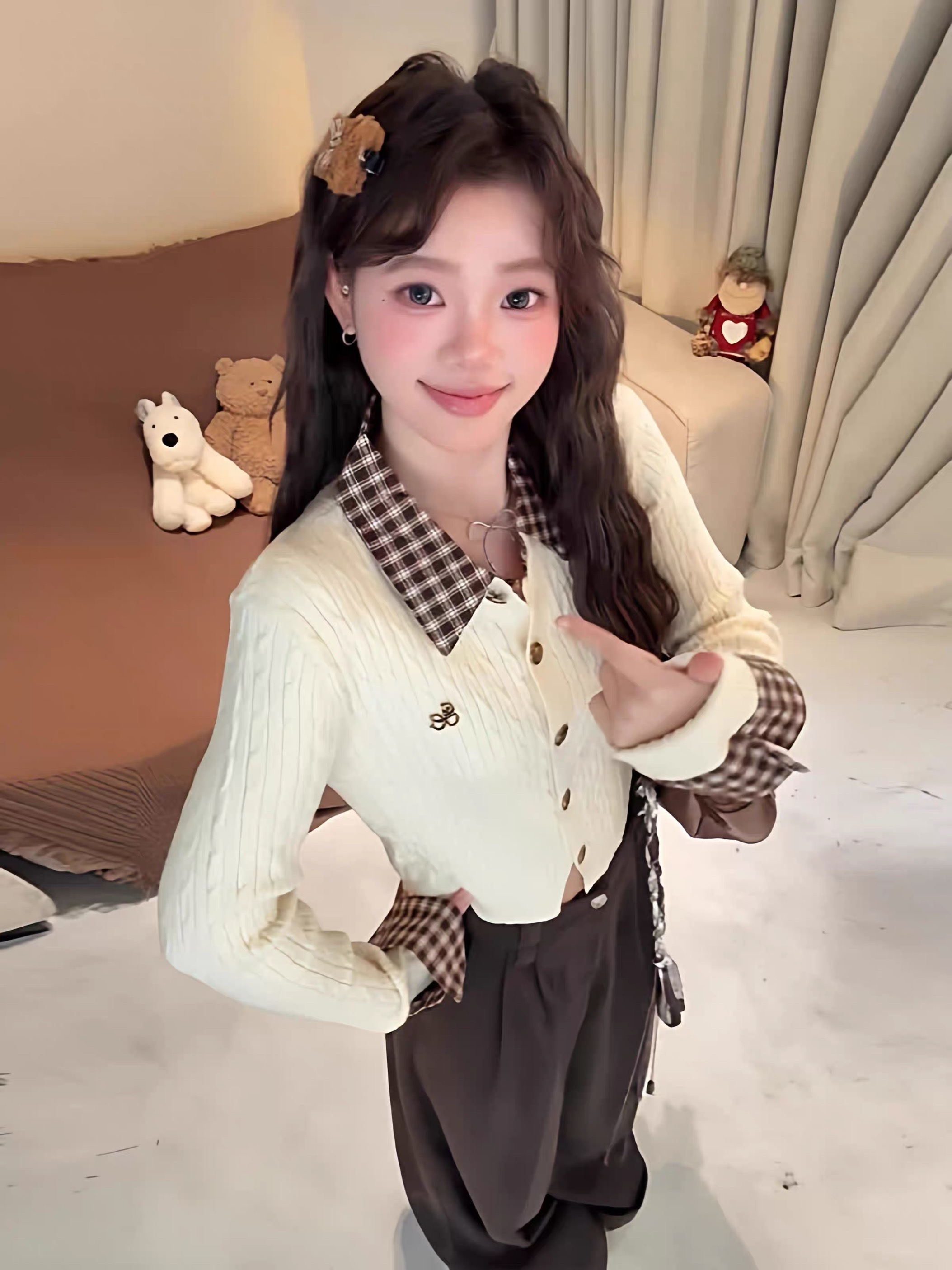 한 부서 학원 스타일 폴로 칼라 꽈배기 긴팔 니트 오픈 가디건 여성 가을 겨울 체크무늬 패치워크 페이크 레이어드 몸매 가꾸기 맨위 트렌디