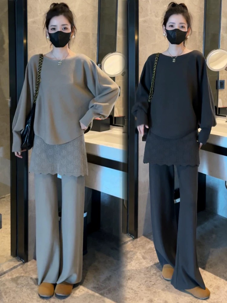 패션 세트 여성 2025 겨울 새로운 외국 가스 배트윙 소매 니트 스웨터 방귀 커튼 와이드 레그 팬츠 디자인 센스 투피스 세트