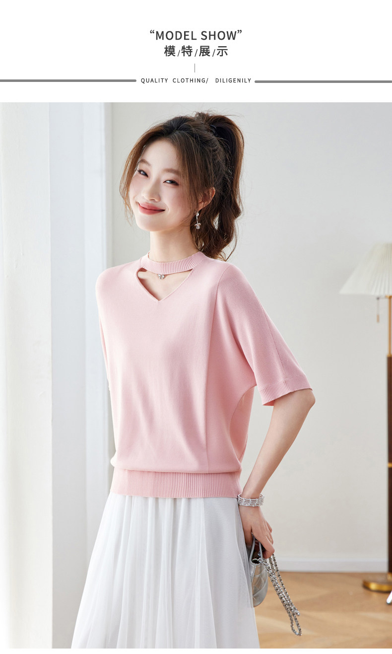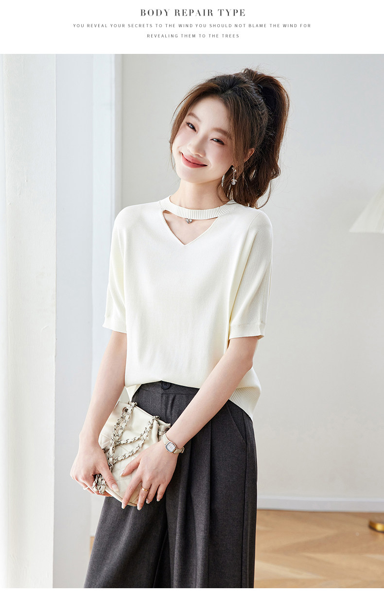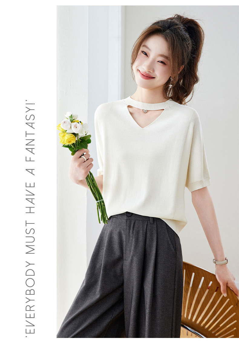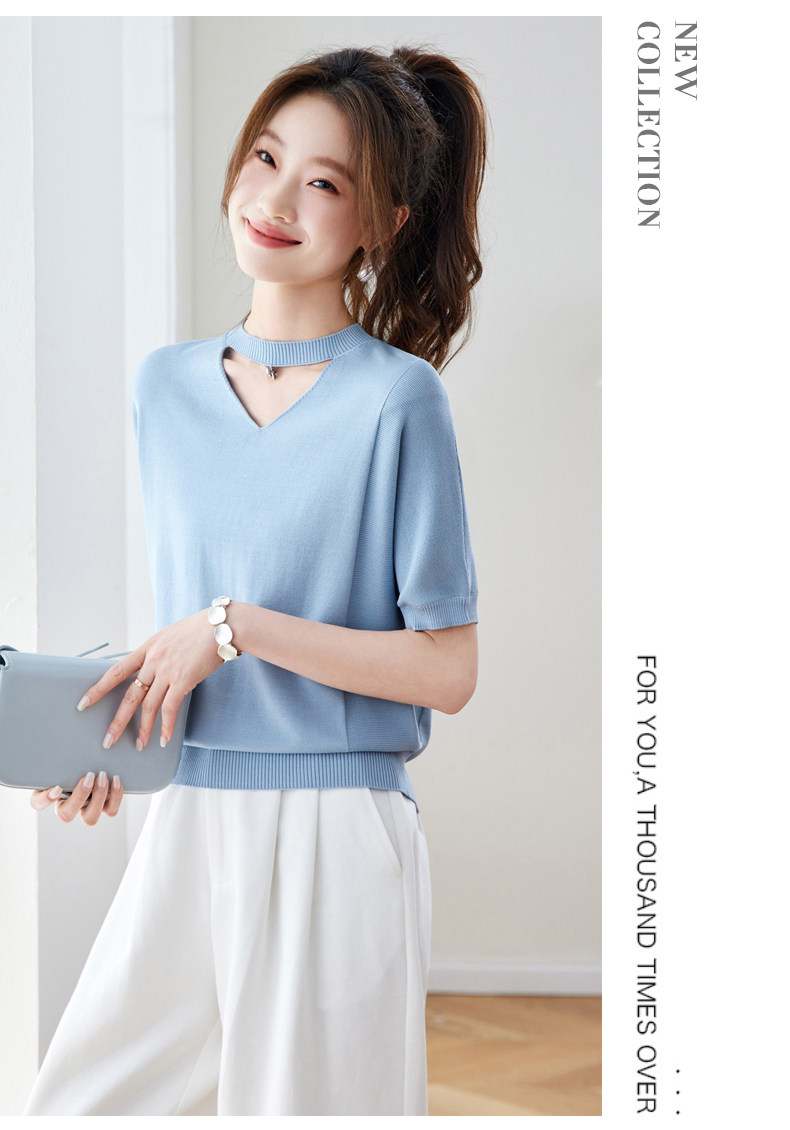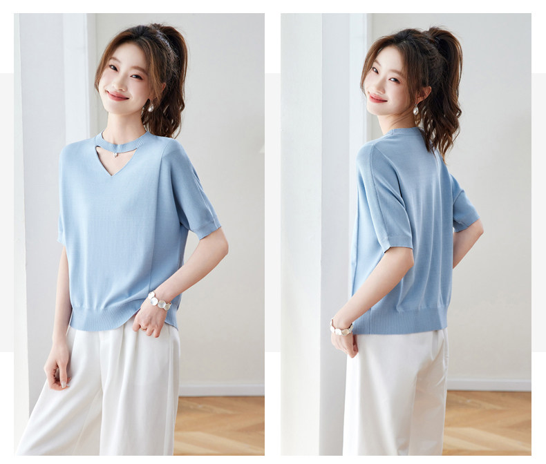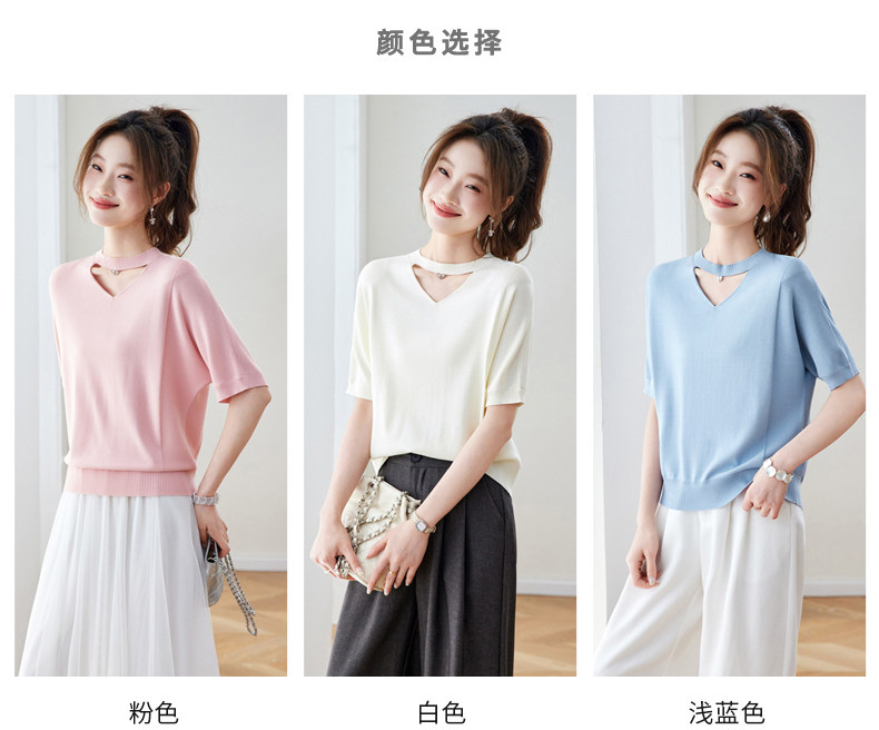 V넥 얼음 마 실크 반팔 티셔츠 여성 여름 2026 새로운 루즈핏 슬림해 보이는 얇은 스타일 품격 연령 감소 니트 스웨터 맨위