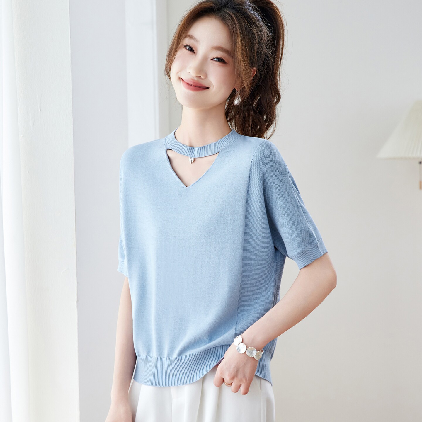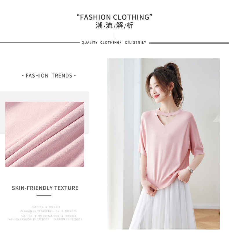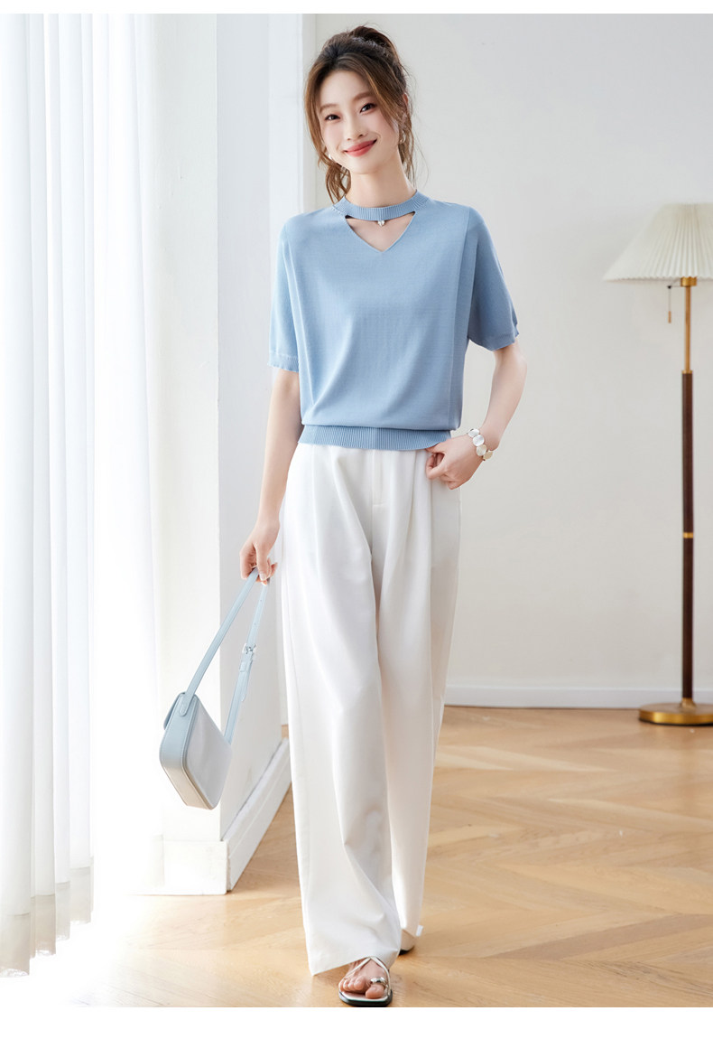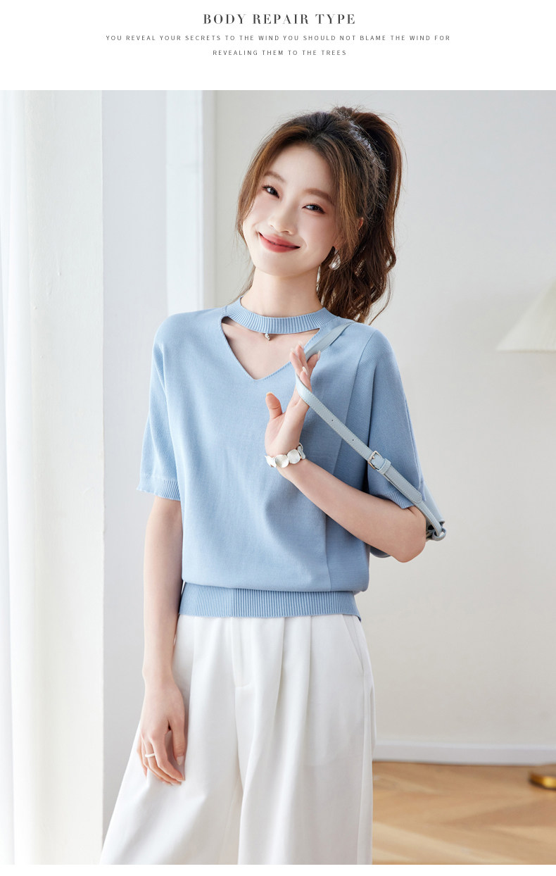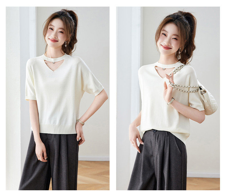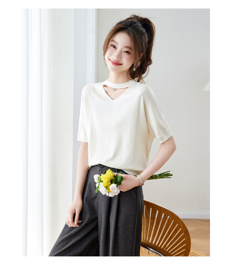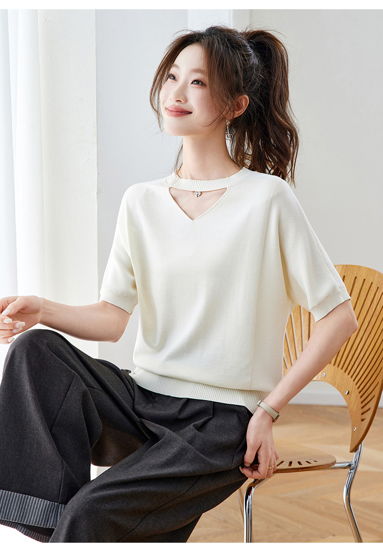 V넥 얼음 마 실크 반팔 티셔츠 여성 여름 2026 새로운 루즈핏 슬림해 보이는 얇은 스타일 품격 연령 감소 니트 스웨터 맨위
