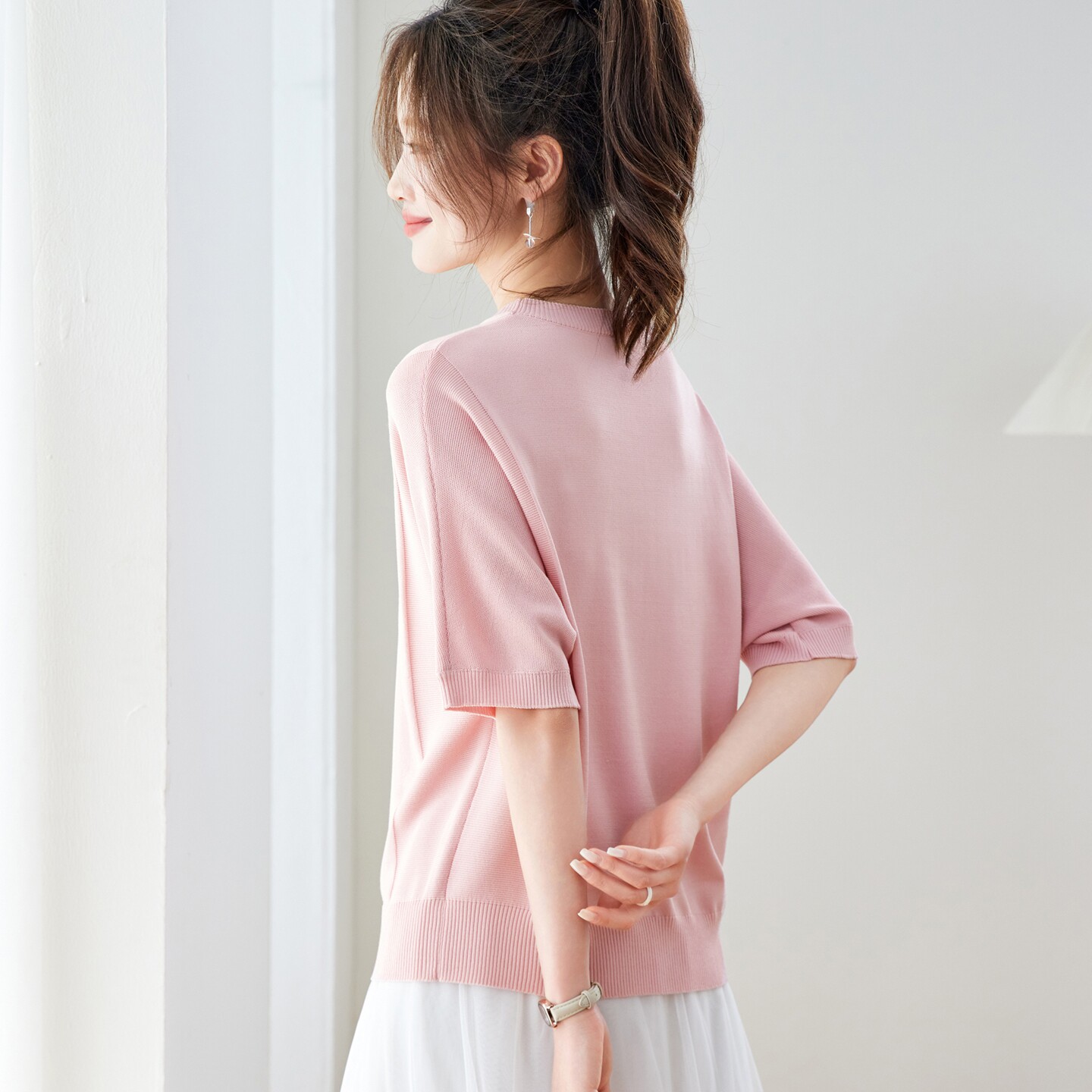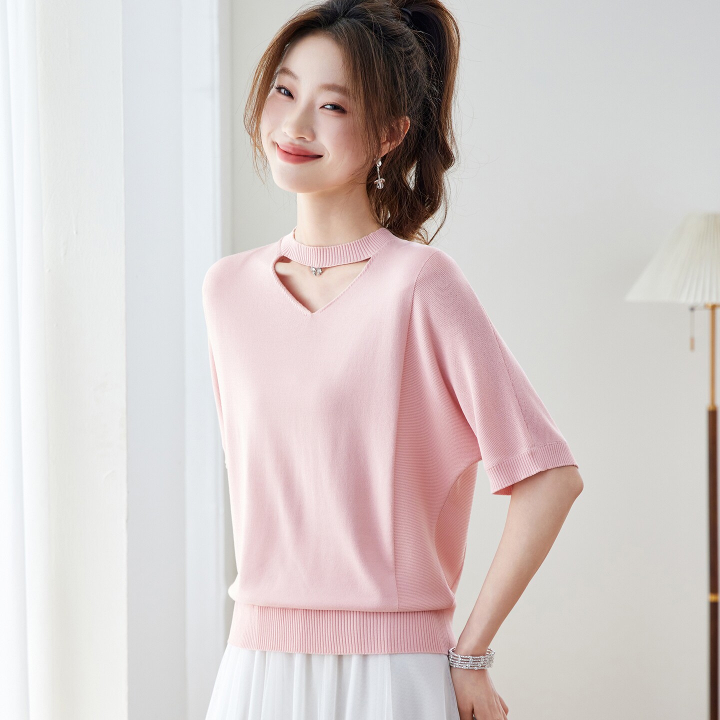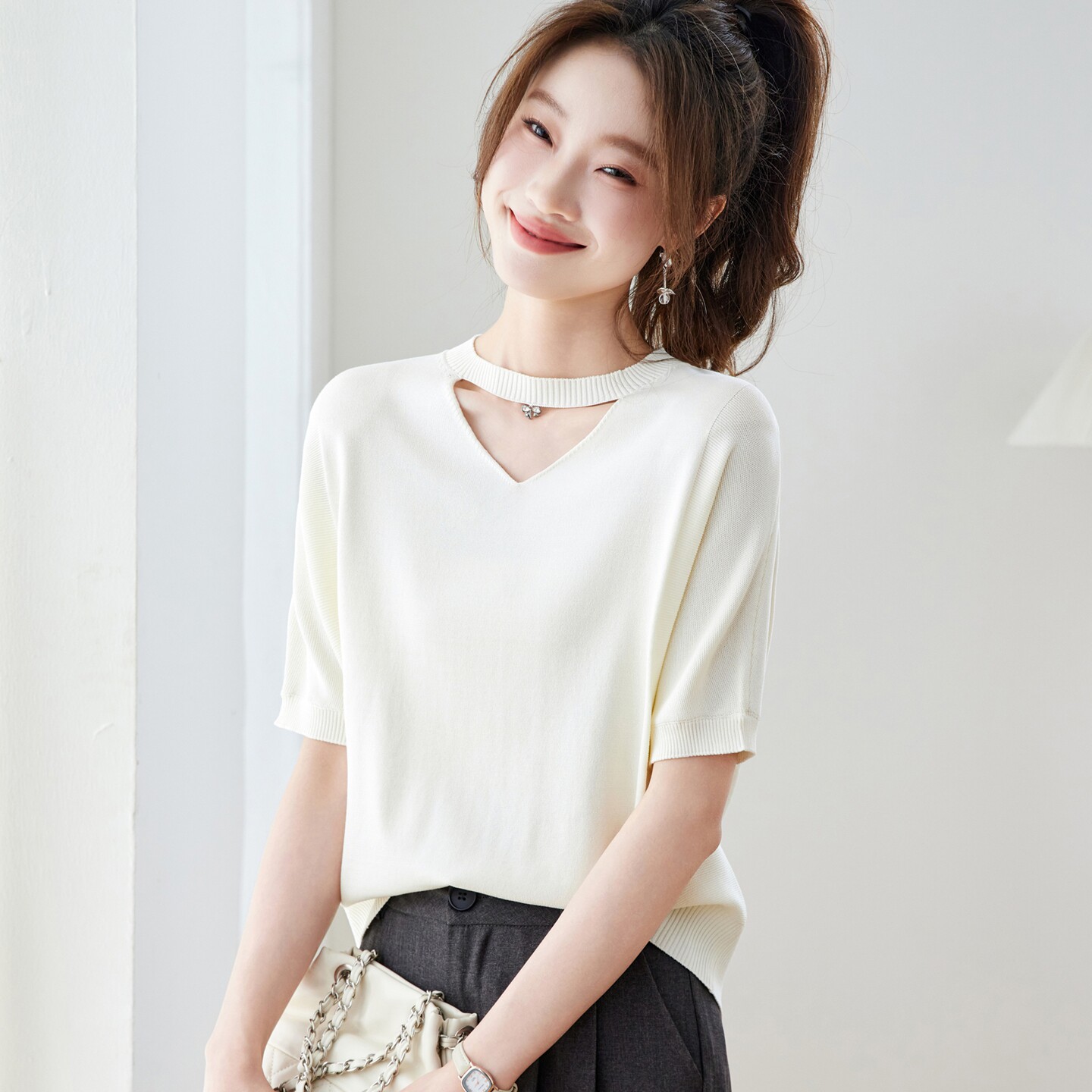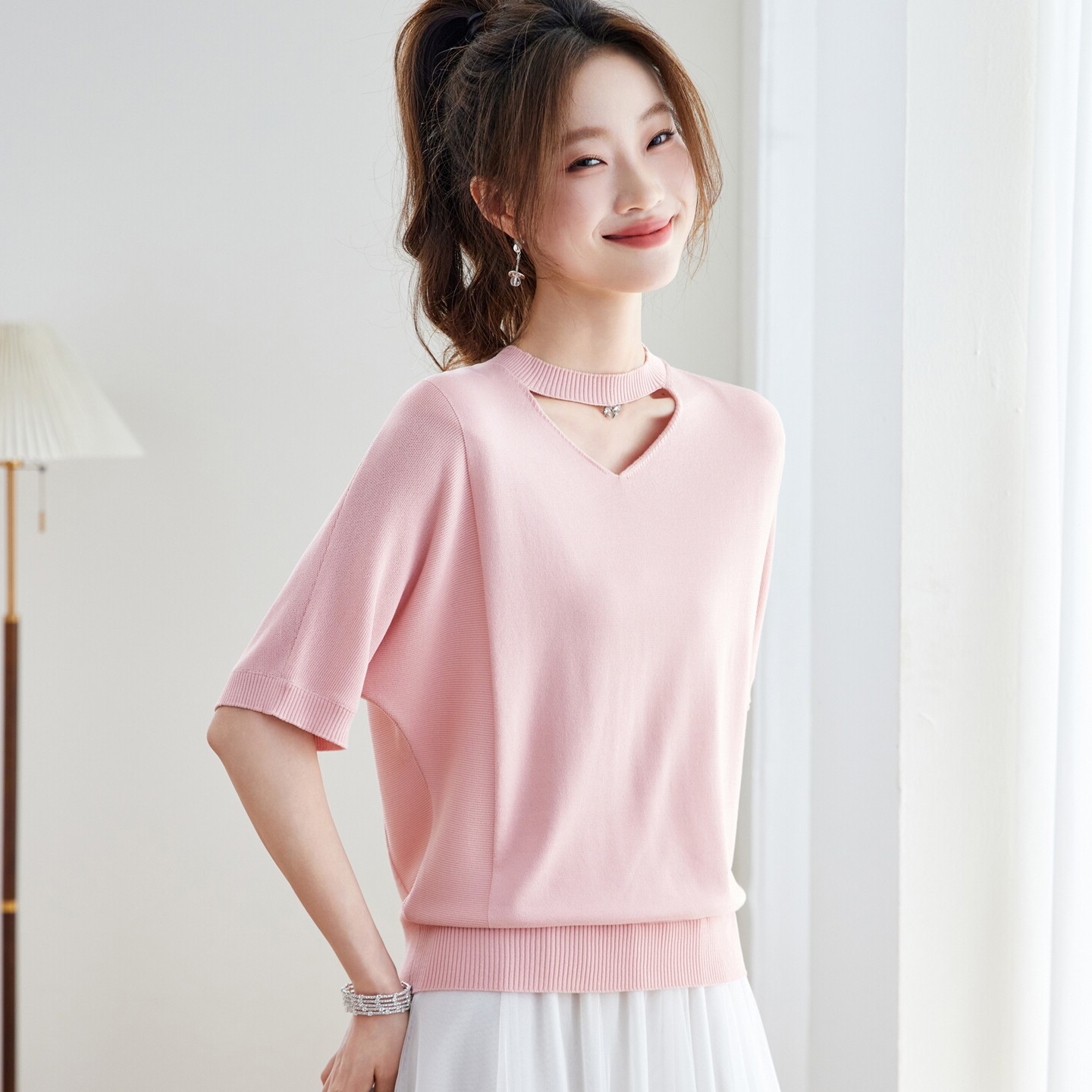 V넥 얼음 마 실크 반팔 티셔츠 여성 여름 2026 새로운 루즈핏 슬림해 보이는 얇은 스타일 품격 연령 감소 니트 스웨터 맨위