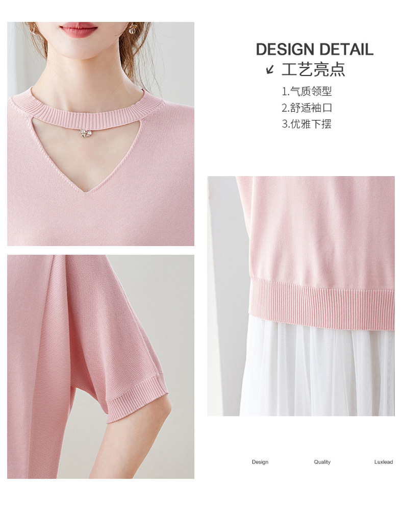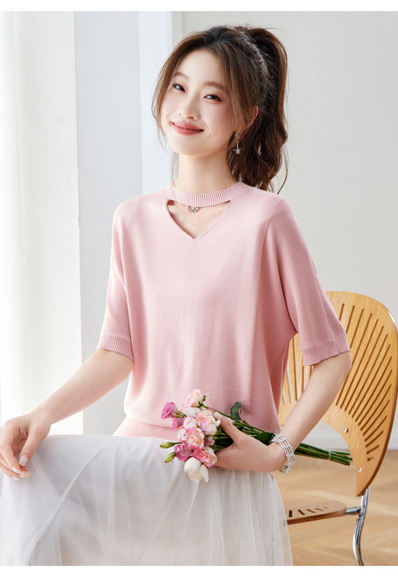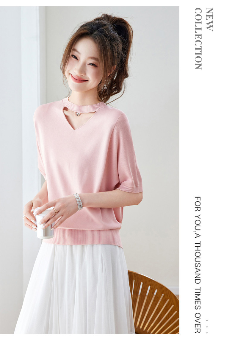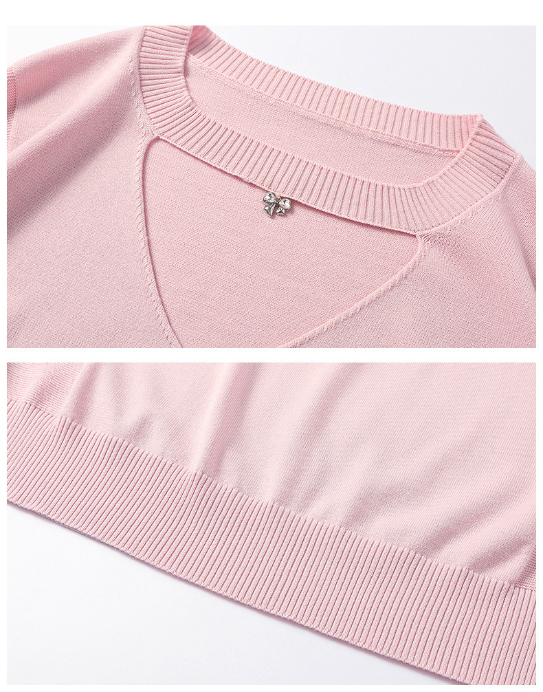 핑크색 레이스 조각 V넥 니트 반팔 티셔츠 여성 홀로우 아웃 쇼트 스타일 한 부서 아름다운 작은 맨위