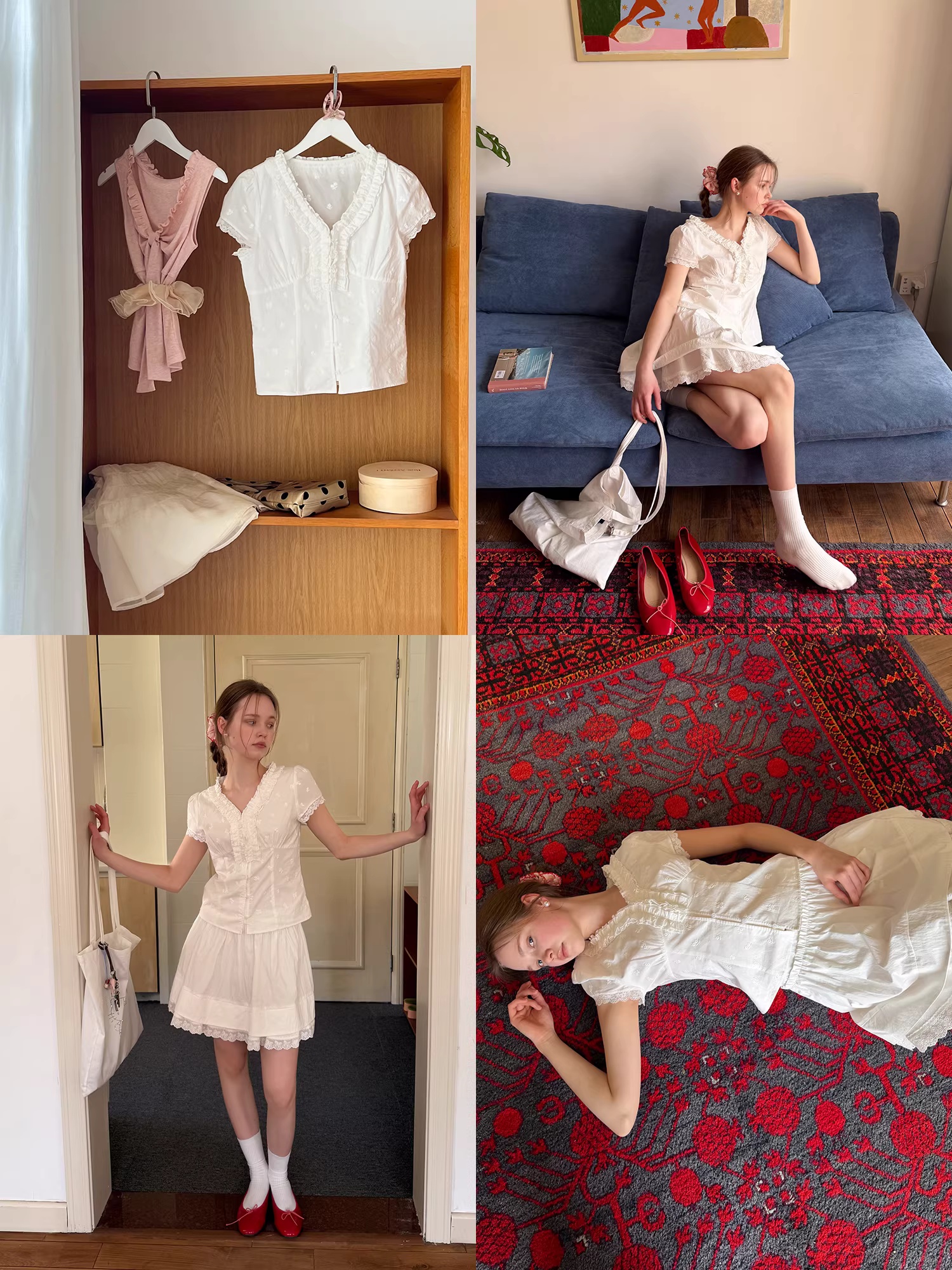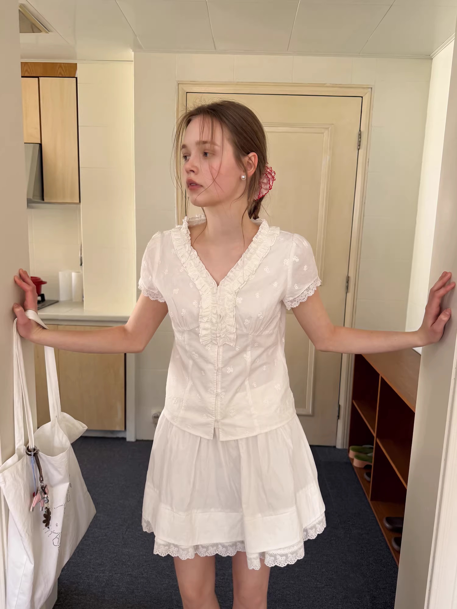페이크 레이어드 프릴 장식 도트 무늬 반팔 셔츠 루즈핏 슬림해 보이는 연령 감소 V넥 인형 셔츠 맨위