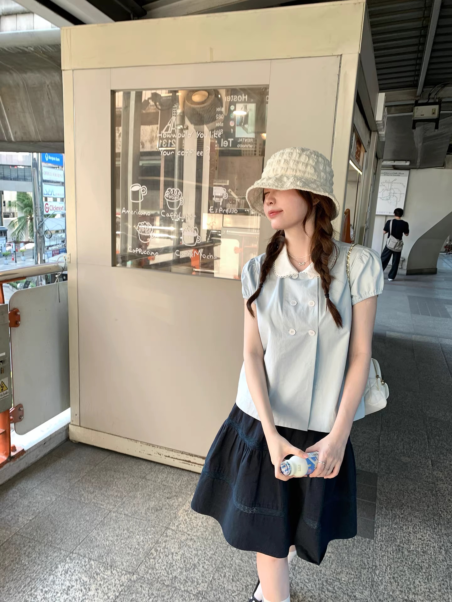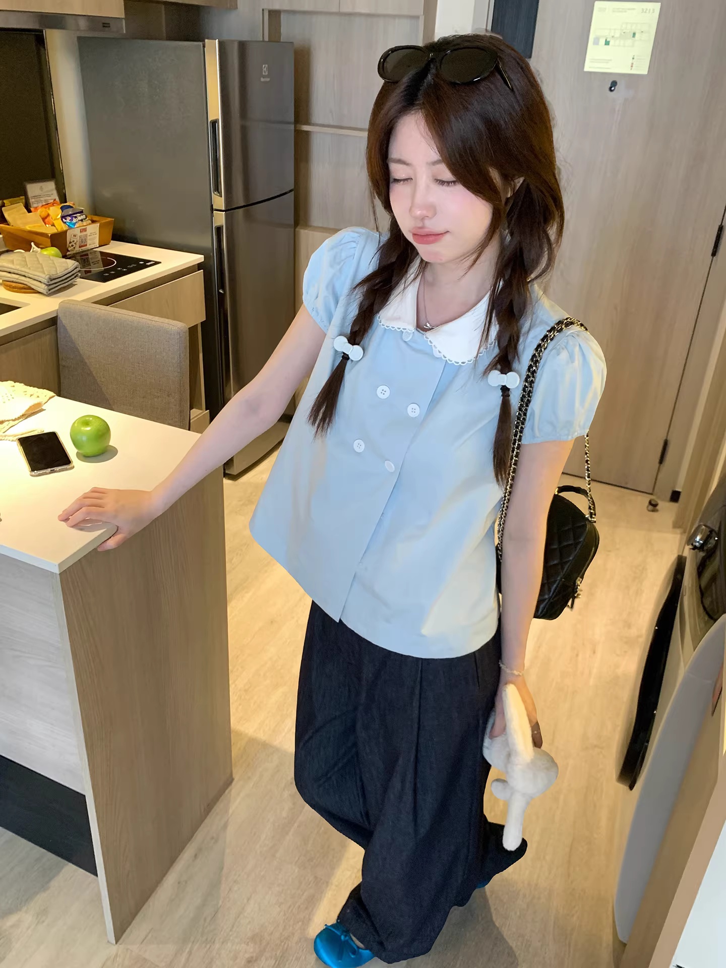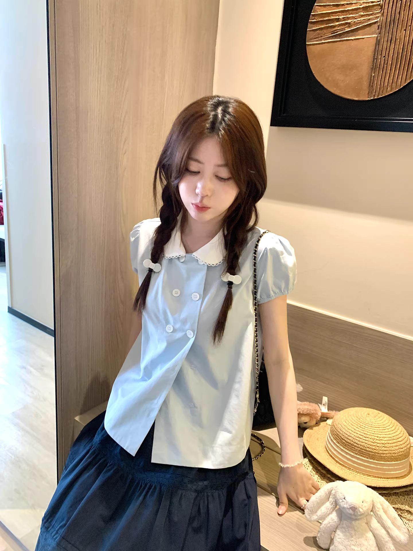 creamsu 시리아 화이트 화이트 베이비 칼라 쇼트 스타일 여성 셔츠 여름 달콤함 허리 수축 긍정적 인 어깨 다용도 반팔 맨위