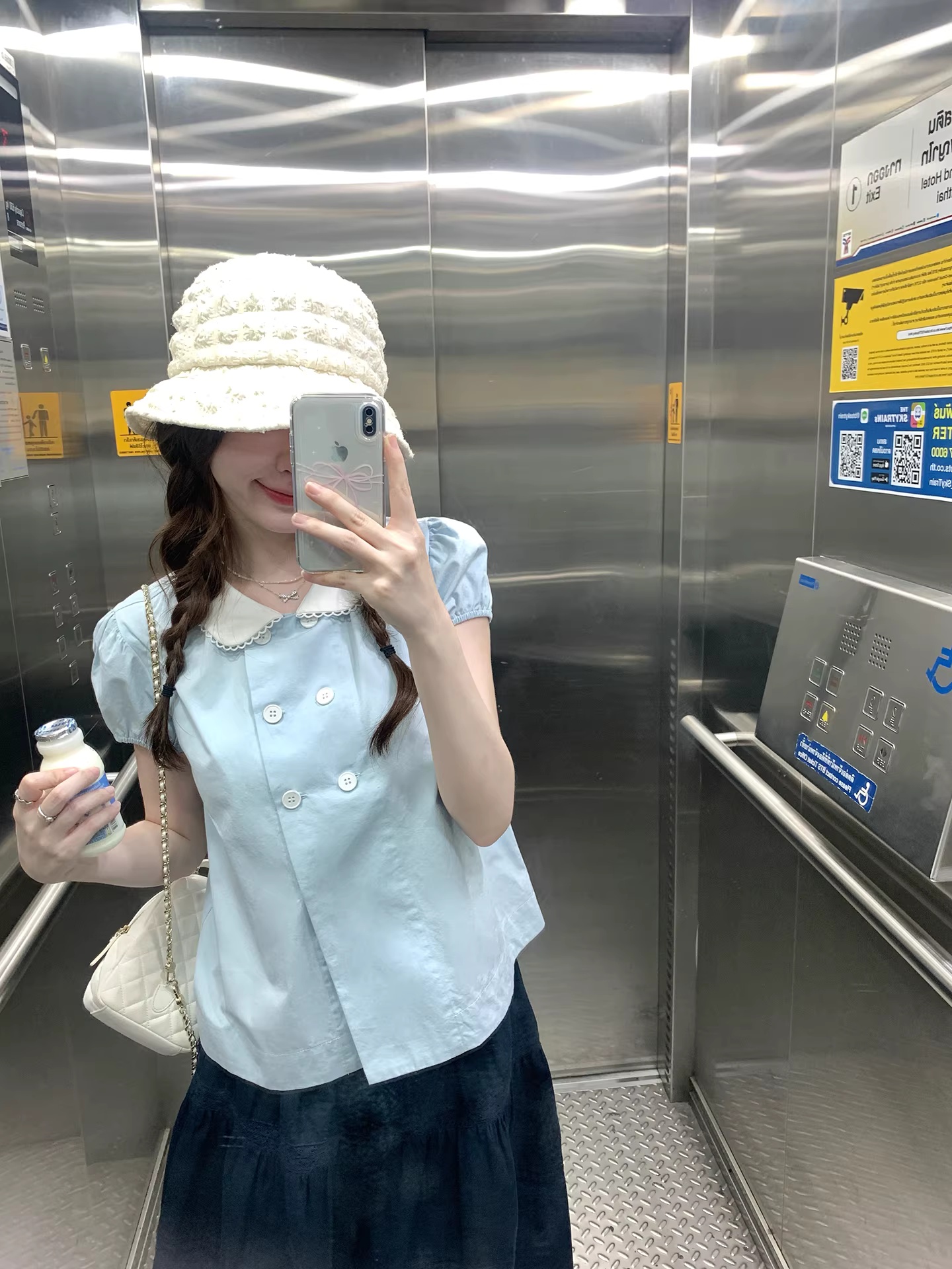 goo goo eyes 라이 경기 서울 주간 실크 코튼 이중 버튼 반팔 인형 셔츠 맨위 여성 여름 한 마디 진자 셔츠