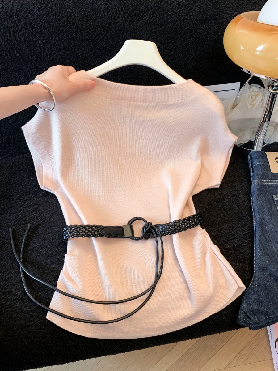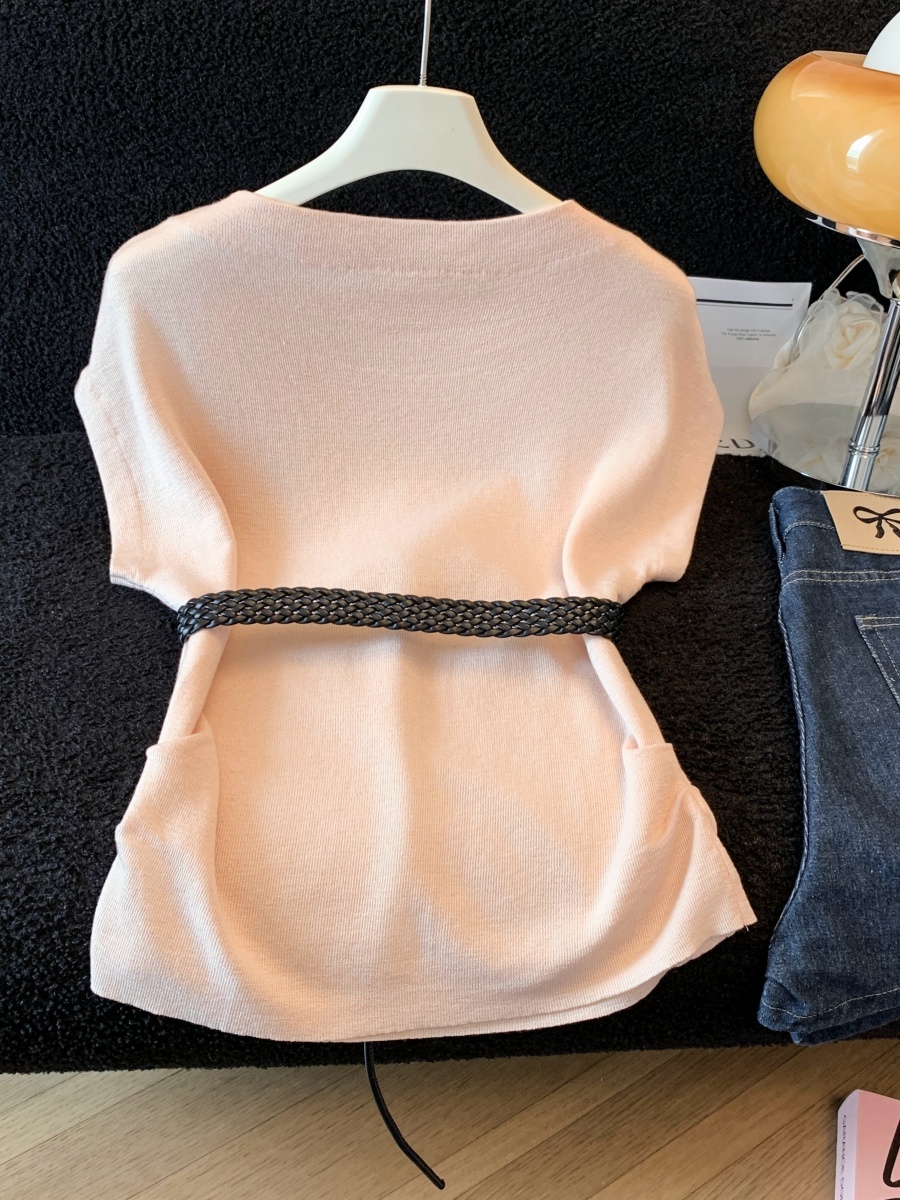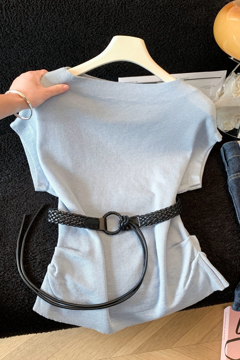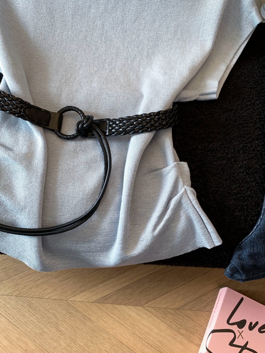 실사 한 부서 Chic 연령 감소 배트윙 소매 라운드 넥 오프숄더 니트 느긋한 바람 품격 패션 고급 센스 벨트 포함