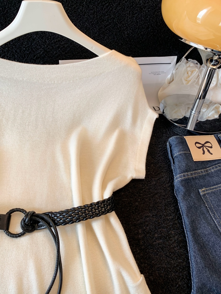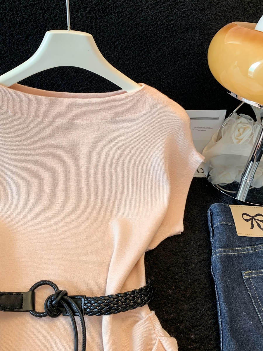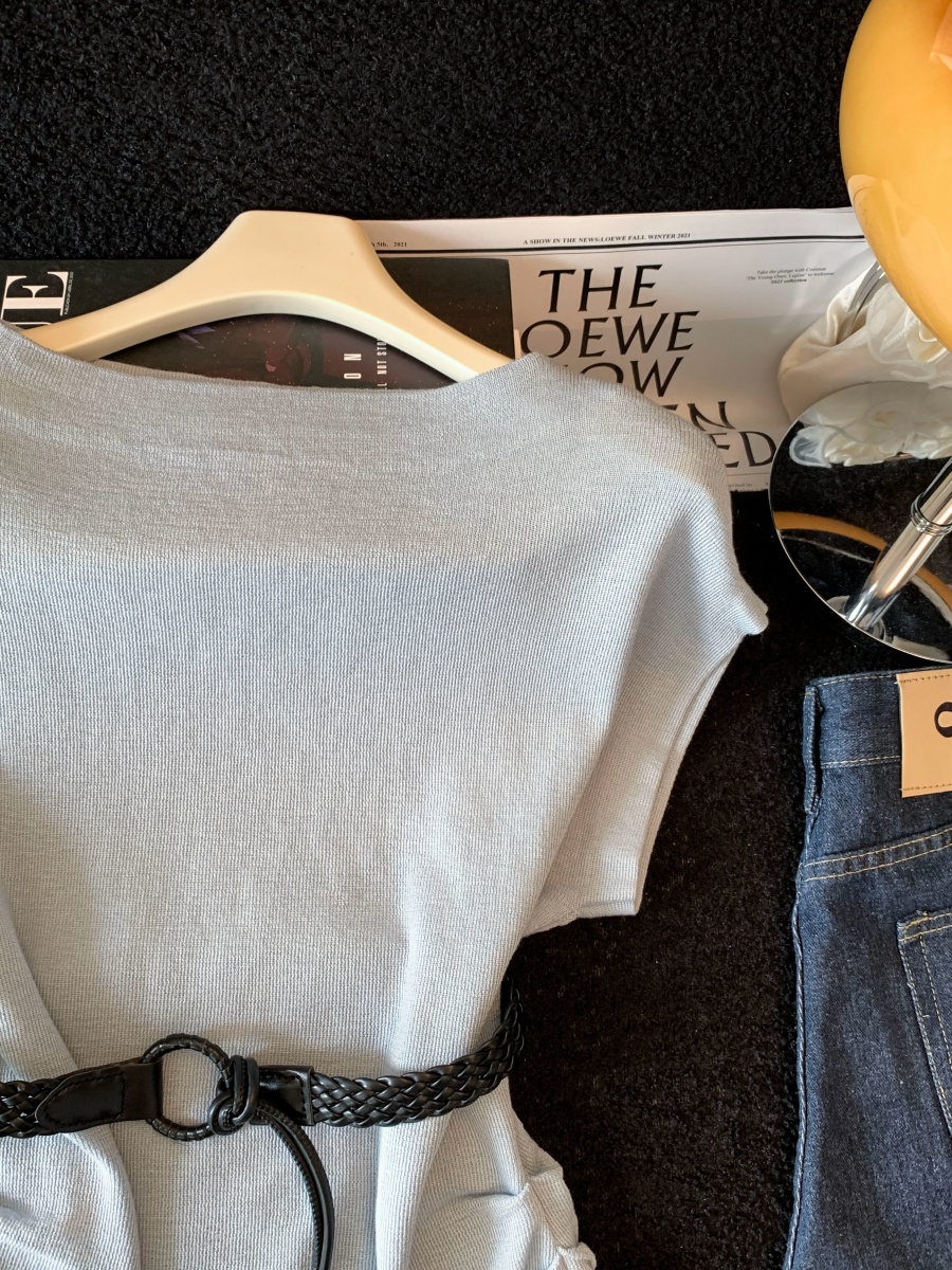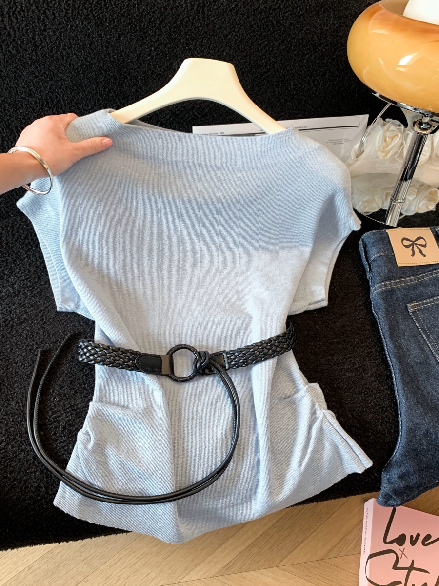 실사 한 부서 Chic 연령 감소 배트윙 소매 라운드 넥 오프숄더 니트 느긋한 바람 품격 패션 고급 센스 벨트 포함