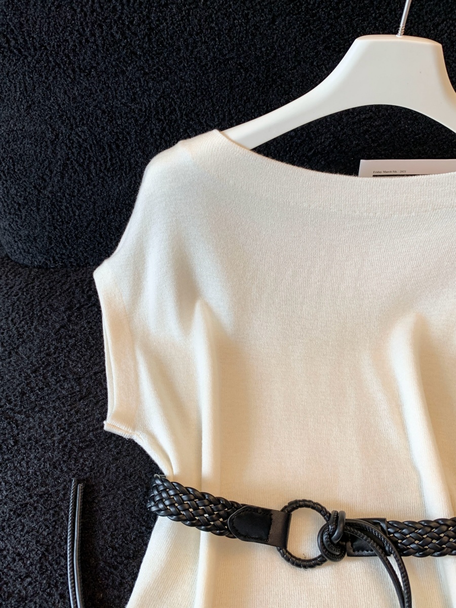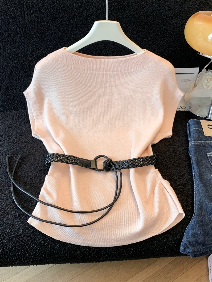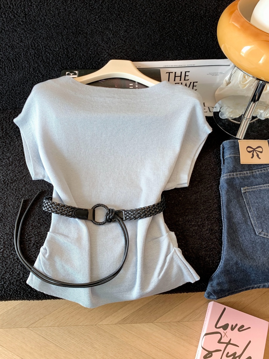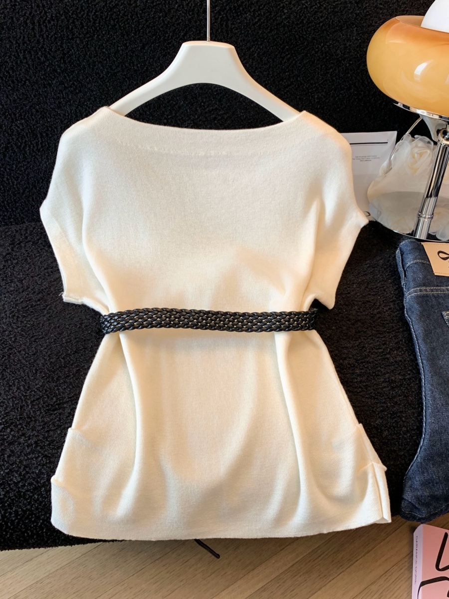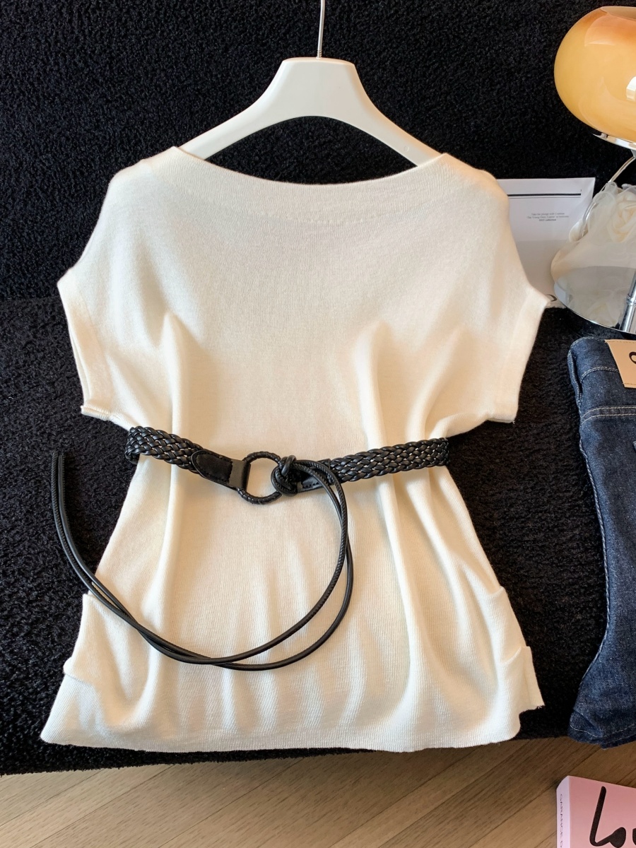 실사 한 부서 Chic 연령 감소 배트윙 소매 라운드 넥 오프숄더 니트 느긋한 바람 품격 패션 고급 벨트 포함