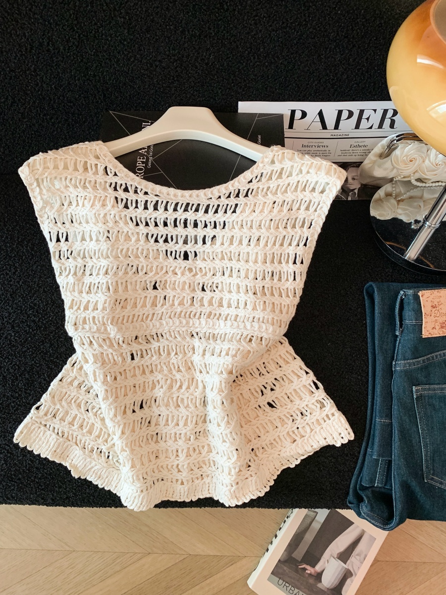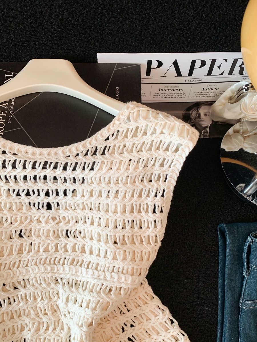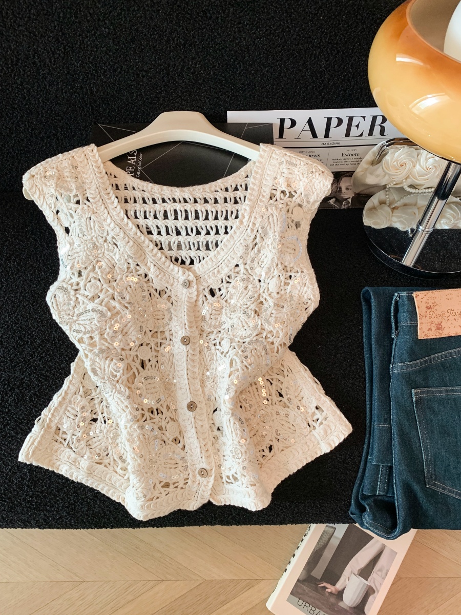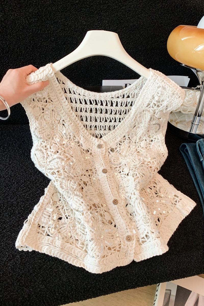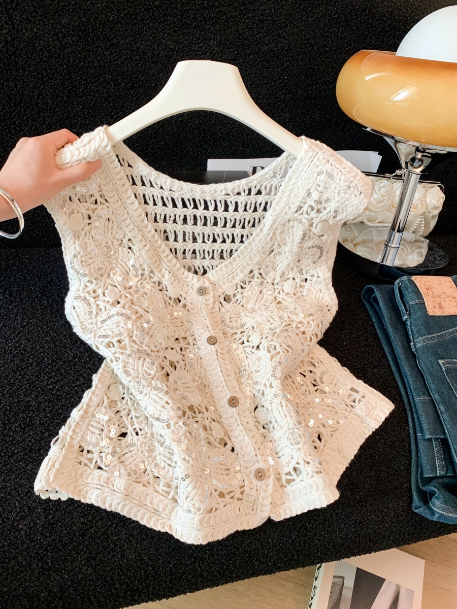 실사 한 부서 chic Chic 여름 휴가 외출용 홀로우 아웃 니트 민소매 맨위 여성 새로운 외출용 레이스