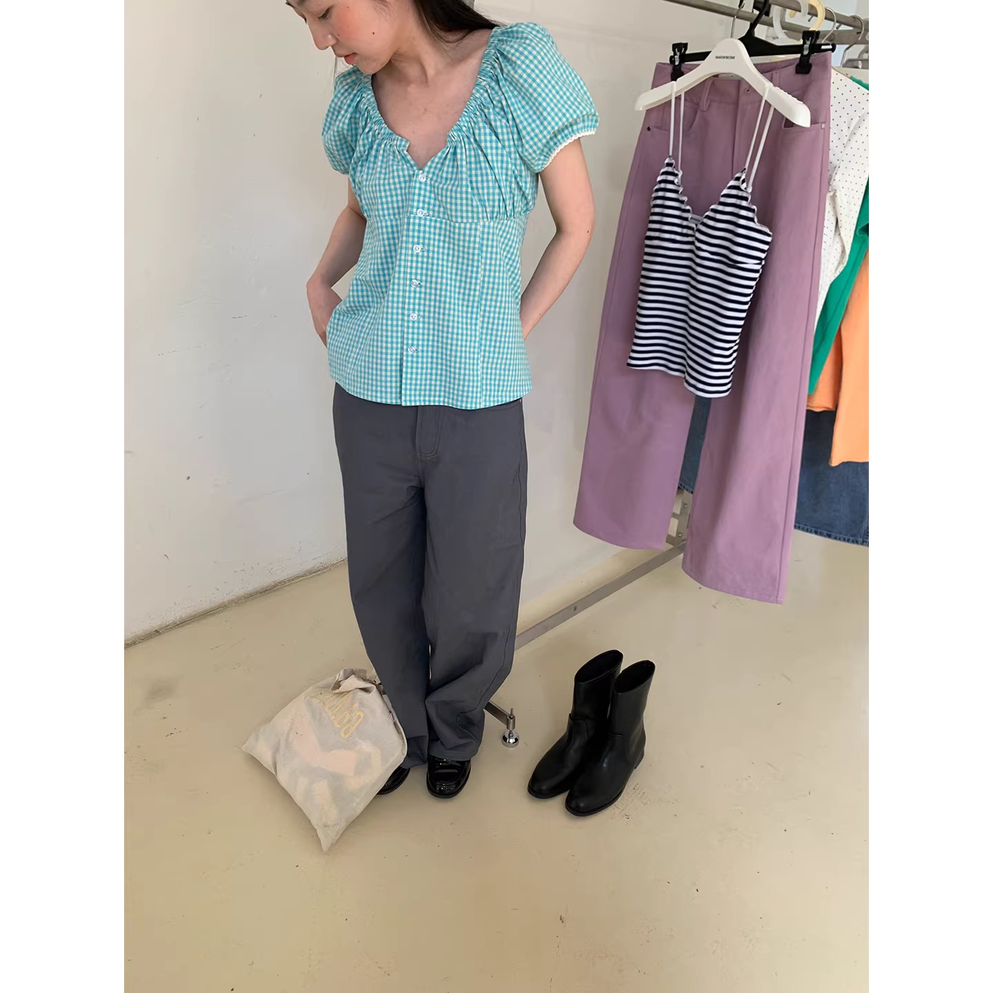 understress 체크무늬 폴로 칼라 몸매 가꾸기 반팔 셔츠 디자인 센스 여름 캐주얼 허리 수축 슬림해 보이는 품격