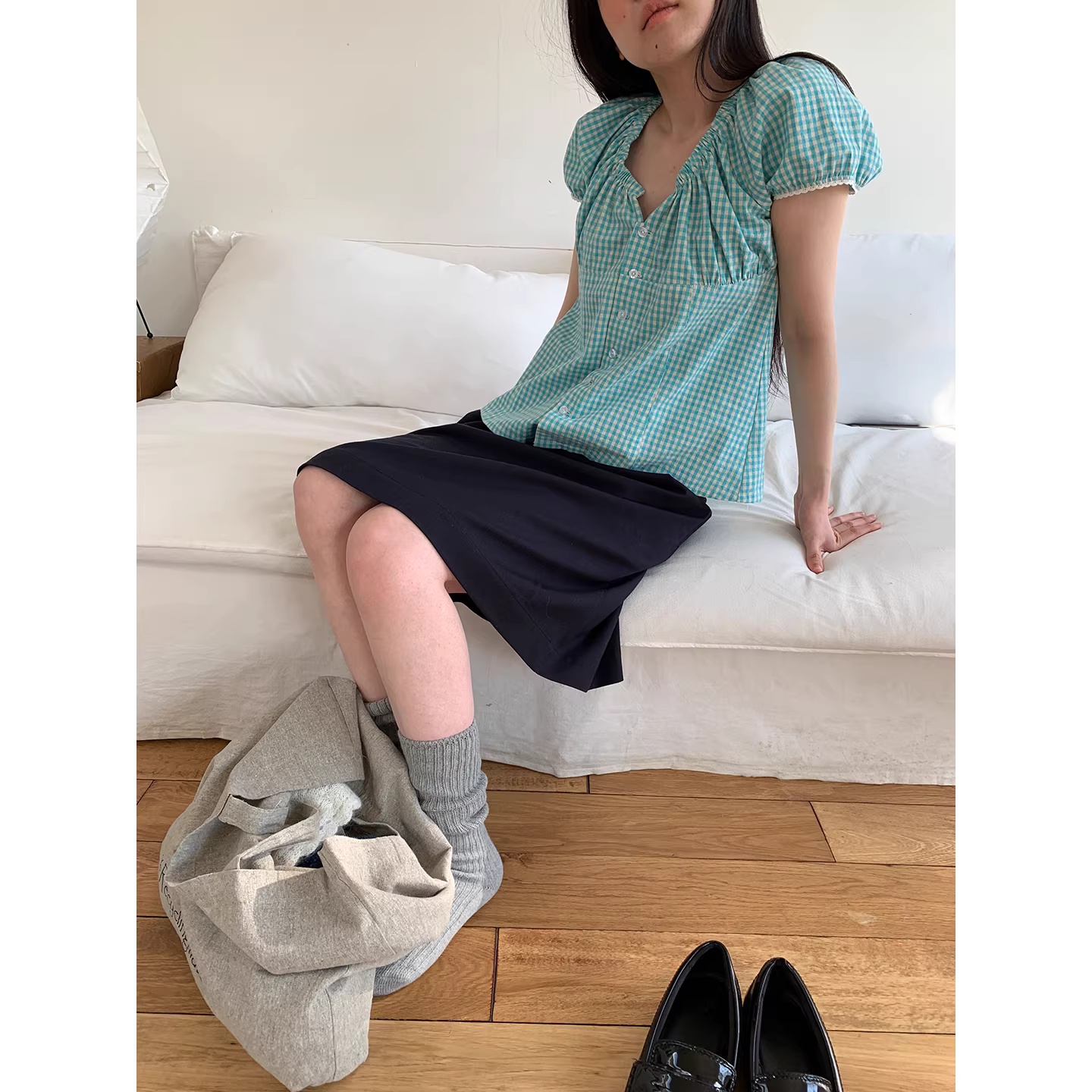 프랑스식 프릴 반팔 여성 셔츠 여름 파란색 체크무늬 셔츠 허리 수축 긍정적 인 어깨 의류