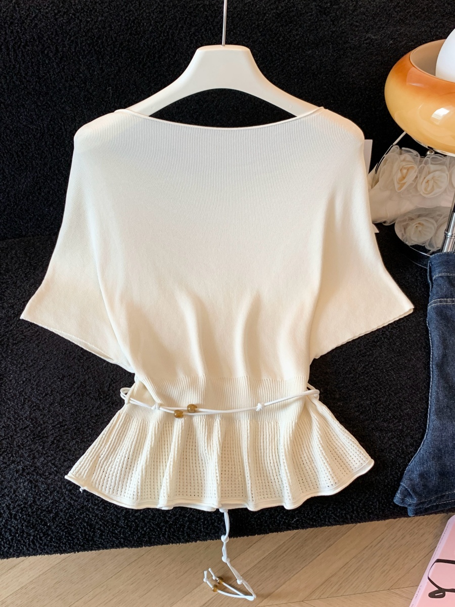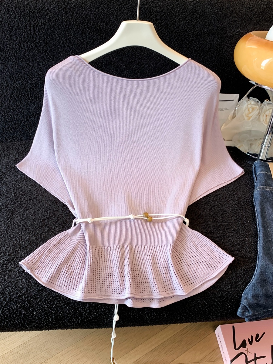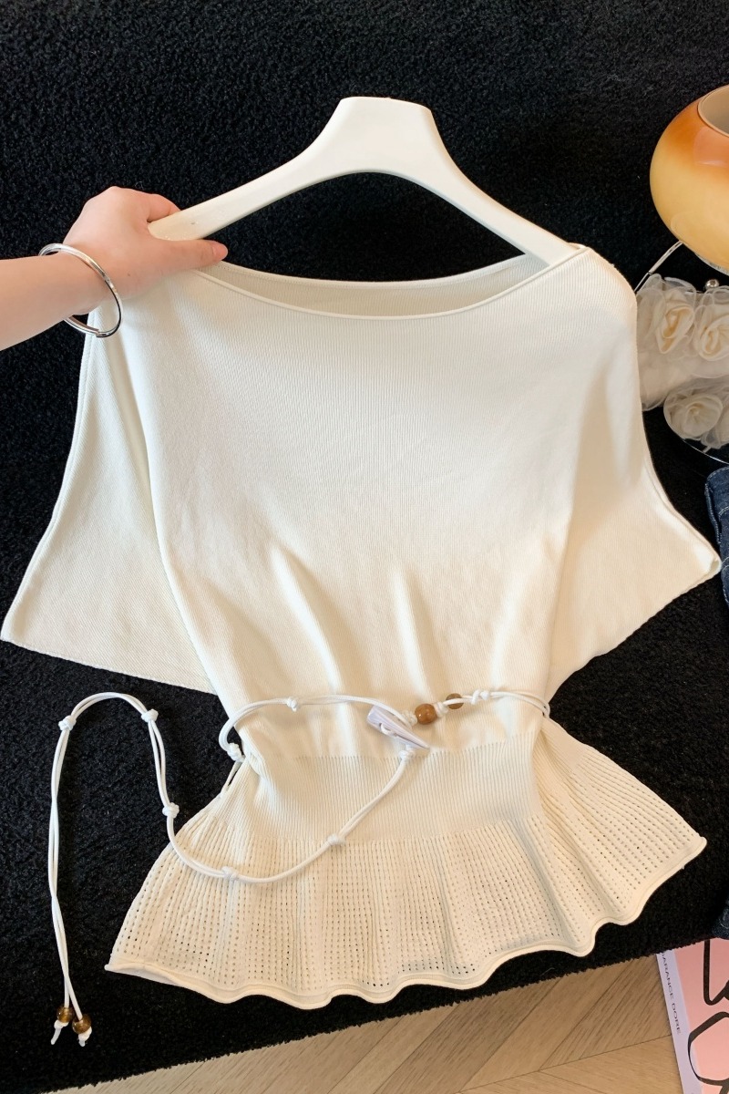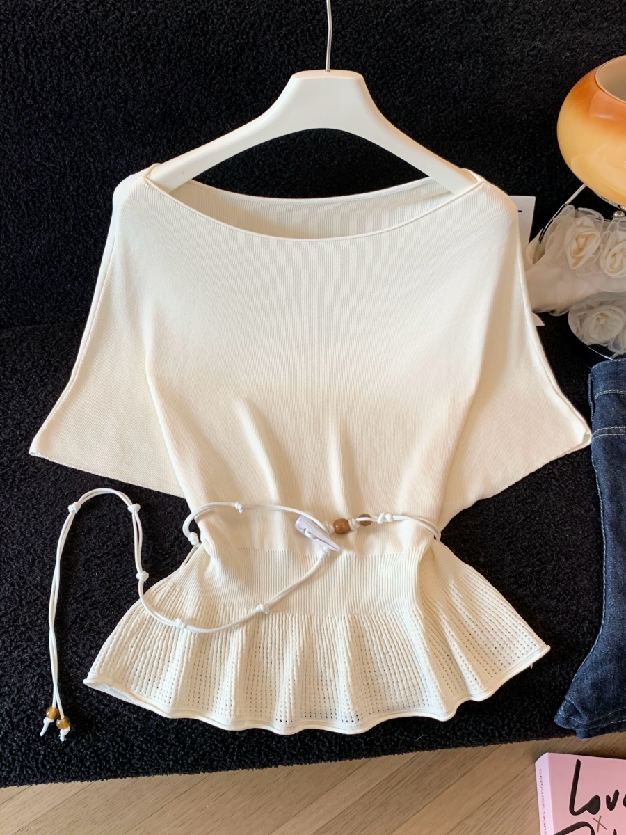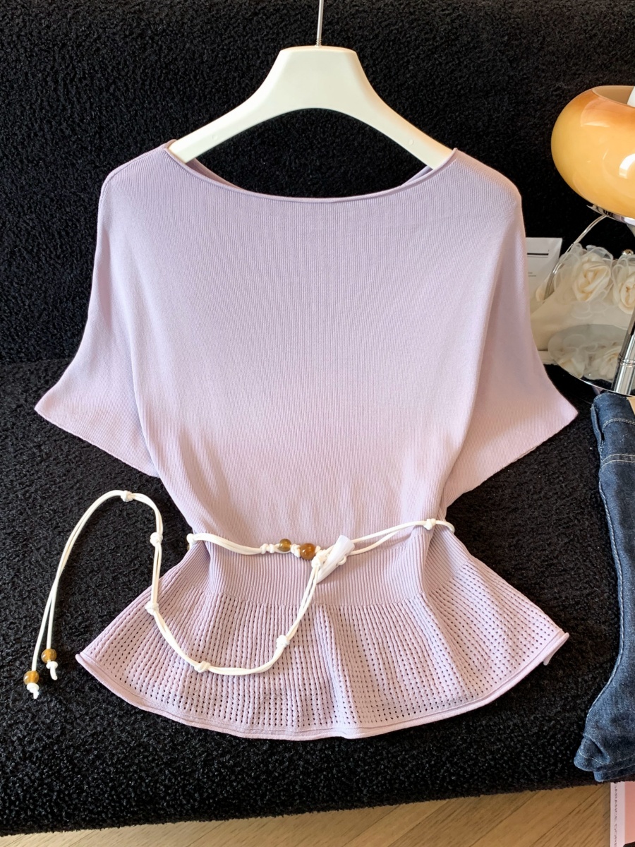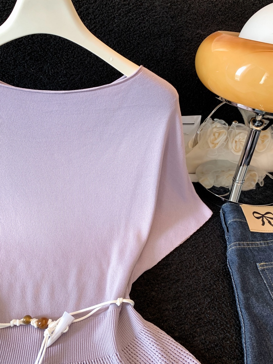실사 한 부서 Chic 연령 감소 배트윙 소매 라운드 넥 오프숄더 니트 느긋한 바람 품격 패션 고급 센스 벨트 포함