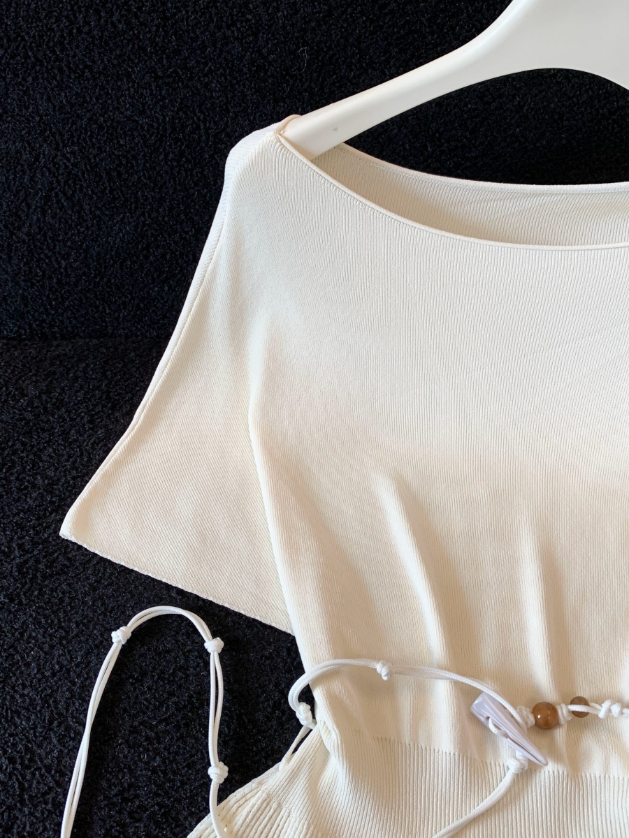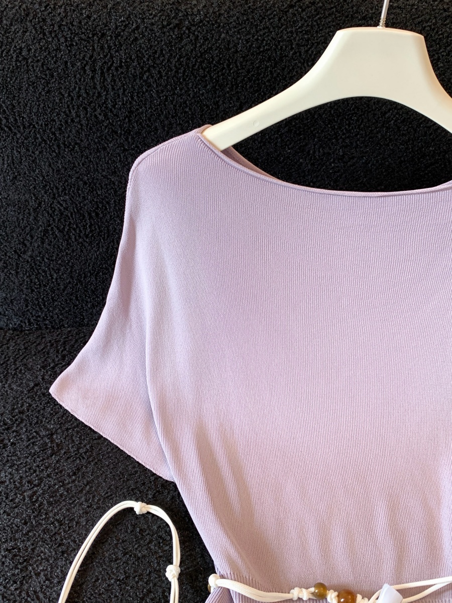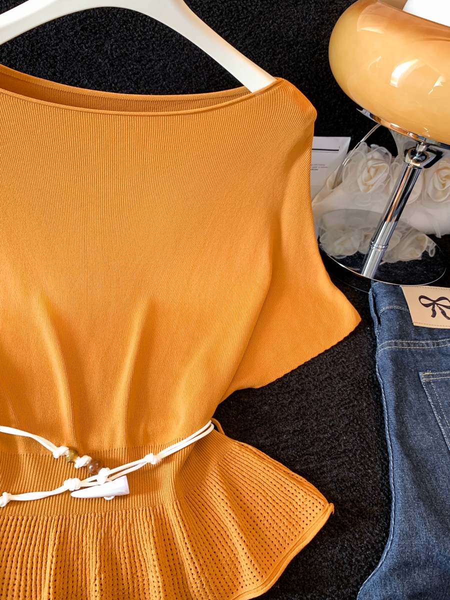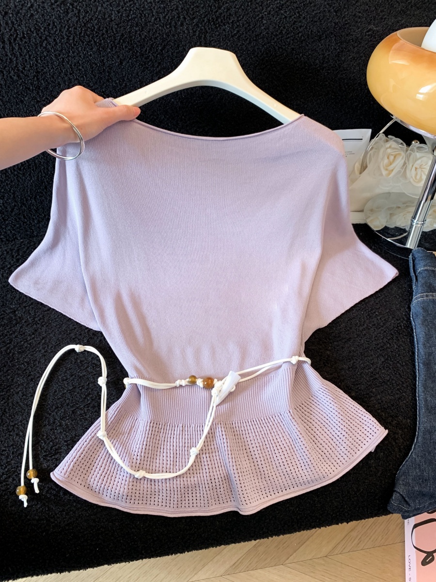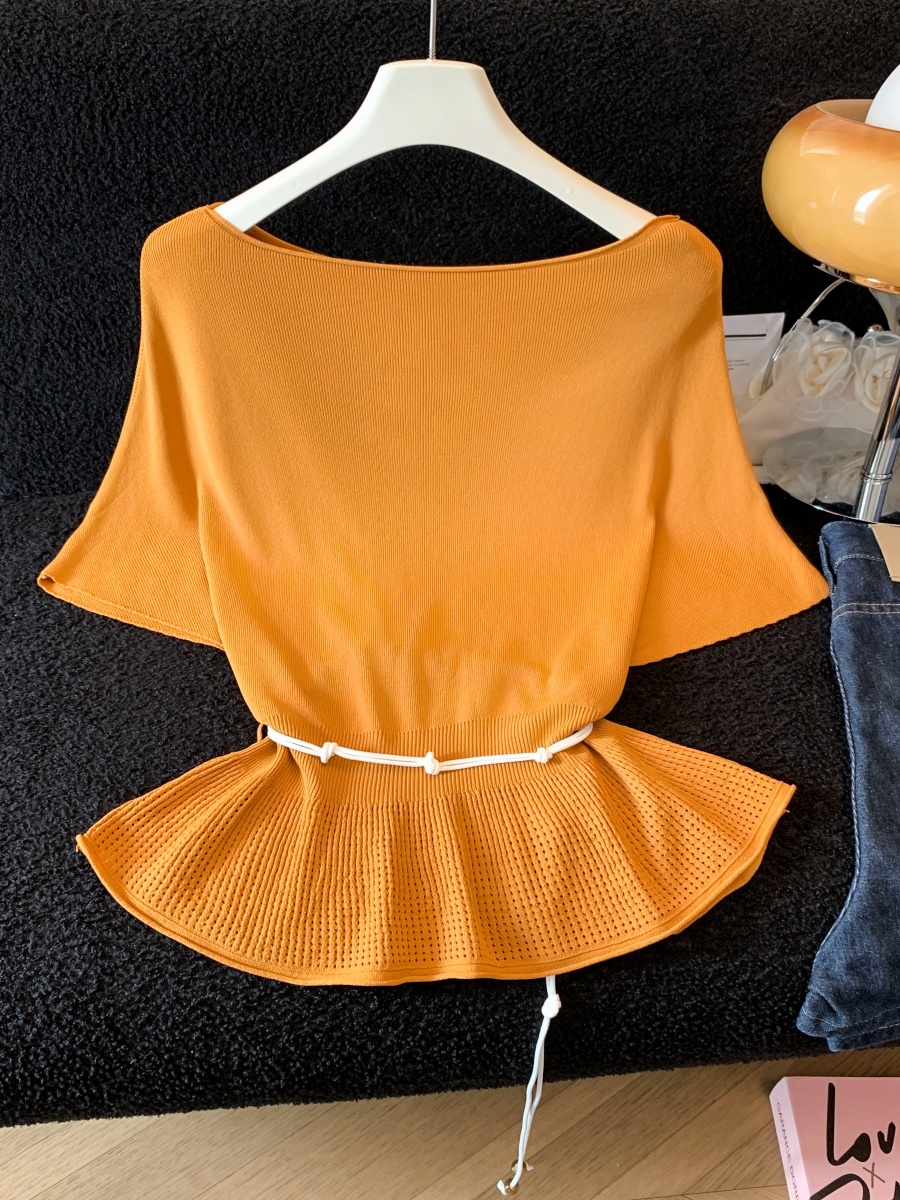 실사 한 부서 Chic 연령 감소 배트윙 소매 라운드 넥 오프숄더 니트 느긋한 바람 품격 패션 고급 센스 벨트 포함