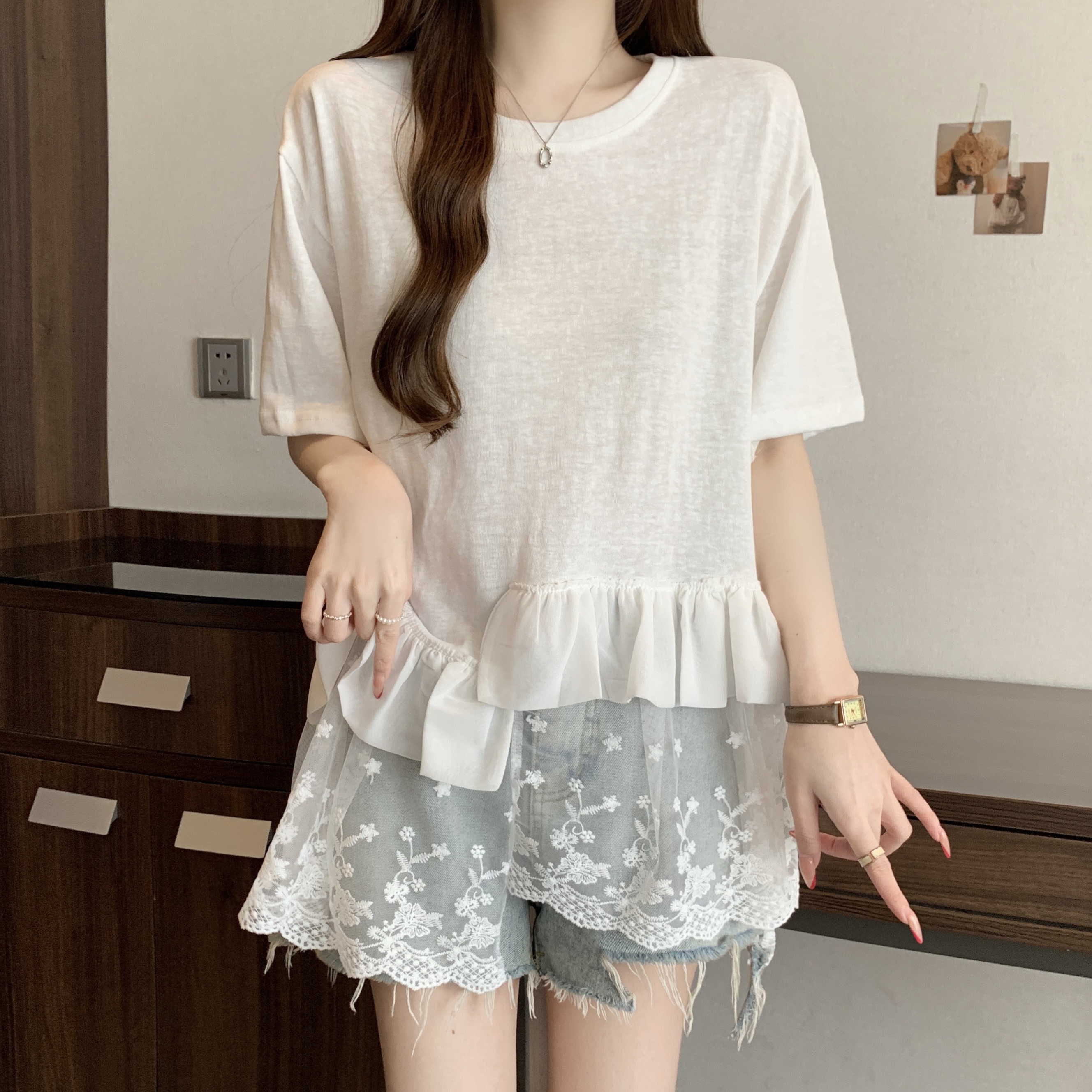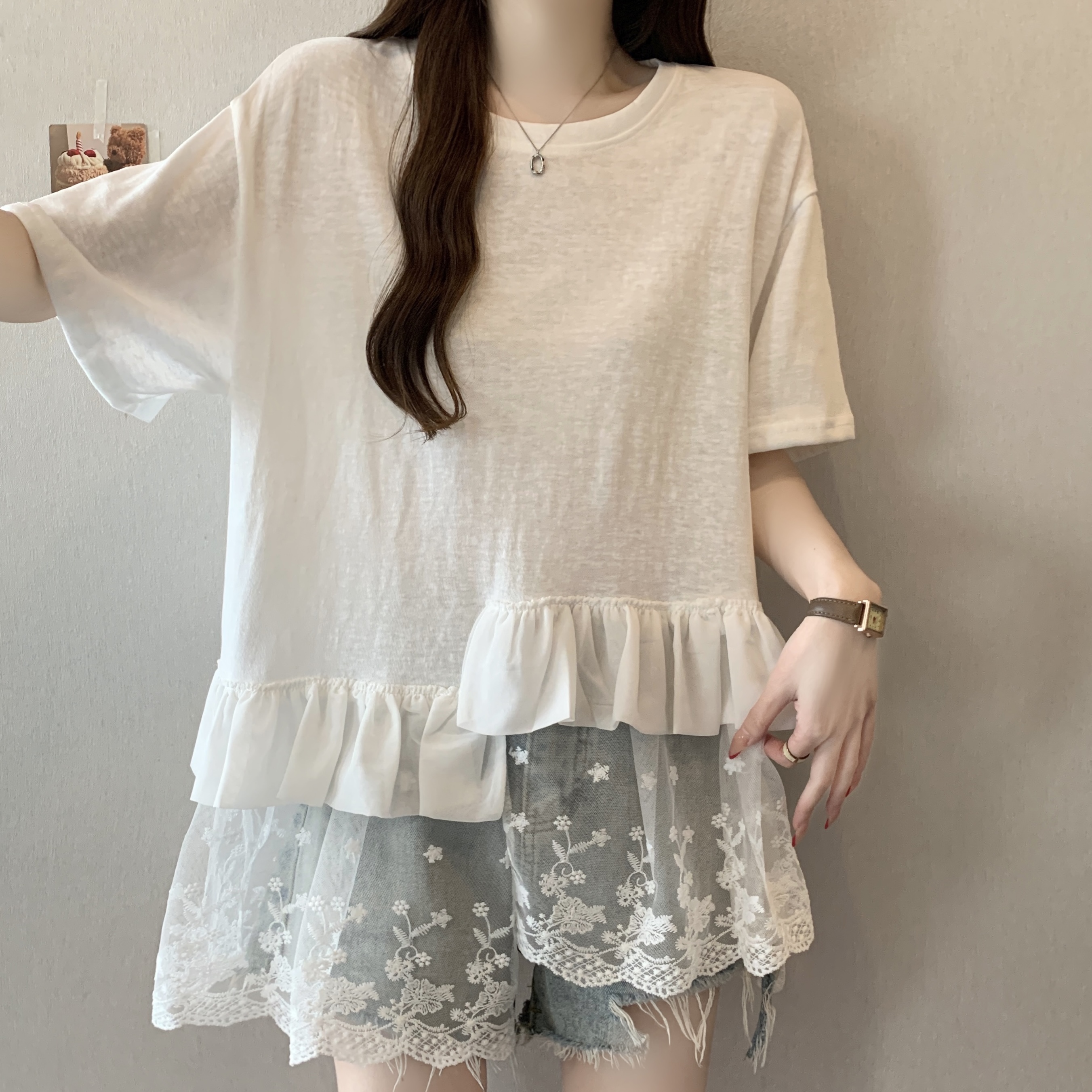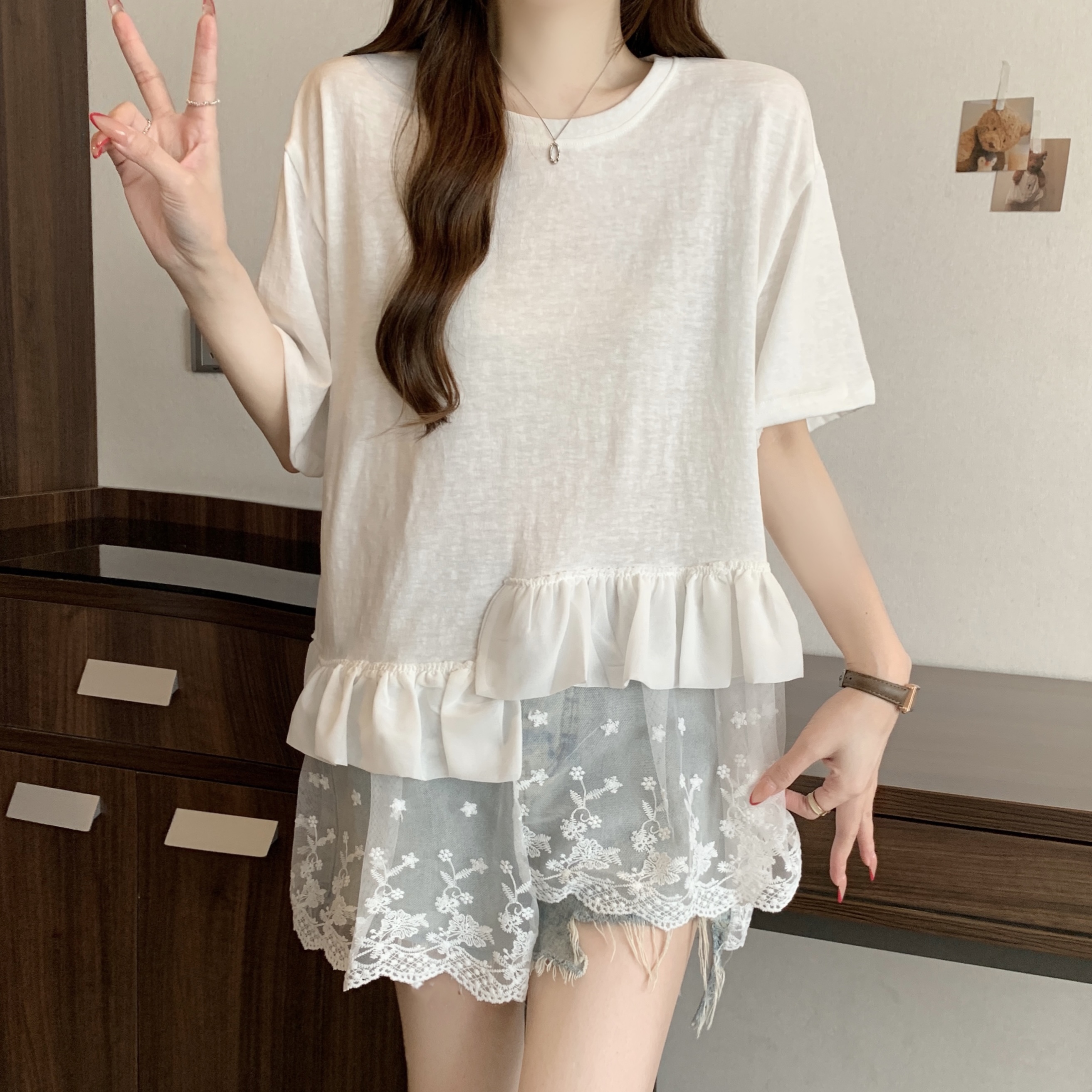 실사 2818# 빅 사이즈 마이크로 지방 캐주얼 작은 대중 화이트 패션 패치워크 레이스 레이스 티셔츠 루즈핏 외국 가스 맨위