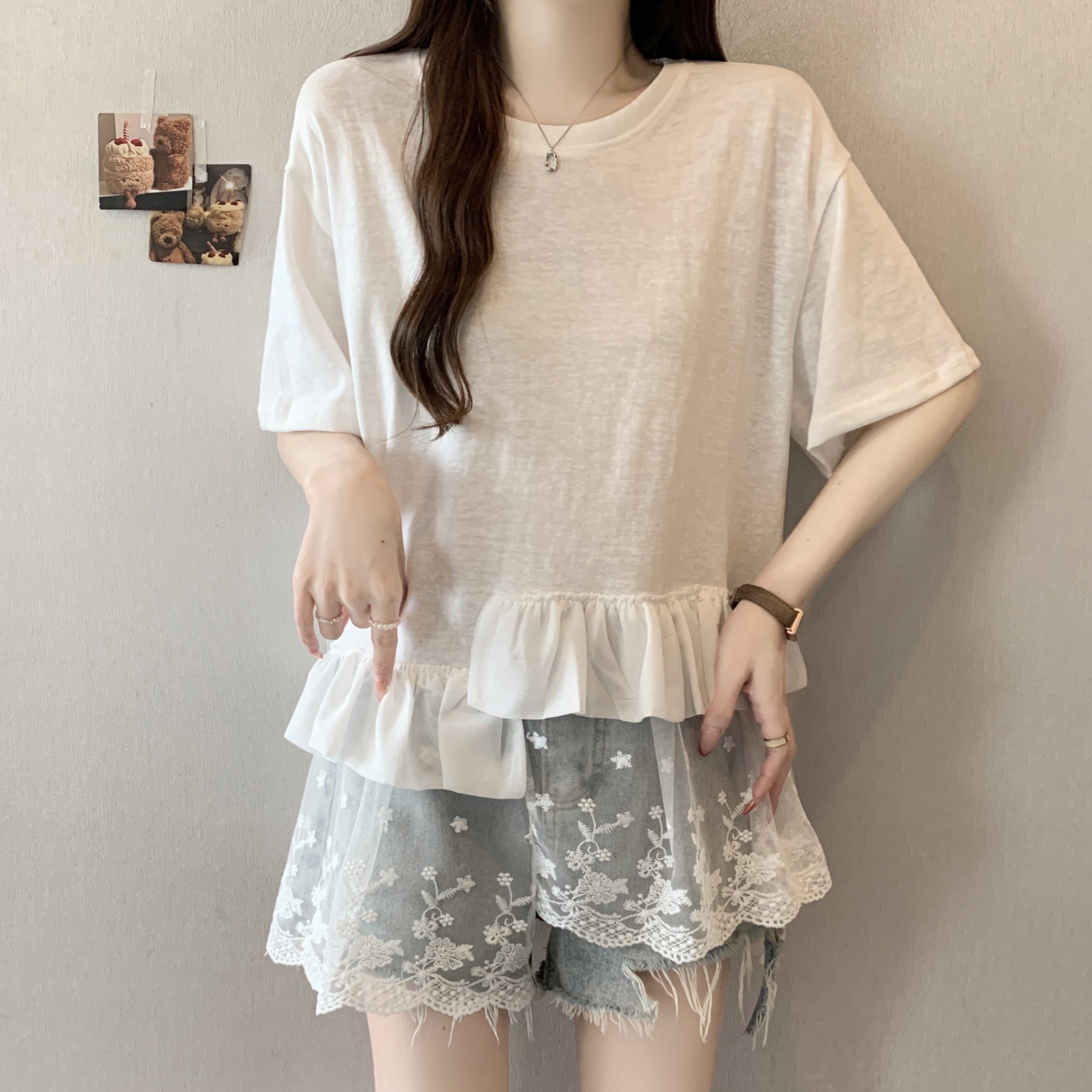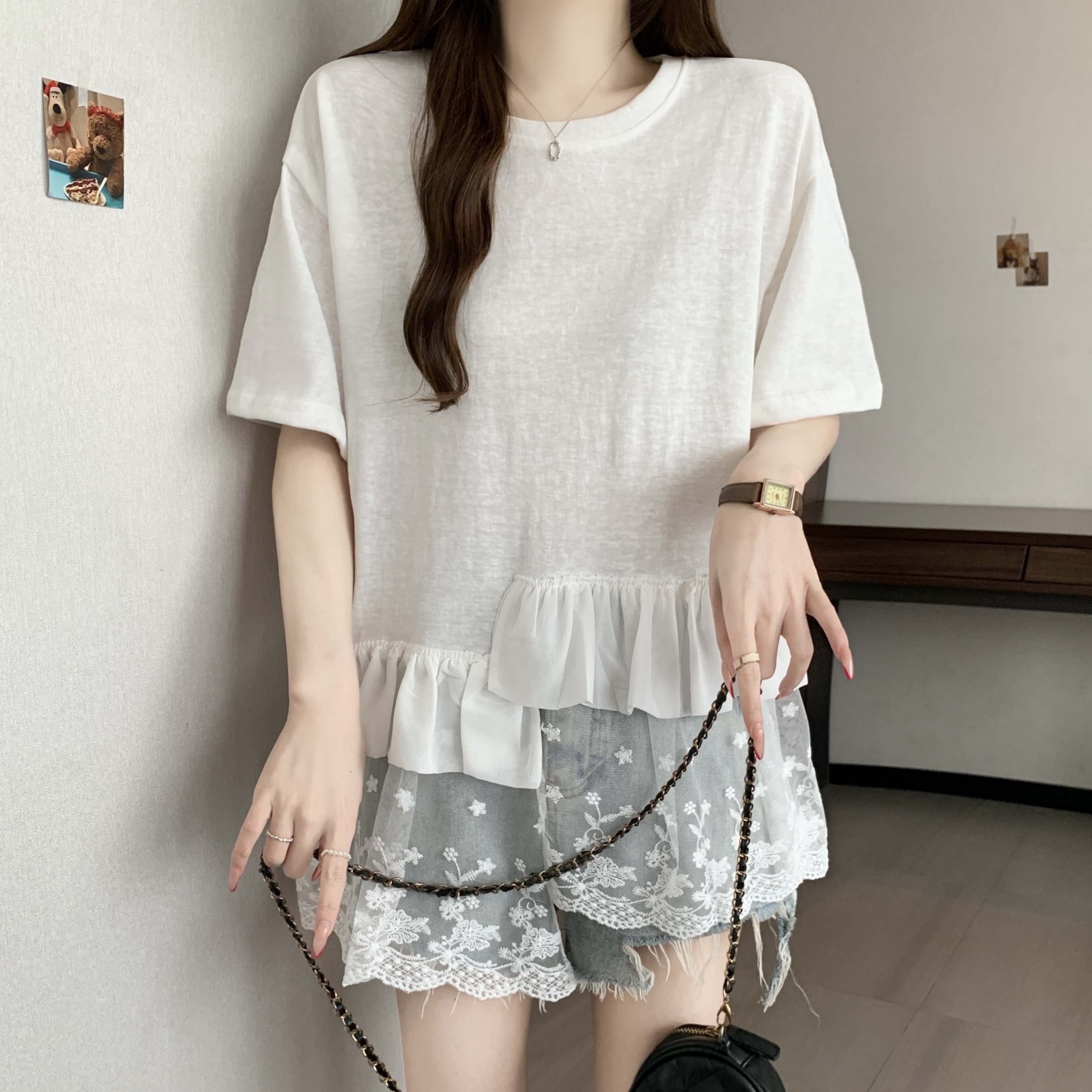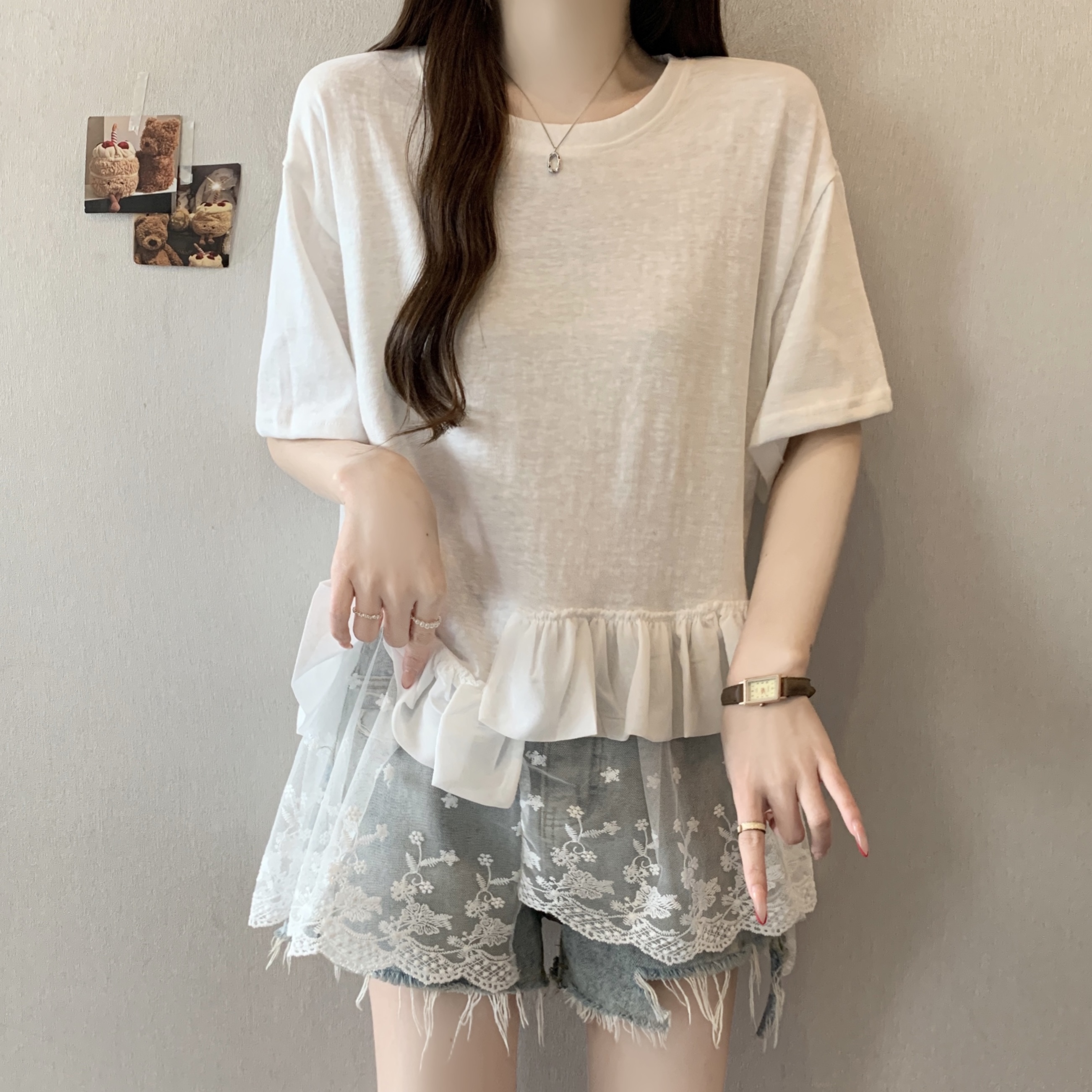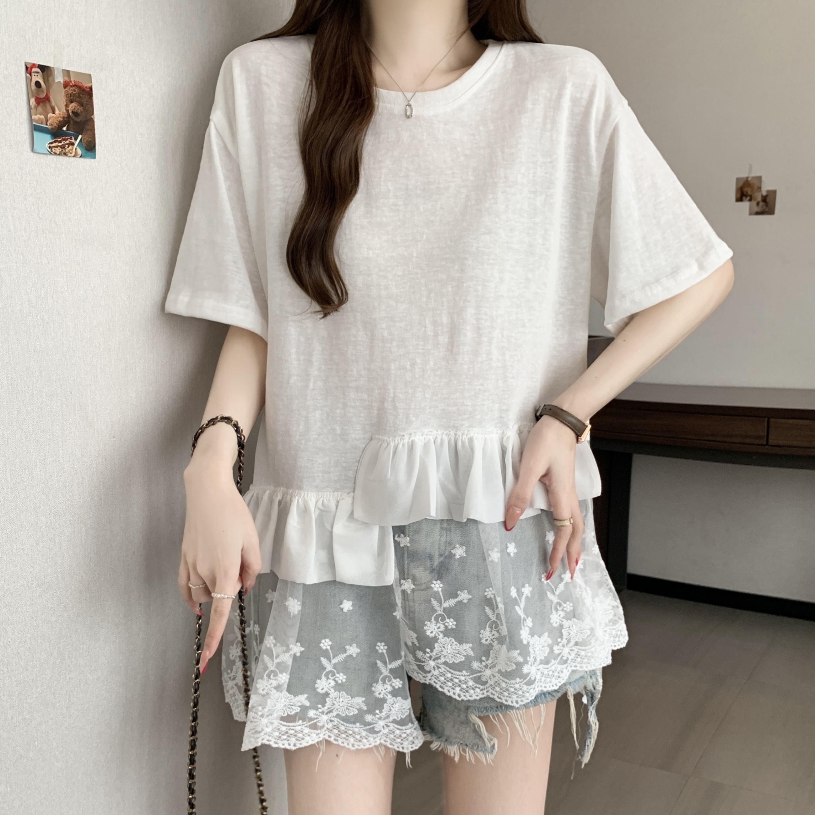 실사 2818# 빅 사이즈 마이크로 지방 캐주얼 작은 대중 화이트 패션 패치워크 레이스 레이스 티셔츠 루즈핏 외국 가스 맨위