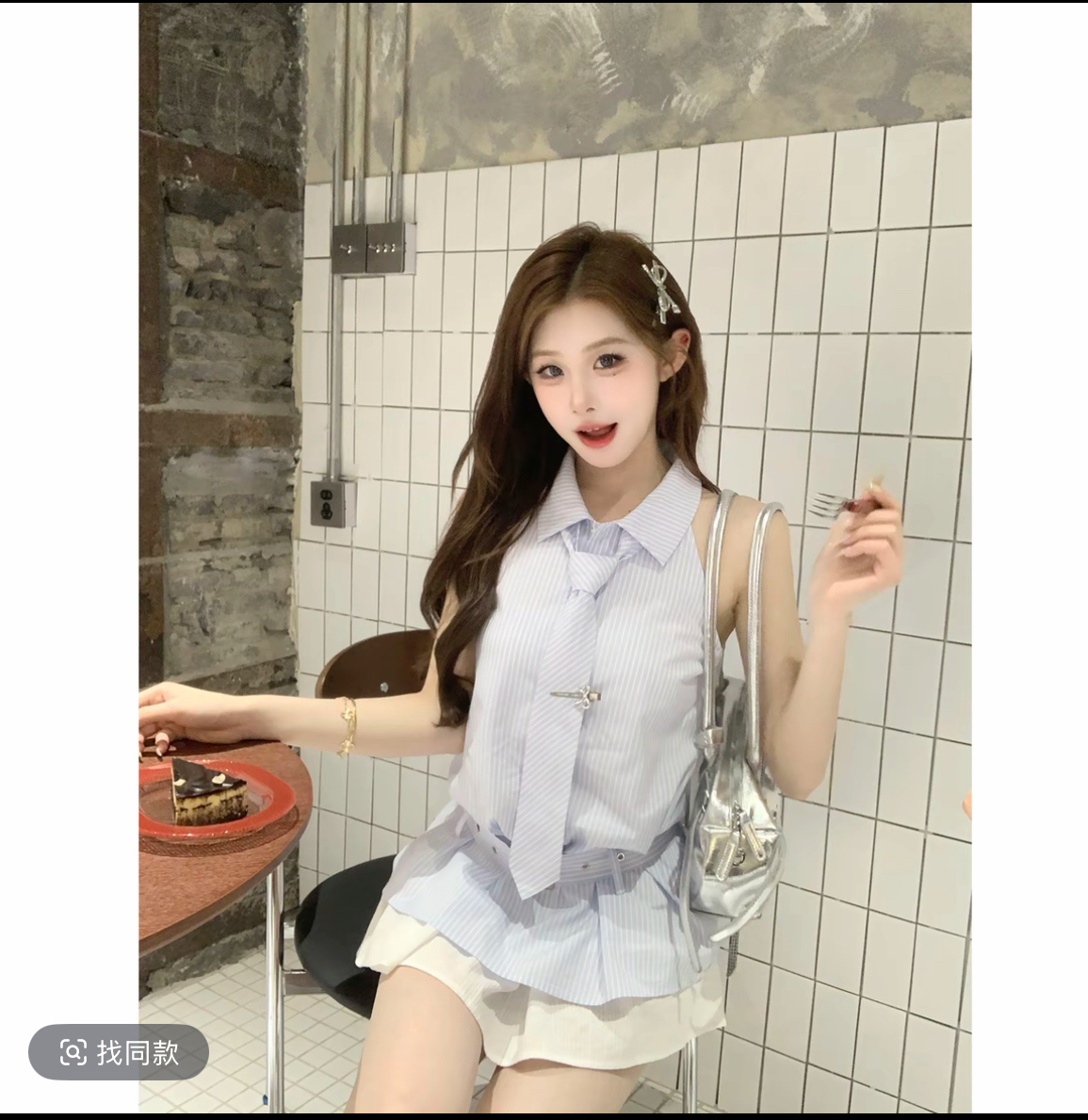 popwest 丨 여름 배색 패치워크 페이크 레이어드 반팔 후드티 오픈 가디건 맨위 재킷 퍼프 반 스커트 세트