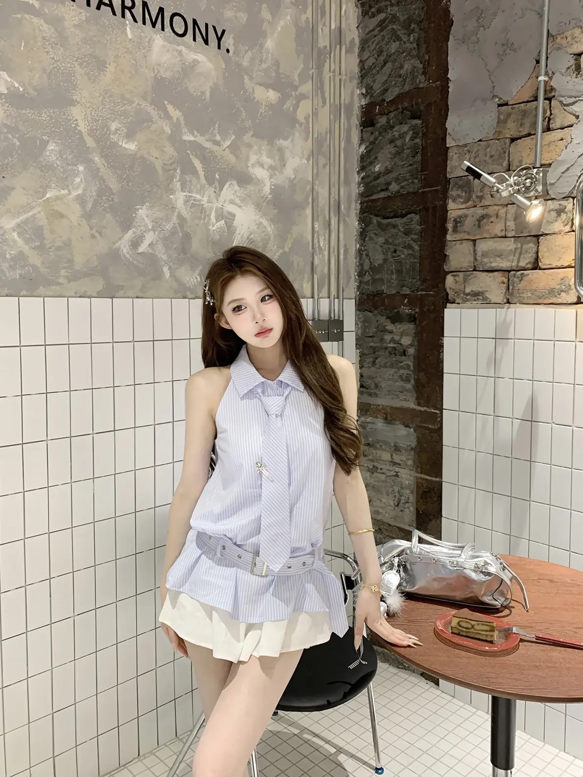popwest 오리지널 학원 스타일 거품 소매 셔츠 드레스 허리 수축 다용도 핫걸 치마 A라인 스커트 미니 스커트