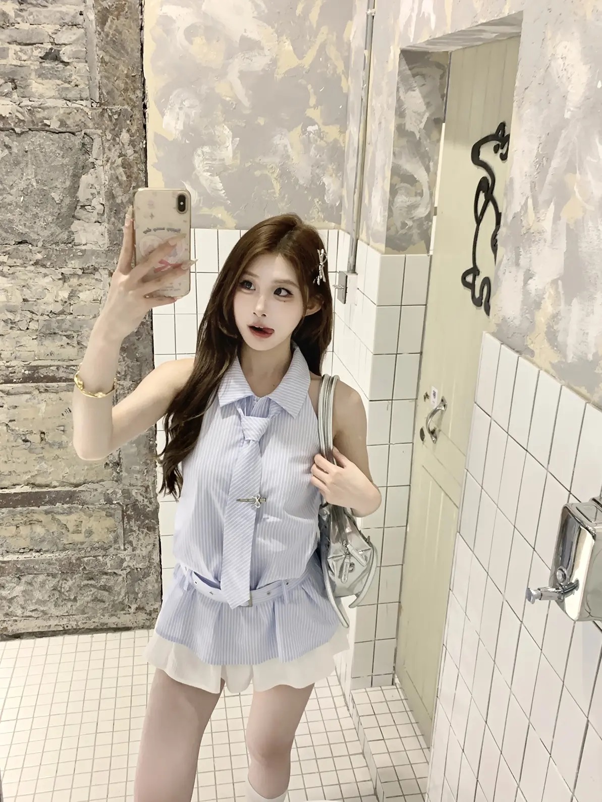 4.3 신제품 westayone 핑크색 여성 셔츠 작은 키 셔츠 고급 센스 유화 프린트 미니 스커트